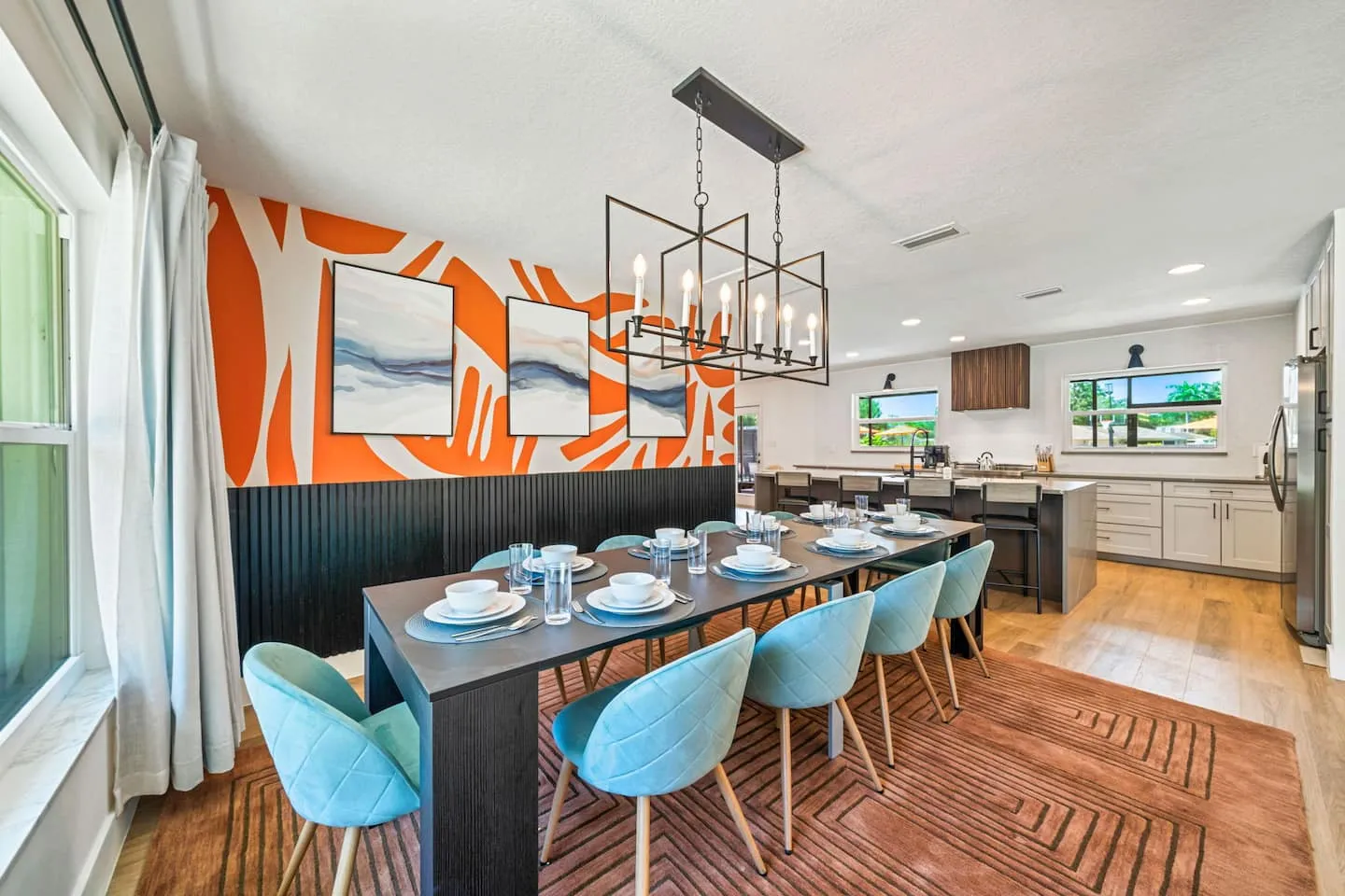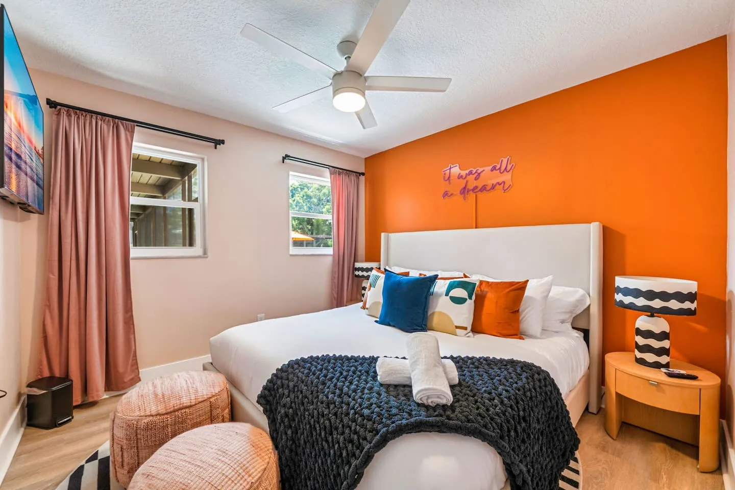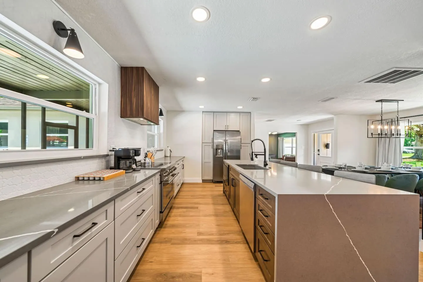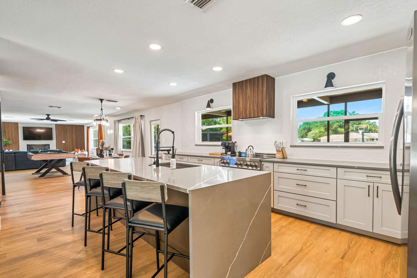 The three king bedroom configuration establishes luxury sleeping for adult guests and primary family units, with the mega bunk room and second bunk room accommodating up to 16 children or teenagers creating clear spatial separation between adult retreat zones and high-energy youth quarters. The 2.5-bathroom distribution includes primary ensuite with shower, main family bathroom with dual sinks, bathtub, water closet, and direct pool deck access creating convenient indoor-outdoor circulation, plus hallway half-bath preventing bedroom bathroom intrusion. The family bathroom's pool deck access represents strategic positioning enabling swimmers to access facilities without tracking water through interior spaces. The kitchen positioning at the home's heart opening to living, dining, and providing patio and pool access creates hub circulation maximizing social connectivity, with comprehensive counter space, storage, and complete cookware inventory supporting large-family meal preparation. The 15-minute proximity to Clearwater Beach establishes convenient Gulf Coast access while the nearly one-acre lot provides suburban setting with substantial privacy buffers and parking capacity for multiple vehicles addressing large group transportation needs.