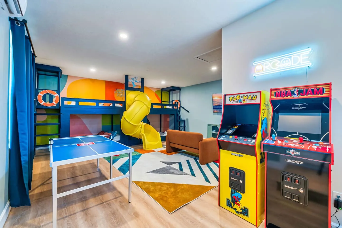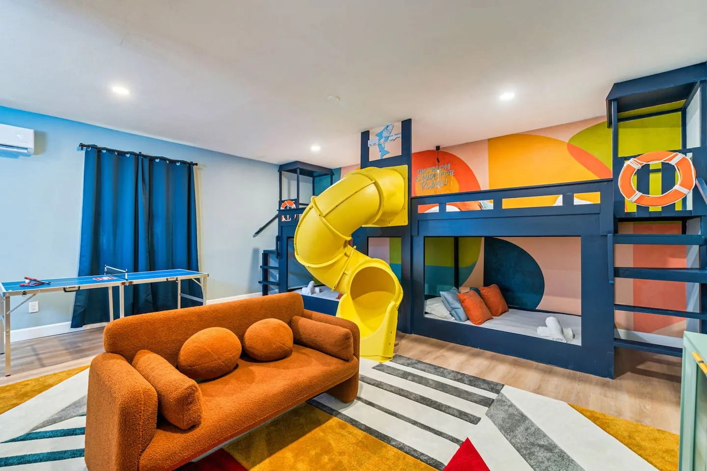 The mega bunk room demonstrates consolidated entertainment programming integrating multiple functions within single dedicated space creating self-contained children's activity complex. The room houses two full-over-full bunk beds accommodating eight sleepers, built-in slide connecting upper bunks to floor creating adventure descent experience, arcade game installations providing electronic entertainment, ping pong table requiring 19-by-10-foot clearance envelope, and couch seating establishing lounge zone for gaming or socializing. This multi-modal programming transforms standard sleeping quarters into comprehensive recreation hub where children and teenagers can sleep, play, compete, and socialize without dispersing activities throughout the main living areas. The slide integration required structural reinforcement of upper bunk assemblies, safe landing zone clearance preventing furniture or wall impacts, material selection for controlled descent speed, and weight capacity specifications. The room's designation as playroom alongside sleeping quarters acknowledges its dual functionality, with the arcade and ping pong equipment remaining accessible during daytime hours when bunks serve as elevated seating or spectator zones. The second bunk room provides additional sleeping capacity with two full-over-full bunks accommodating eight more guests, establishing total bunk capacity of 16 sleepers across the two rooms creating flexibility for large youth groups, multi-family gatherings with numerous children, or extended family reunions.