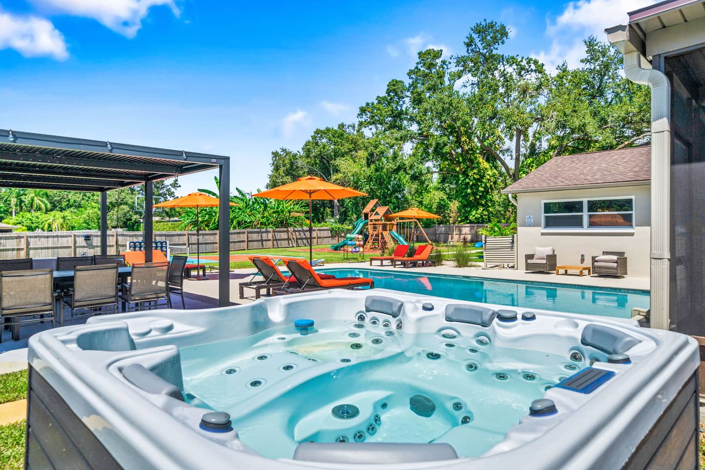Photography documentation emphasized the nine-hole putting green showing multiple holes with flags and undulating terrain demonstrating professional installation quality, lighted basketball/pickleball court at dusk showcasing evening playability, extra-large playground with three slides visible showing commercial-grade scale, mega bunk room staging with slide, arcade machines, ping pong table and couch demonstrating multi-function programming, screened porch interior showing furnished seating and dining, pergola with TV and dining table setup, photo booth installation with ring light and props, shuffleboard table in second living room, pool area with surrounding deck and hot tub, and park-like lawn areas demonstrating landscaping quality. Hosts William and Claudia's responsive communication style (100% response rate within one hour) creates reliable guest experience despite one-month hosting tenure. The perfect 5.0 rating from initial reviews validates the nearly one-acre site development strategy, nine-hole putting green signature installation, mega bunk room consolidated entertainment design, dual covered outdoor living pavilions, lighted athletic court infrastructure, commercial-grade playground scale, photo booth unique amenity, and comprehensive multi-zone programming serving large extended families, multi-generational groups, and friend reunions seeking self-contained resort experience with Clearwater Beach proximity and exceptional outdoor amenity density across the expansive lot.
