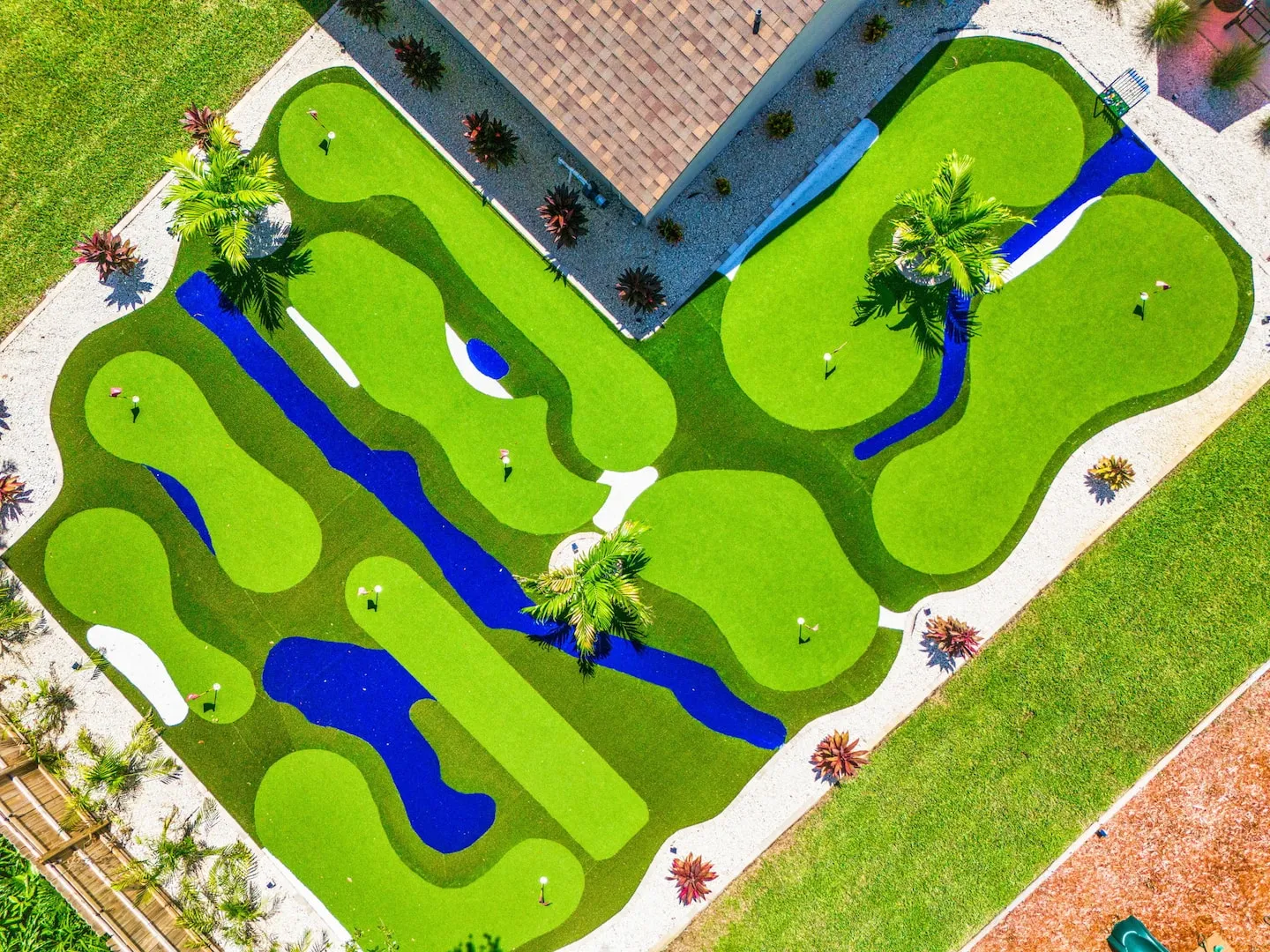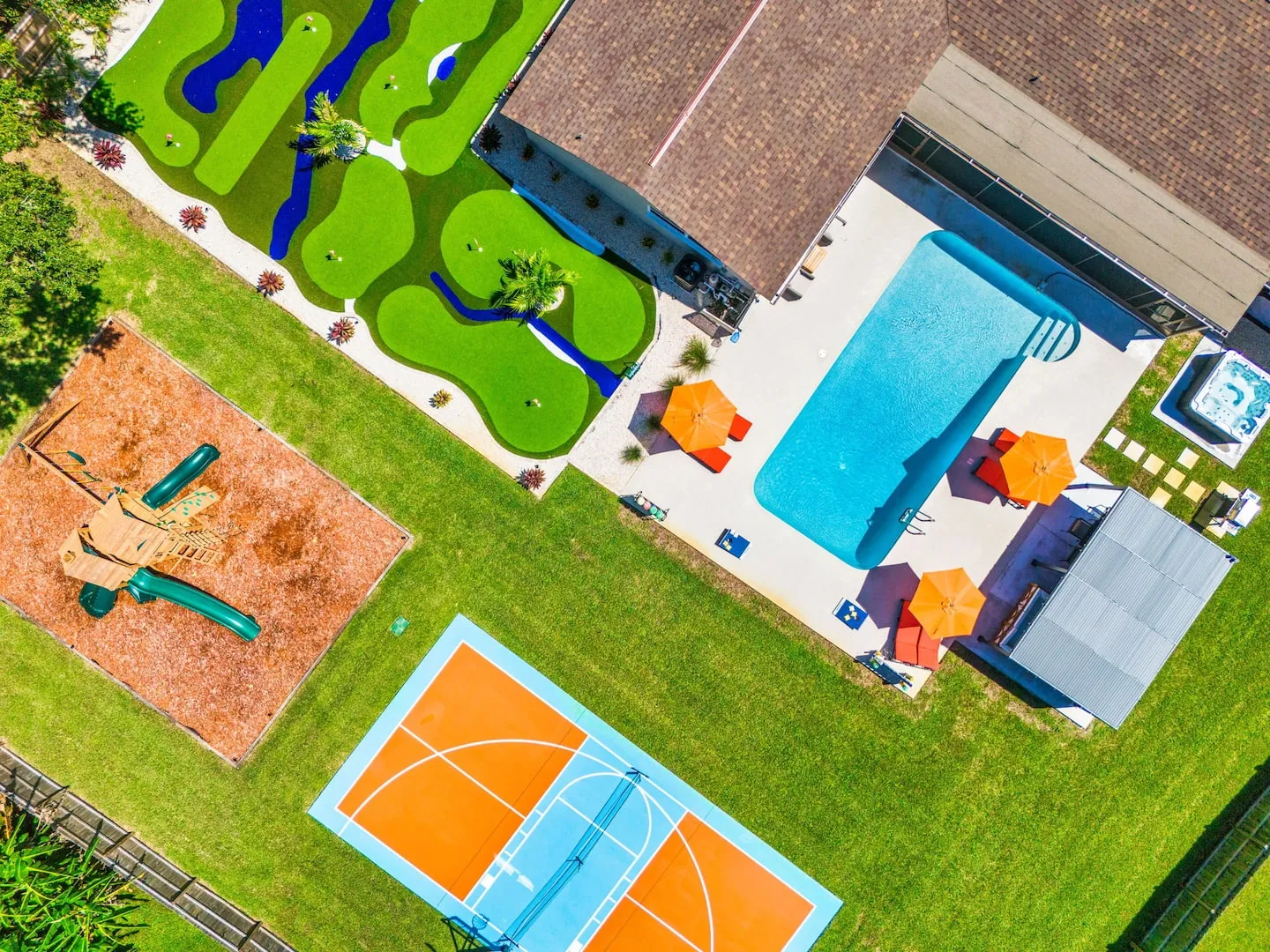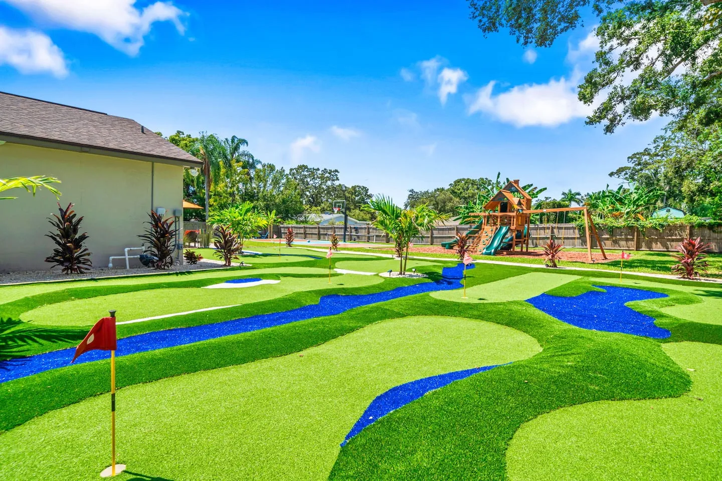 This nearly one-acre Clearwater property demonstrates exceptional site scale achieving perfect 5.0-star rating across initial reviews through comprehensive land development maximizing the expansive lot with signature nine-hole putting green installation representing the largest residential golf feature in Clearwater's vacation rental inventory. The design challenge centered on transforming a sprawling ranch property into multi-zone entertainment campus requiring careful master planning balancing active recreation areas with passive gathering spaces, circulation path design connecting disparate activity zones, landscape architecture creating park-like atmosphere with mature plantings and lush lawn areas, and infrastructure considerations including irrigation systems, lighting networks, and drainage management across the acre footprint. The nine-hole putting green represents significant landscaping investment requiring professional-grade synthetic turf or bentgrass installation, undulating terrain with breaks and elevation changes creating authentic putting challenges, strategic hole placement utilizing the available space efficiently, and ongoing maintenance protocols preserving playing surface quality. Guest reviews specifically reference the golf feature alongside basketball and swimming as primary activities, validating the putting green as signature amenity differentiating this property from standard vacation rentals with generic yard spaces.