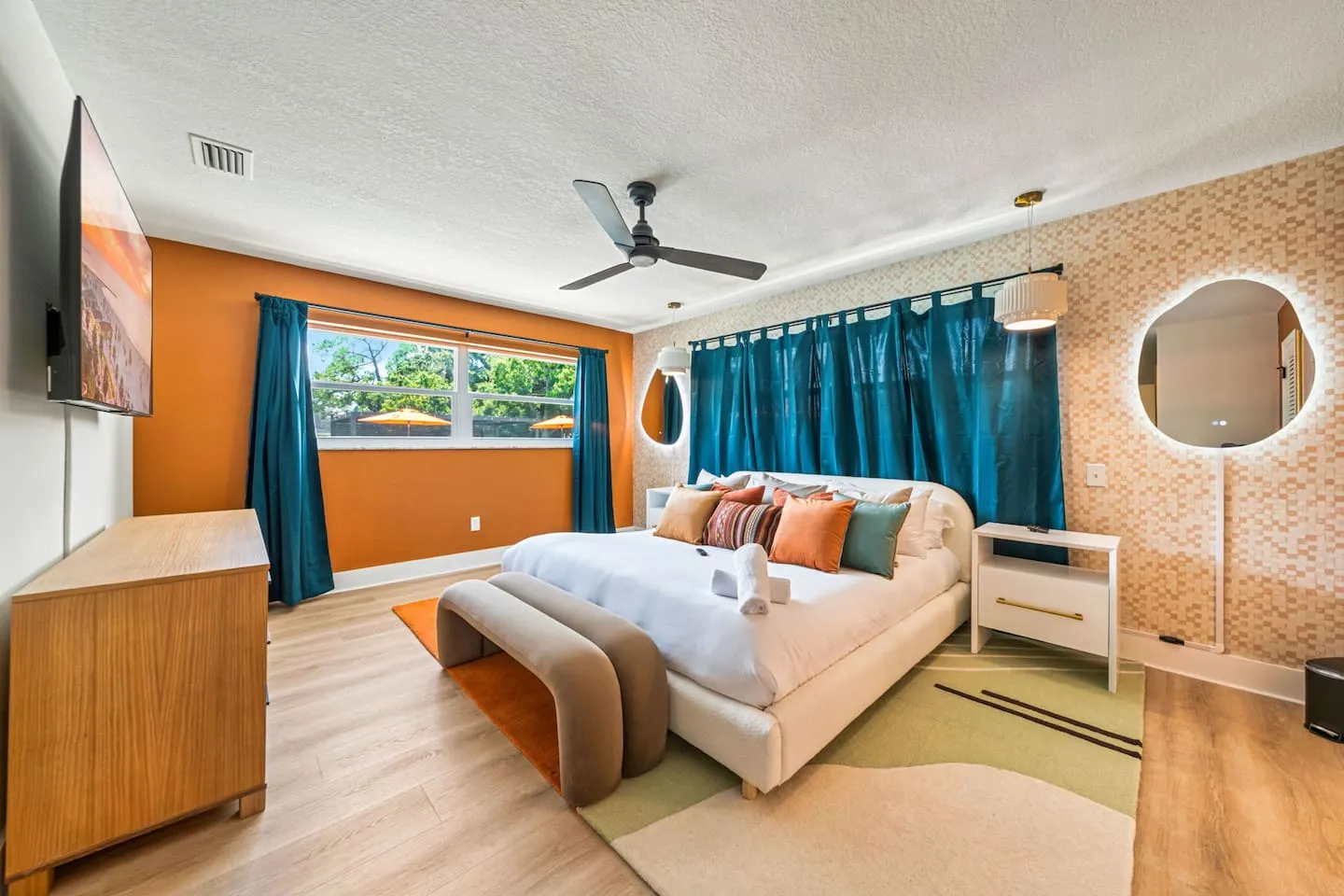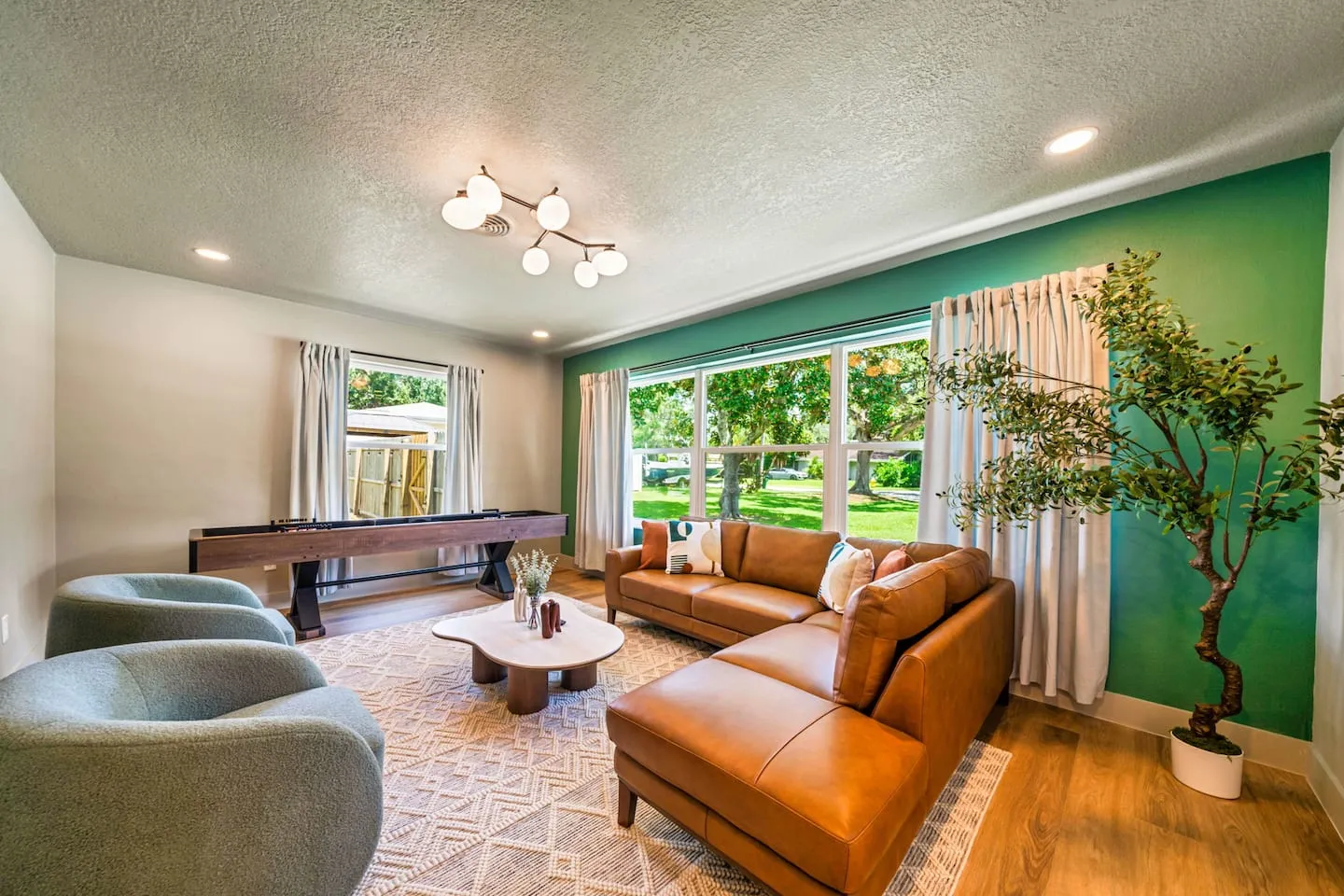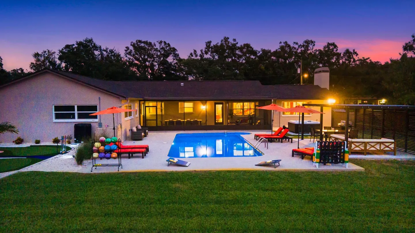 This nearly one-acre Clearwater property demonstrates exceptional site scale achieving perfect 5.0-star rating across initial reviews through comprehensive land development maximizing the expansive lot with signature nine-hole putting green installation representing the largest residential golf feature in Clearwater's vacation rental inventory. The design challenge centered on transforming a sprawling ranch property into multi-zone entertainment campus requiring careful master planning balancing active recreation areas with passive gathering spaces, circulation path design connecting disparate activity zones, landscape architecture creating park-like atmosphere with mature plantings and lush lawn areas, and infrastructure considerations including irrigation systems, lighting networks, and drainage management across the acre footprint. The nine-hole putting green represents significant landscaping investment requiring professional-grade synthetic turf or bentgrass installation, undulating terrain with breaks and elevation changes creating authentic putting challenges, strategic hole placement utilizing the available space efficiently, and ongoing maintenance protocols preserving playing surface quality. Guest reviews specifically reference the golf feature alongside basketball and swimming as primary activities, validating the putting green as signature amenity differentiating this property from standard vacation rentals with generic yard spaces.