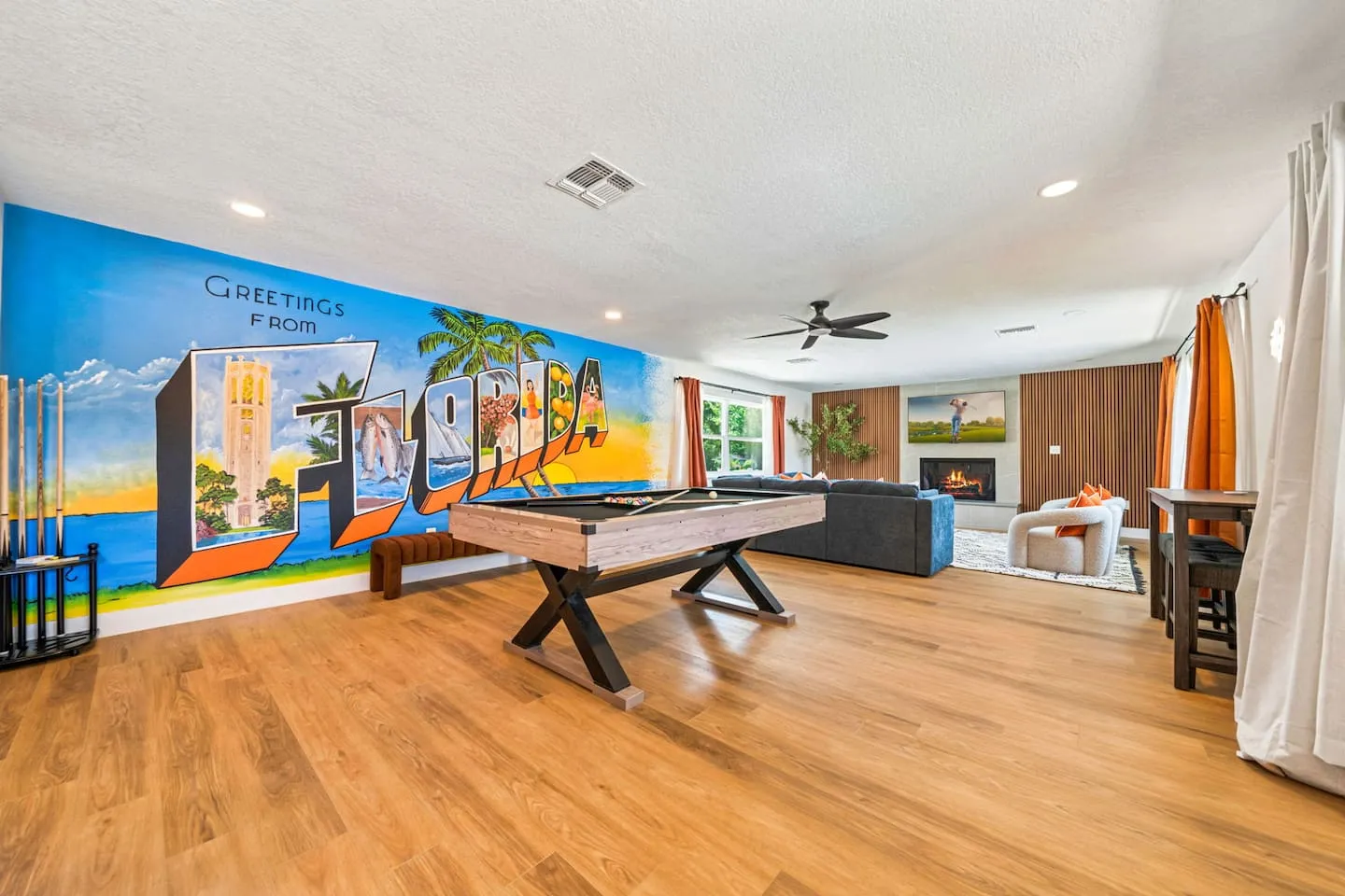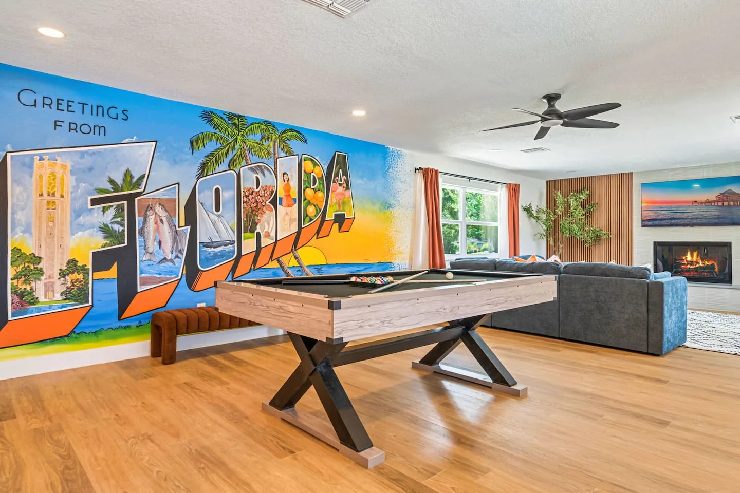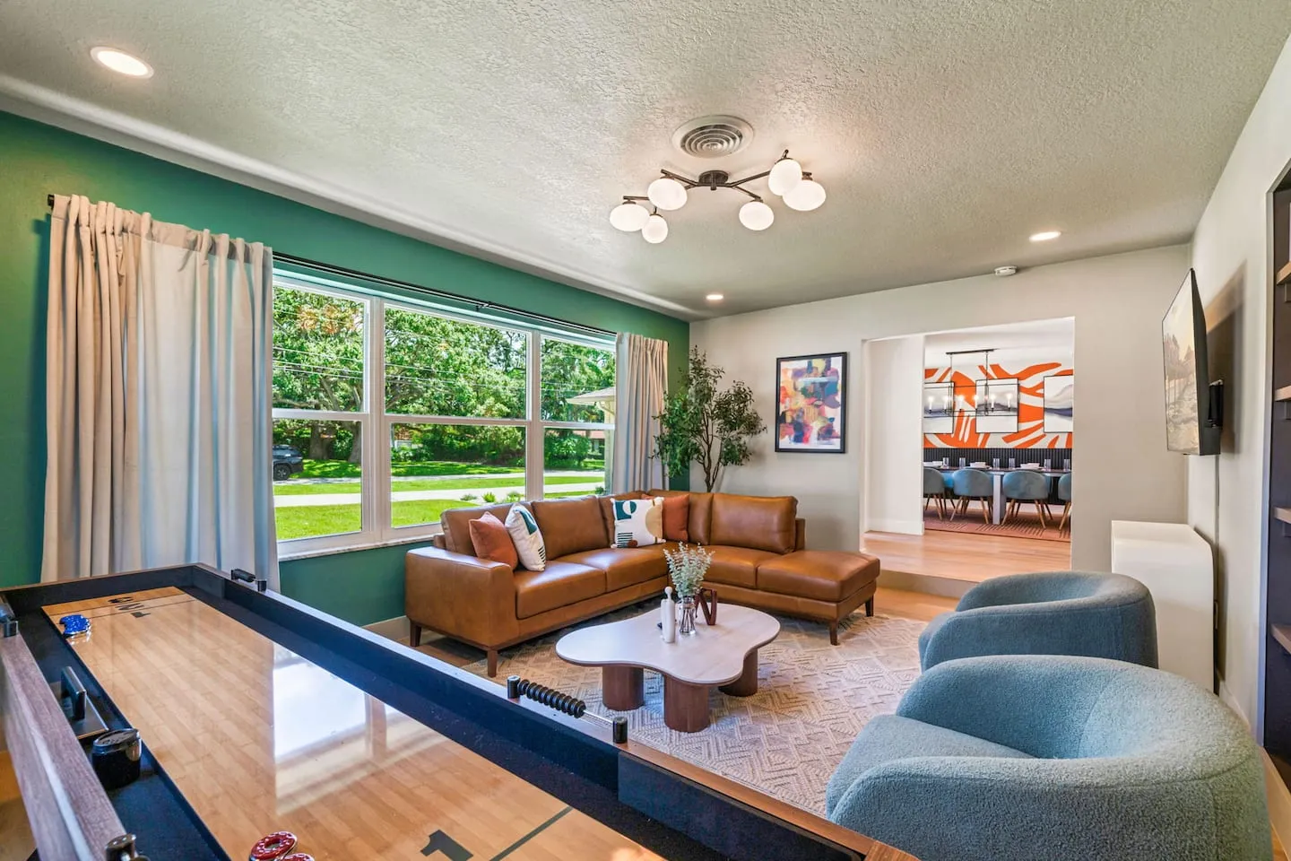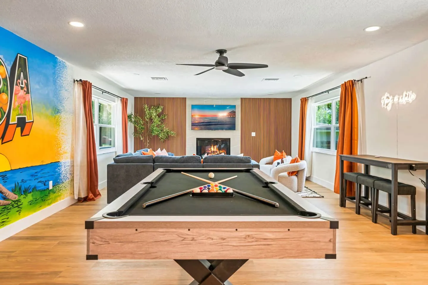 The interior spatial programming features dual living room strategy separating activities and age groups. The main living room anchors around large smart TV with ample seating accommodating whole-family viewing plus integrated pool table enabling simultaneous activities. The second living room provides alternative gathering space with sofa, smart TV, board game storage, and shuffleboard table creating game-focused social zone. The shuffleboard installation represents nostalgic recreation appealing to adults seeking classic bar-style entertainment, requiring 22-foot length for regulation play creating substantial space commitment. The formal dining room opens to kitchen establishing traditional meal service zone, while breakfast table position opening to both kitchen and living room creates casual dining alternative, with kitchen island counter seating adding flexible capacity. This distributed dining strategy across three interior zones plus two exterior tables prevents single chokepoint during meal service for 16-plus guests. The photo booth installation represents unique amenity featuring extra-large ring light with Bluetooth and remote control plus photo props, creating designated space for group photography rather than improvised selfie attempts. This represents thoughtful hosting touch recognizing guests' desire for quality vacation documentation.