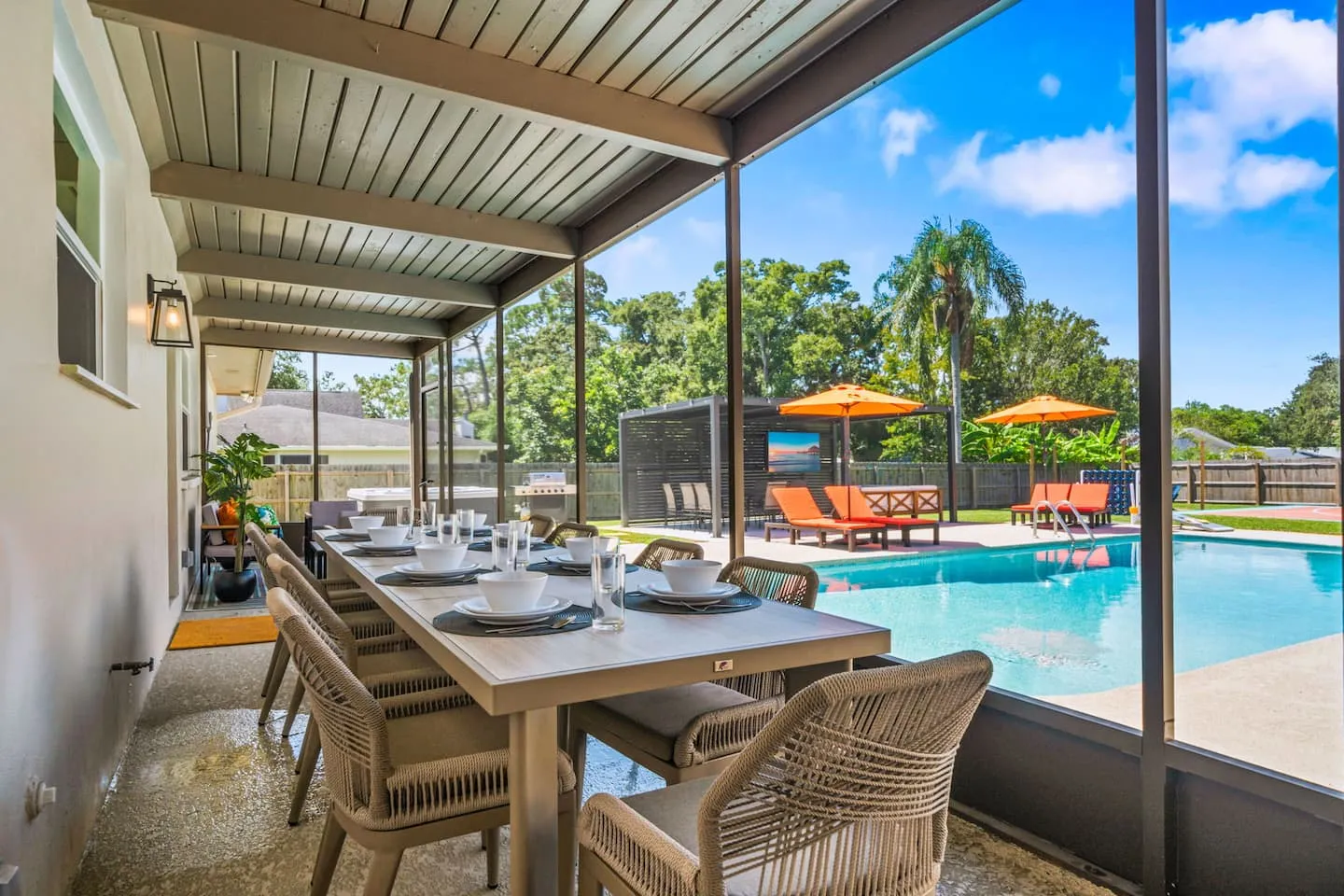 The dual covered outdoor living strategy demonstrates sophisticated climate-responsive design addressing Florida's intense sun and sudden afternoon thunderstorms. The screened-in covered porch provides insect-free outdoor lounging with seating and dining configurations plus direct access to the family bathroom, creating semi-outdoor living room with weather protection and pest control. The separate covered pergola installation establishes second outdoor zone featuring sofa seating, smart TV enabling outdoor viewing, and dining table creating al fresco entertainment area. This dual-pavilion approach prevents bottlenecks during large gatherings by distributing outdoor seating across multiple zones with distinct characters, the screened porch offering maximum weather and insect protection while the open pergola provides greater visual connection to pool and lawn areas. The two outdoor dining tables referenced in listings create substantial al fresco meal capacity complementing the indoor dining configurations, with the propane gas grill positioned for convenient outdoor cooking access.