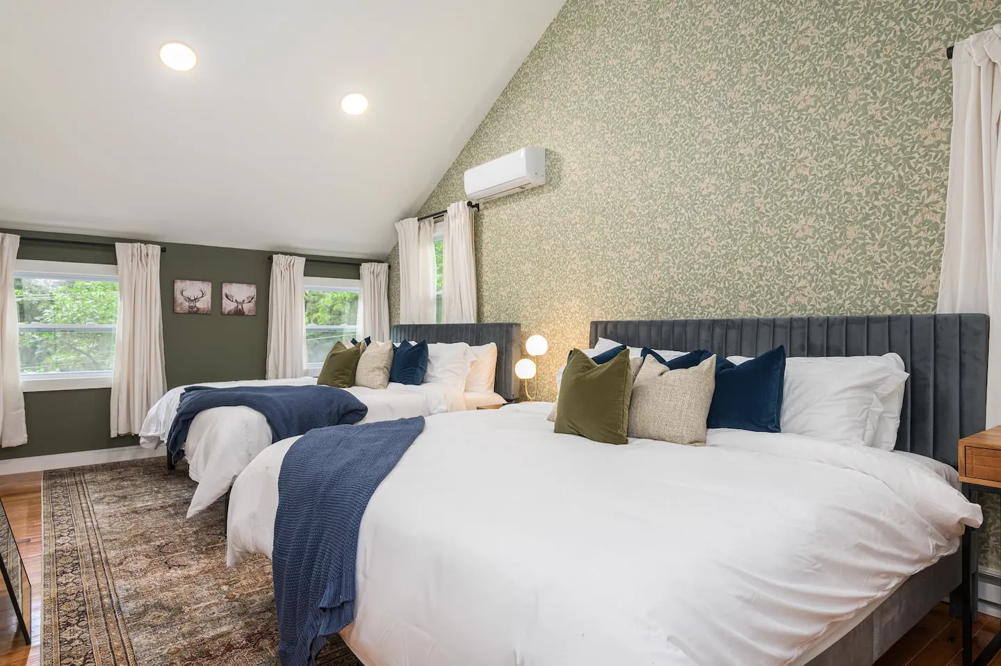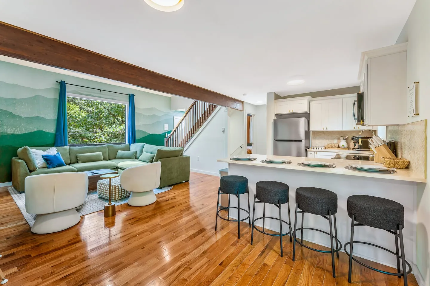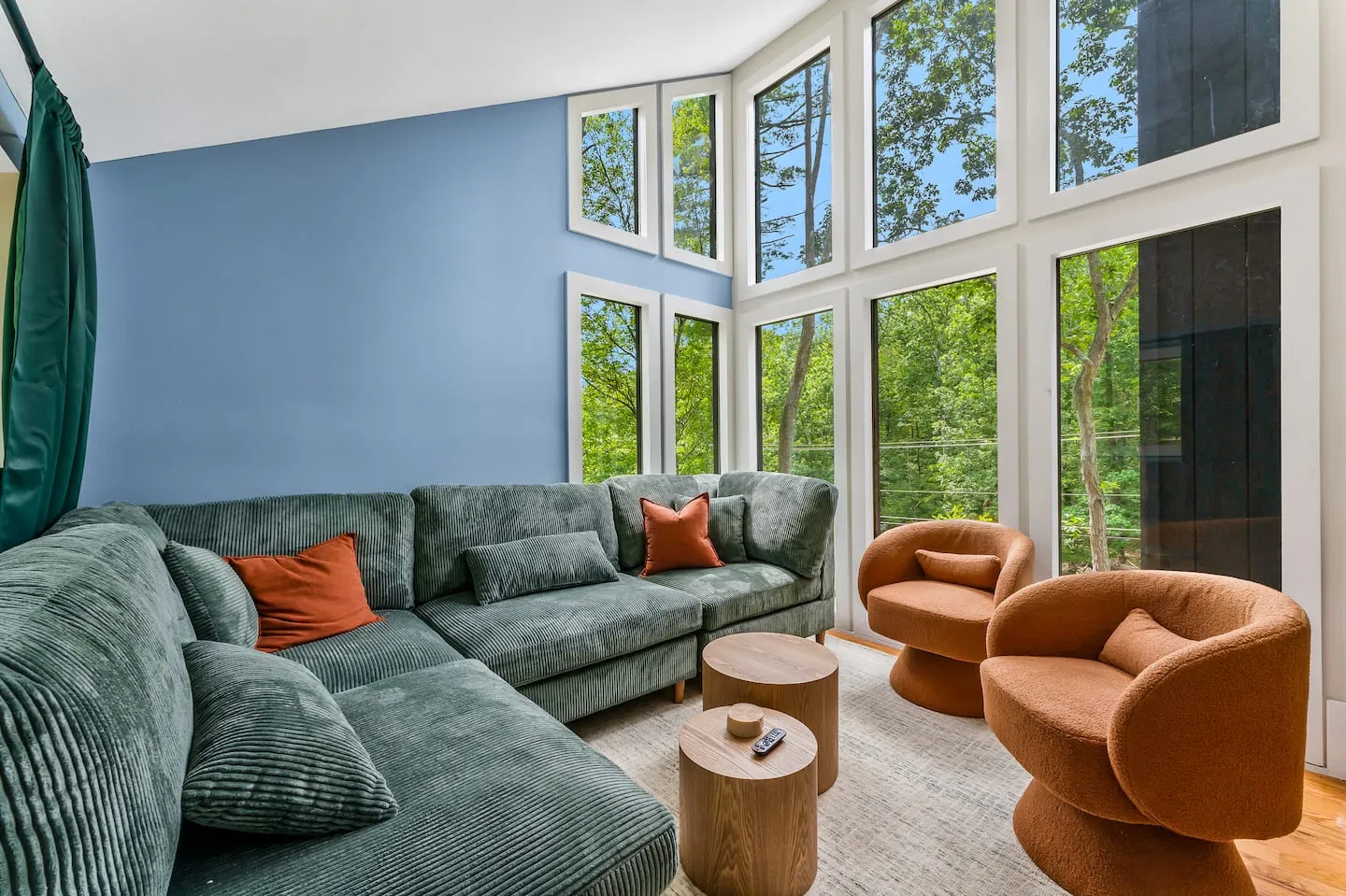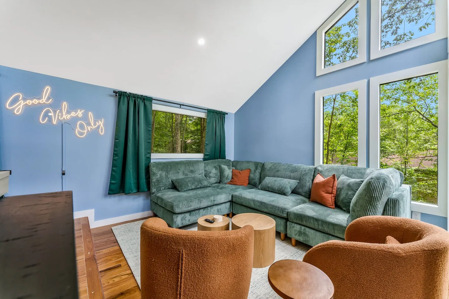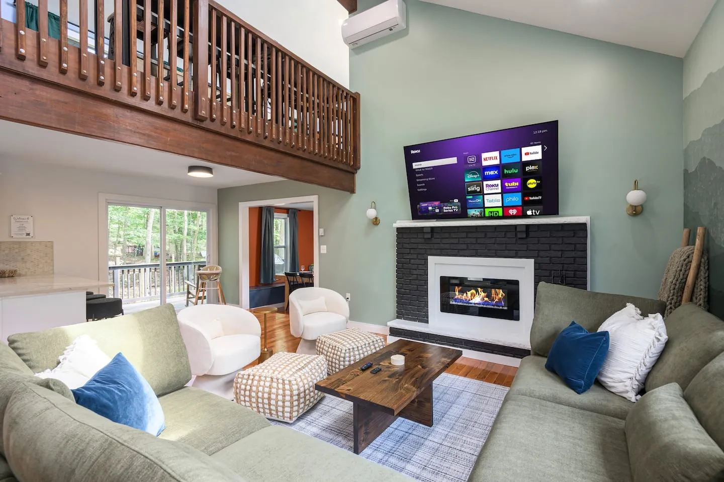 This East Stroudsburg property demonstrates comprehensive renovation excellence earning perfect 5.0-star rating across 20 reviews through architectural enhancement emphasizing natural light and forest connectivity via floor-to-ceiling windows throughout the main living spaces. The design challenge centered on transforming a standard Penn Estates community home into a distinctive forest retreat where dramatic glazing creates seamless visual connection to surrounding woodland while maintaining year-round comfort through brand-new mini-split climate control systems addressing both summer cooling and winter heating demands. The floor-to-ceiling window installation required structural considerations reinforcing wall systems to support expansive glass spans, careful solar orientation managing heat gain and glare, and high-performance glazing specifications preventing condensation and energy loss during Poconos winter conditions. This architectural gesture transforms the interior experience from enclosed cabin to forest pavilion, with guest reviews consistently praising the natural light quality and immersive woodland views.