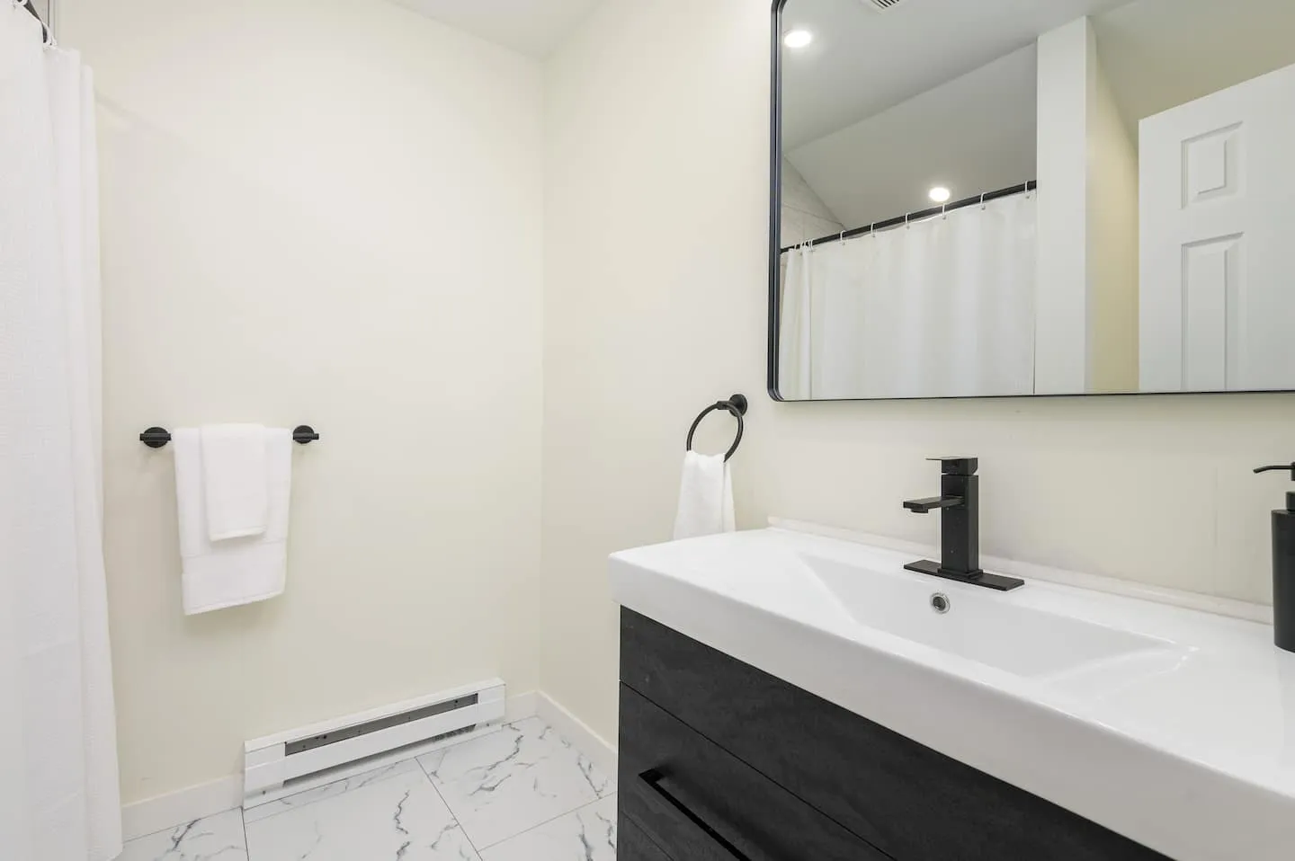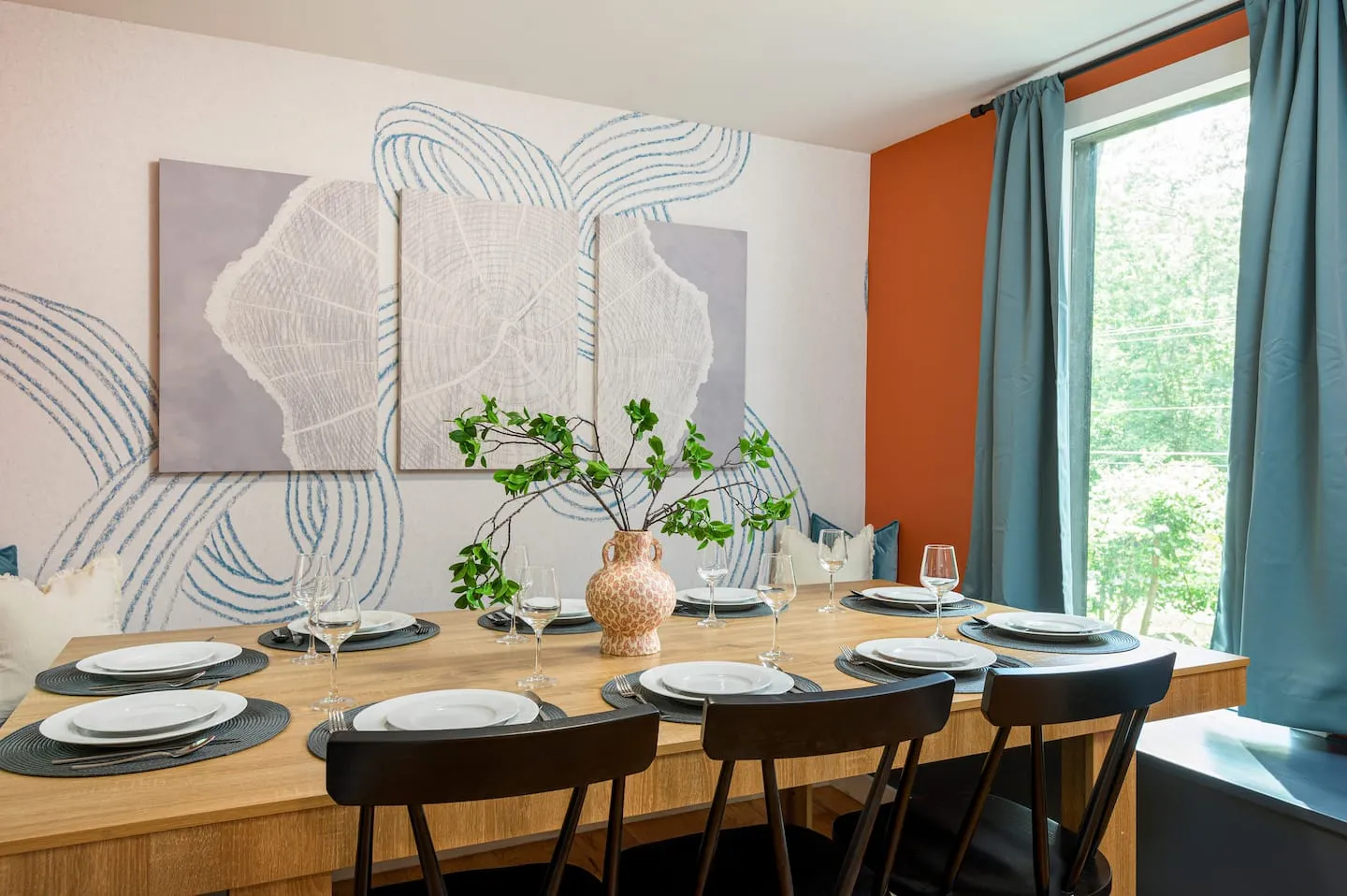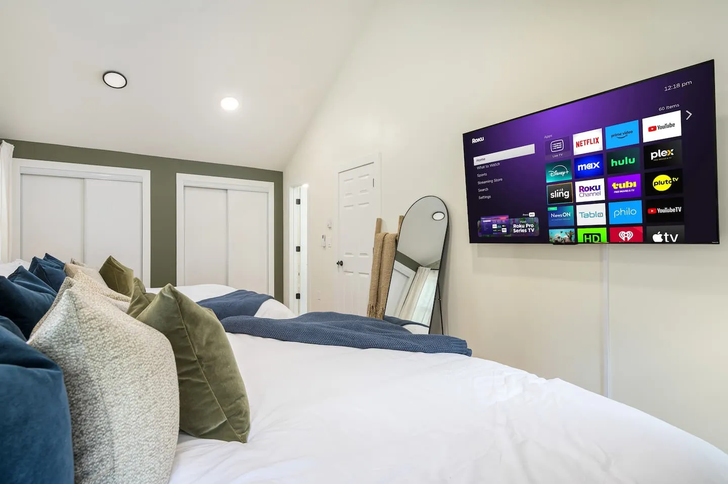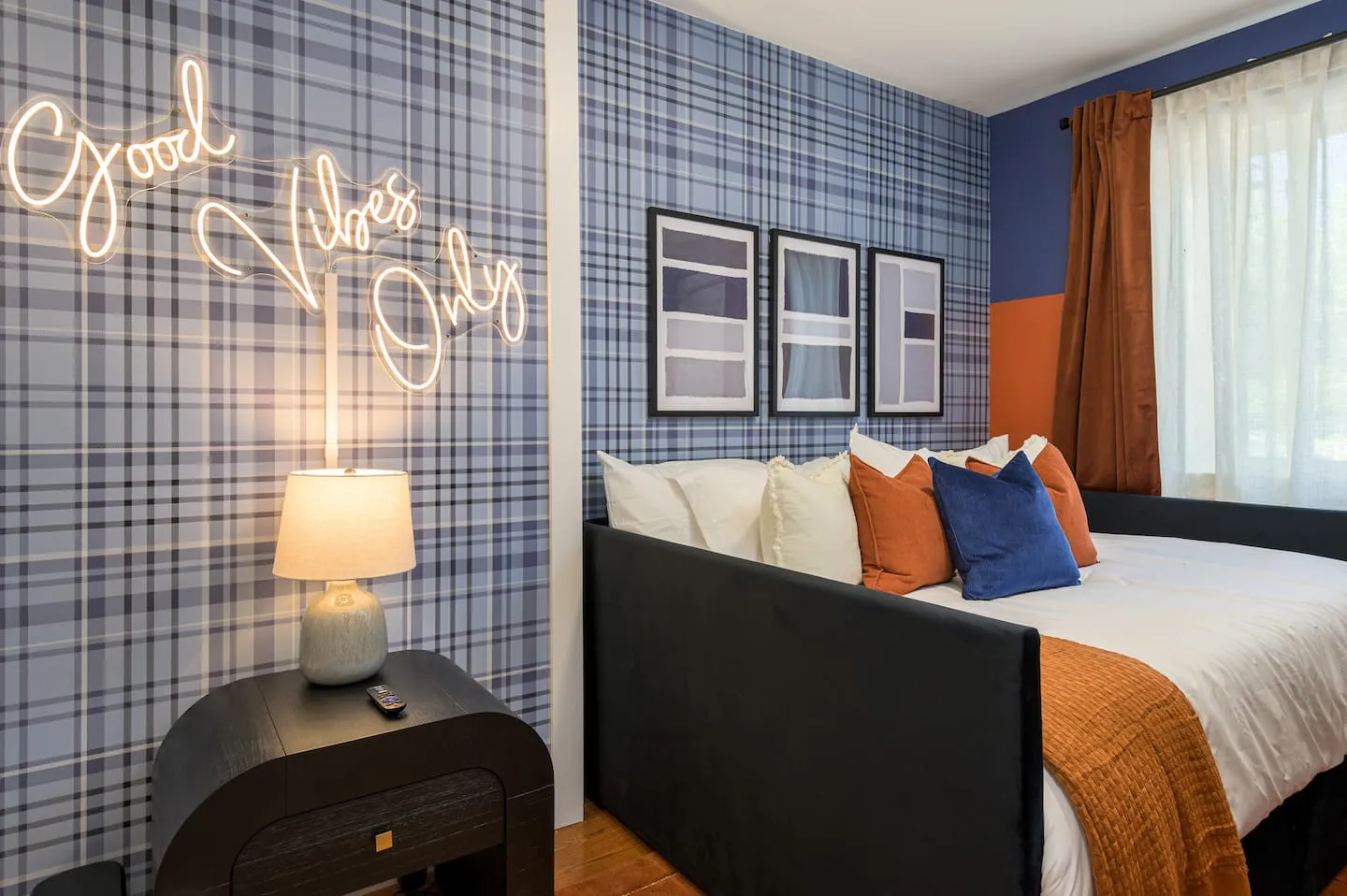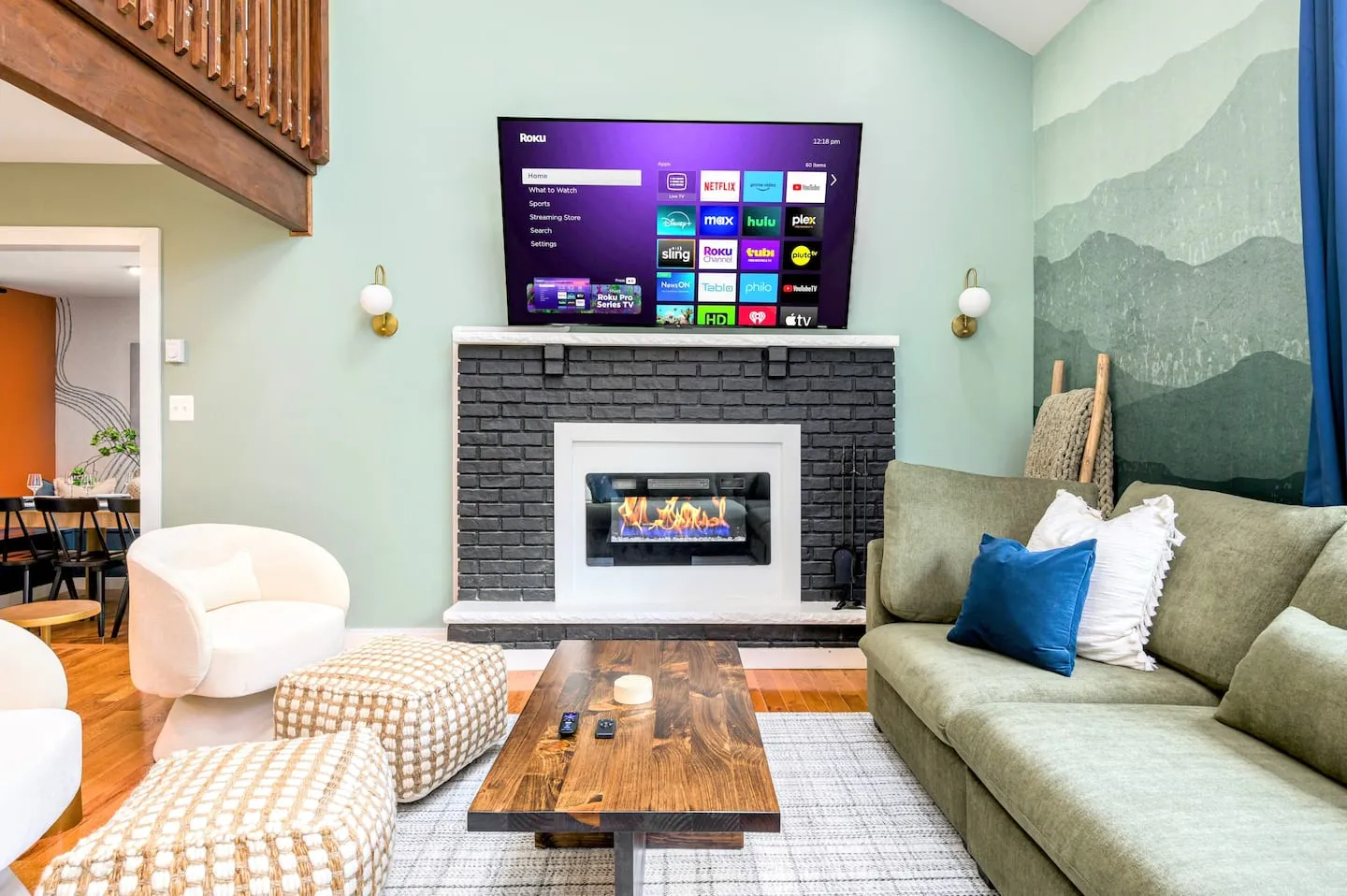 This East Stroudsburg property demonstrates comprehensive renovation excellence earning perfect 5.0-star rating across 20 reviews through architectural enhancement emphasizing natural light and forest connectivity via floor-to-ceiling windows throughout the main living spaces. The design challenge centered on transforming a standard Penn Estates community home into a distinctive forest retreat where dramatic glazing creates seamless visual connection to surrounding woodland while maintaining year-round comfort through brand-new mini-split climate control systems addressing both summer cooling and winter heating demands. The floor-to-ceiling window installation required structural considerations reinforcing wall systems to support expansive glass spans, careful solar orientation managing heat gain and glare, and high-performance glazing specifications preventing condensation and energy loss during Poconos winter conditions. This architectural gesture transforms the interior experience from enclosed cabin to forest pavilion, with guest reviews consistently praising the natural light quality and immersive woodland views.