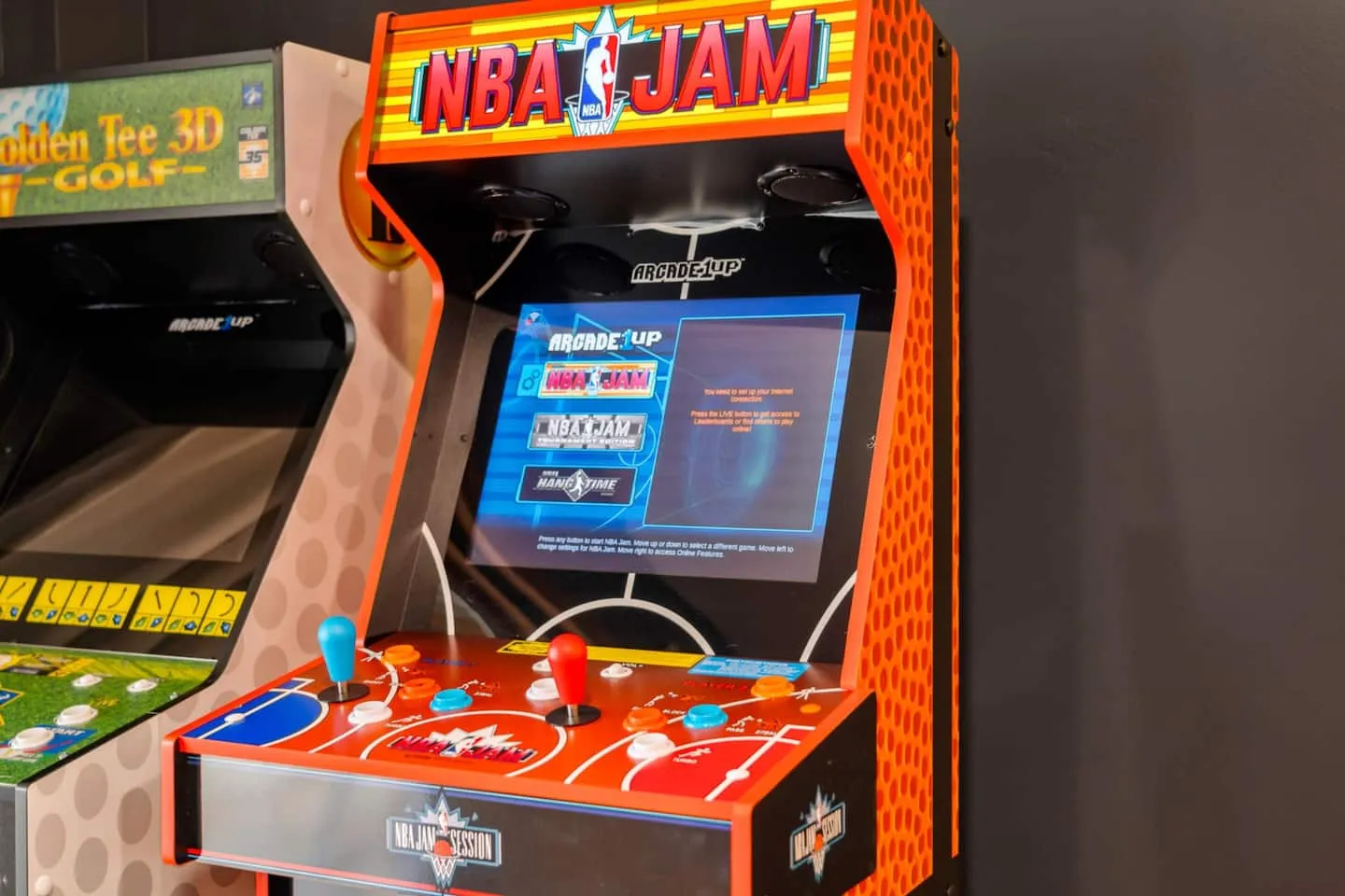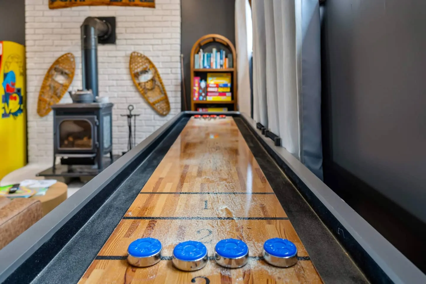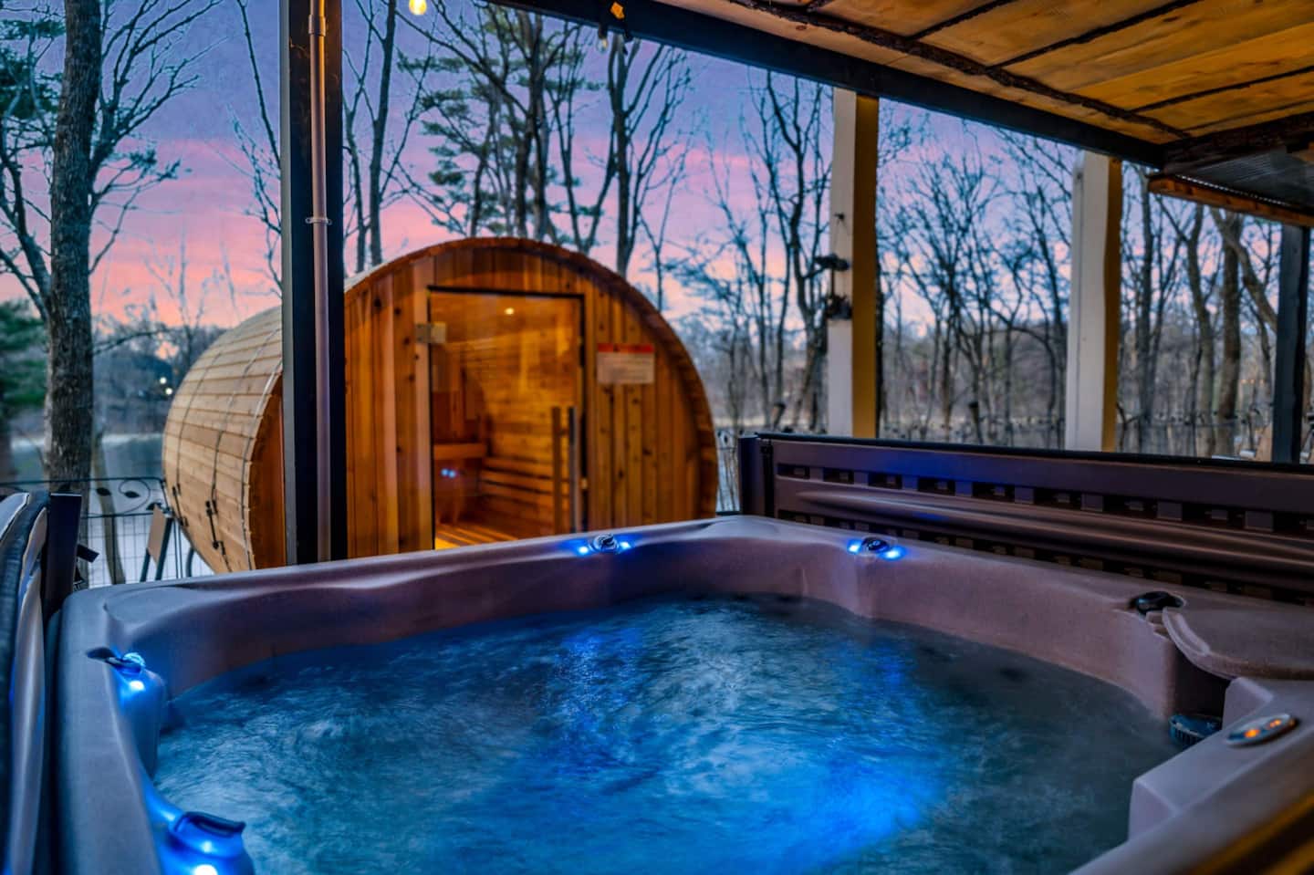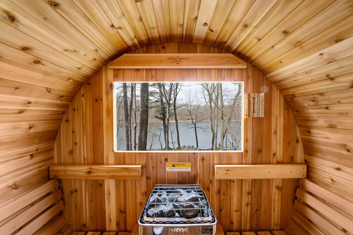 The sunroom addition represents strategic square footage expansion enhancing year-round usability through climate-controlled lake viewing space with gas fireplace, sliding door access from dining room, and extensive board game library. This four-season room required careful foundation work on sloped terrain, proper insulation and HVAC integration extending the home's climate control systems, and window placement maximizing lake views while managing solar heat gain. The game room occupies the middle terrace basement level, featuring leather sectional seating around gas fireplace, shuffleboard table, three arcade games including NBA Jam, regulation pool table, ping pong conversion capability, jumbo Connect Four, bean bag seating, and 6-seat bar with 65-inch TV. Sliding glass doors from the game room provide direct access to the hot tub and sauna complex, both positioned with glass windows capturing unobstructed lake views creating the property's signature wellness amenity. The sauna installation required specialized electrical infrastructure, proper ventilation systems, and waterproof construction adjacent to the hot tub.
