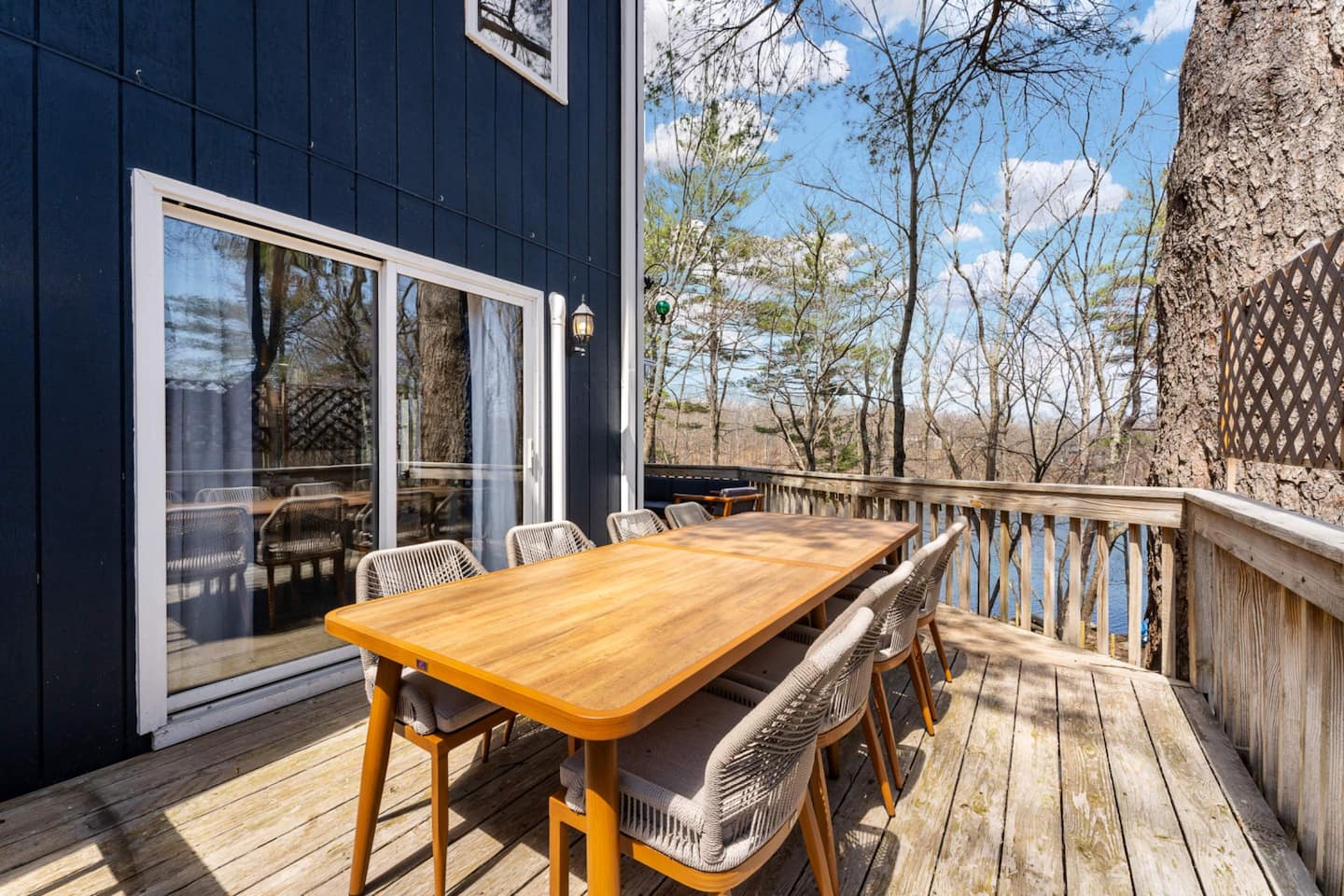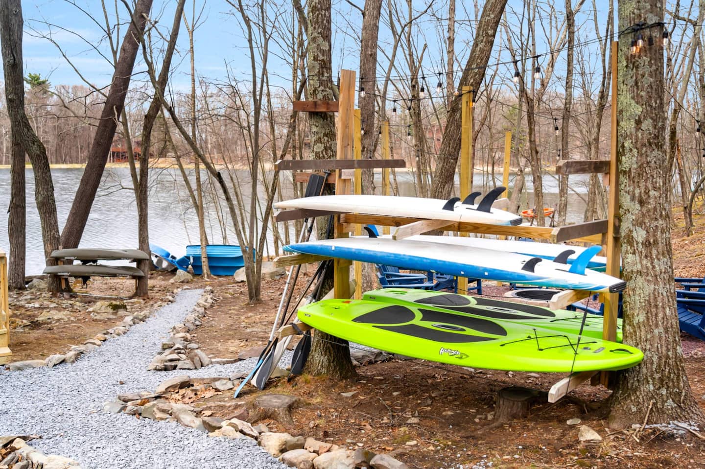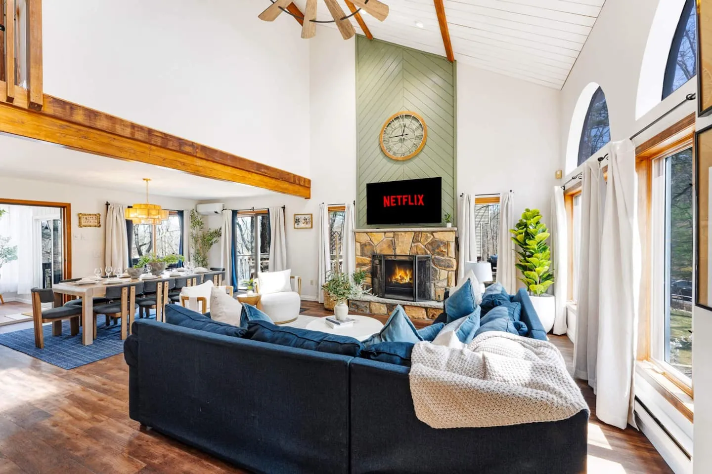 The outdoor deck system extends from the main floor with 10-person dining table and grill overlooking the lake, while the stepped terrace design creates multiple gathering zones at different elevations preventing all outdoor activity from concentrating in a single area. The fire pit at lake level includes 8 Adirondack chairs positioned for both fire viewing and water observation, while the cornhole pit received dedicated nighttime lighting extending play hours beyond daylight. The water sports equipment provision (multiple kayaks, paddleboards, and pedal boats) transforms the lakefront location from passive viewing experience into active water recreation, requiring proper storage solutions and life vest inventory management. The property's Penn Estates gated community location provides seasonal amenity access (Memorial Day through Labor Day) to beaches, pools, tennis courts, basketball courts, volleyball courts, dog parks, and playgrounds, requiring photography showing both private and community facility usage. The modern kitchen features multiple coffee preparation options (standard pot and Keurig) plus small appliance collection (blender, crock pot, toaster oven) addressing extended-stay groups' meal preparation needs, while the open-concept living and dining areas with 65-inch TV and electric fireplace create the main floor gathering hub. The perfect 5.0 rating validates the three-level terrace design's success in creating a true lakefront resort experience where vertical programming prevents activity conflicts, water sports equipment enables lake engagement beyond visual appreciation, and the hot tub/sauna wellness complex with lake views establishes premium positioning in the competitive Poconos vacation rental market serving groups seeking both adventure and relaxation in a single property.
