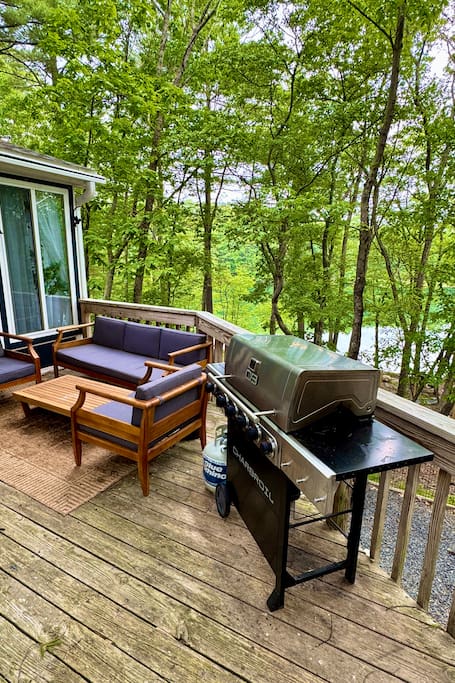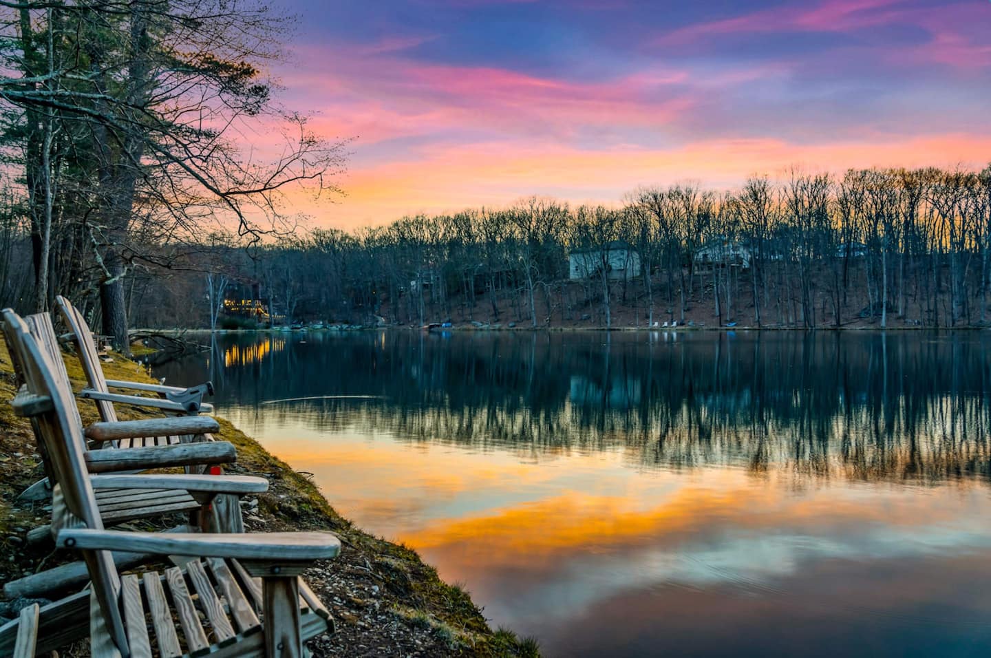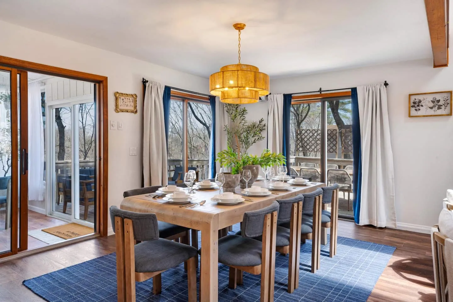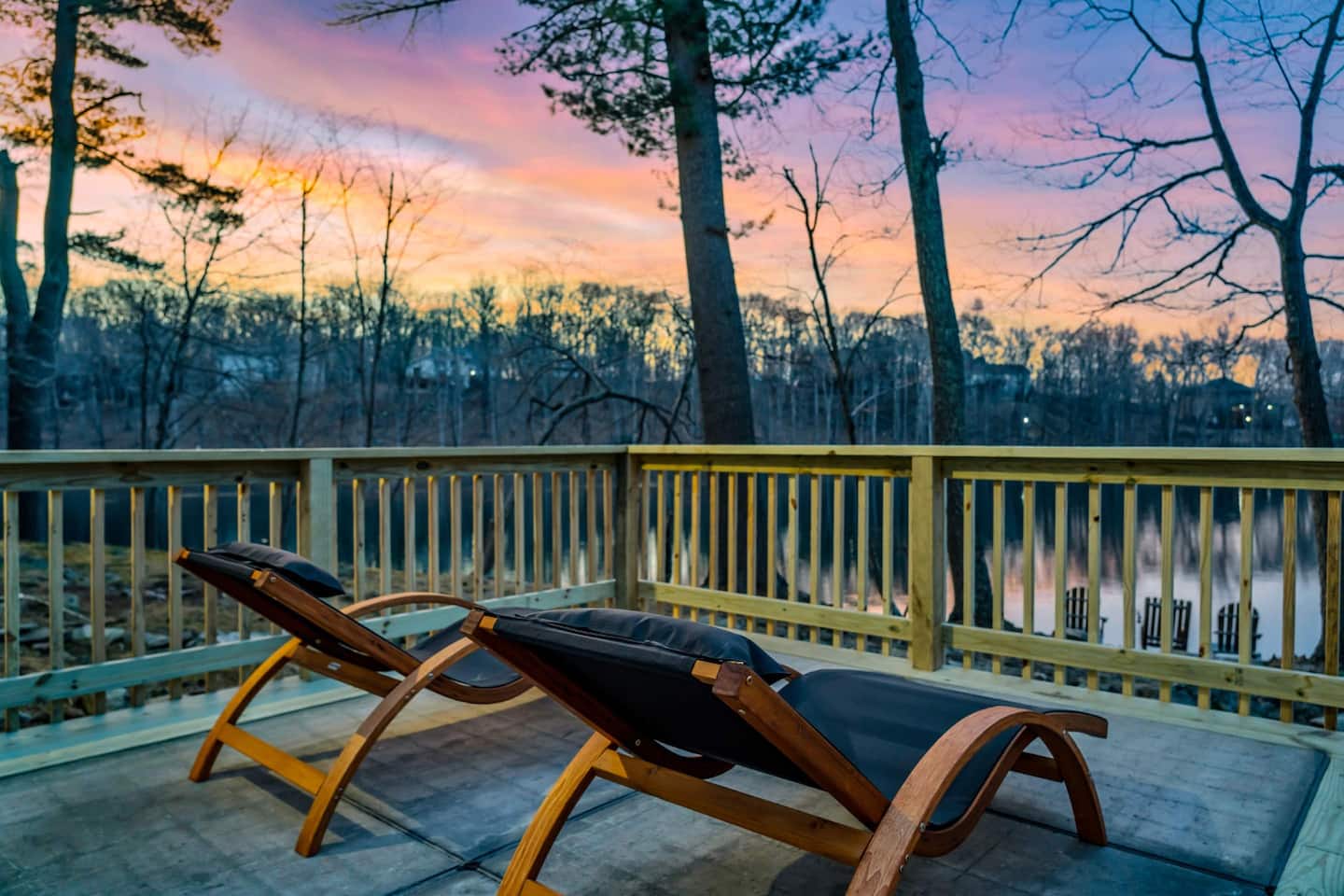 The outdoor deck system extends from the main floor with 10-person dining table and grill overlooking the lake, while the stepped terrace design creates multiple gathering zones at different elevations preventing all outdoor activity from concentrating in a single area. The fire pit at lake level includes 8 Adirondack chairs positioned for both fire viewing and water observation, while the cornhole pit received dedicated nighttime lighting extending play hours beyond daylight. The water sports equipment provision (multiple kayaks, paddleboards, and pedal boats) transforms the lakefront location from passive viewing experience into active water recreation, requiring proper storage solutions and life vest inventory management. The property's Penn Estates gated community location provides seasonal amenity access (Memorial Day through Labor Day) to beaches, pools, tennis courts, basketball courts, volleyball courts, dog parks, and playgrounds, requiring photography showing both private and community facility usage. The modern kitchen features multiple coffee preparation options (standard pot and Keurig) plus small appliance collection (blender, crock pot, toaster oven) addressing extended-stay groups' meal preparation needs, while the open-concept living and dining areas with 65-inch TV and electric fireplace create the main floor gathering hub. The perfect 5.0 rating validates the three-level terrace design's success in creating a true lakefront resort experience where vertical programming prevents activity conflicts, water sports equipment enables lake engagement beyond visual appreciation, and the hot tub/sauna wellness complex with lake views establishes premium positioning in the competitive Poconos vacation rental market serving groups seeking both adventure and relaxation in a single property.