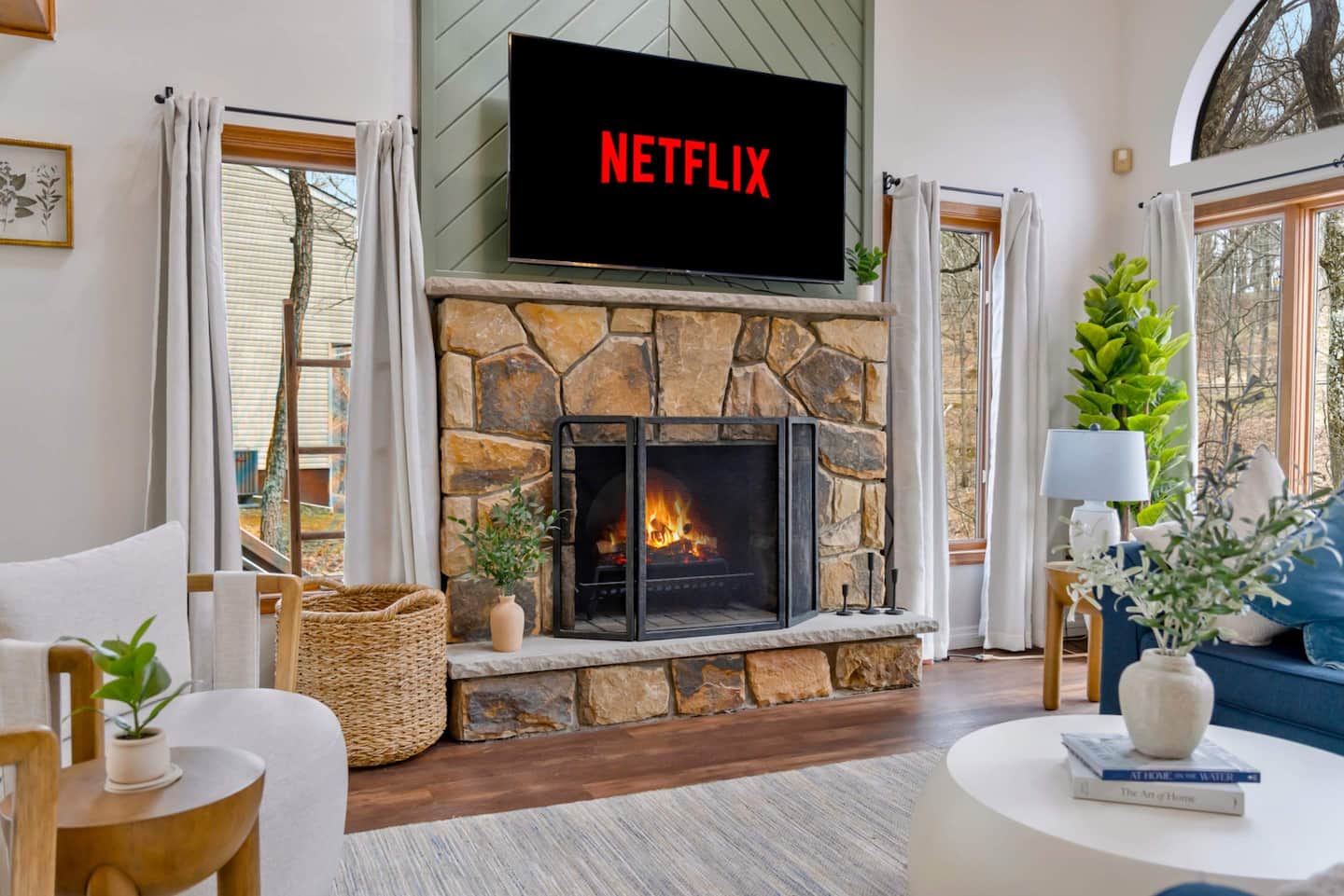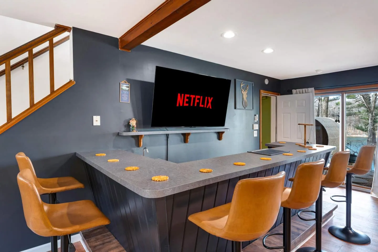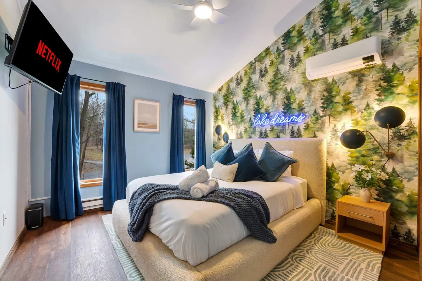 The 5-bedroom layout accommodates 12 guests with three bedrooms upstairs (one king, two queens), master bedroom on main floor with king bed and direct access to luxurious bathroom featuring jacuzzi tub positioned beneath skylight with additional windows framing lake views, and basement bunk room with two twin-over-twin configurations. Each bedroom received individual mini-split climate control units allowing personalized temperature management critical in properties serving diverse guest preferences, plus individual TV integration. The three full bathrooms distribute vertically with one on each level addressing the logistical challenge of multi-story properties where bathroom access requires guests to change floors. The master bath's jacuzzi tub with skylight and lake-view windows represents a significant design investment creating spa-like atmosphere that guests specifically mention in reviews.