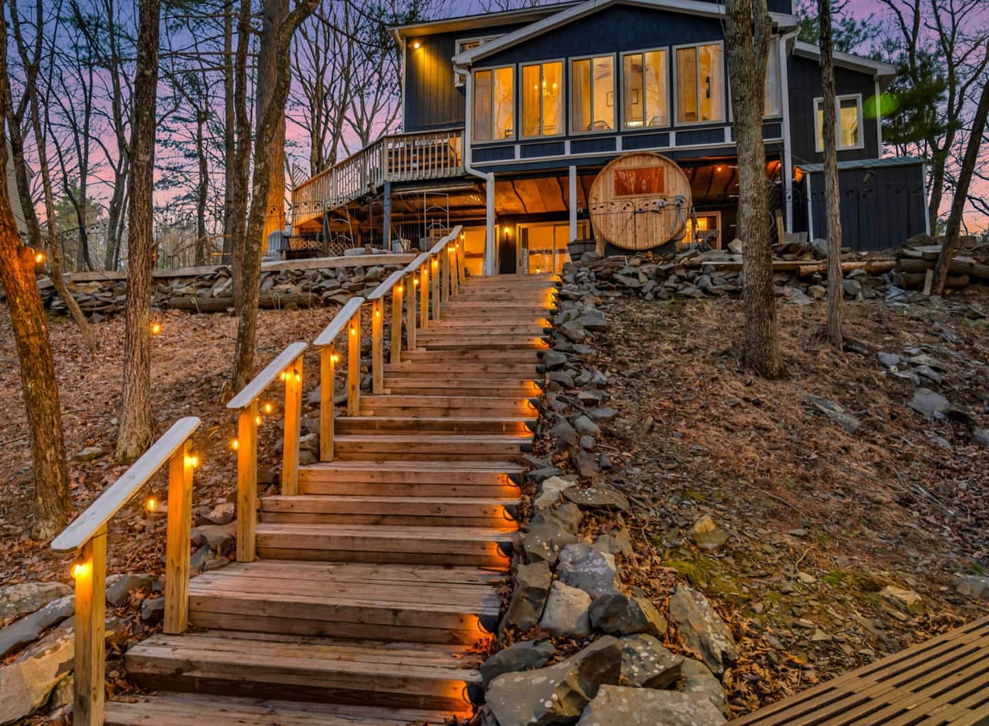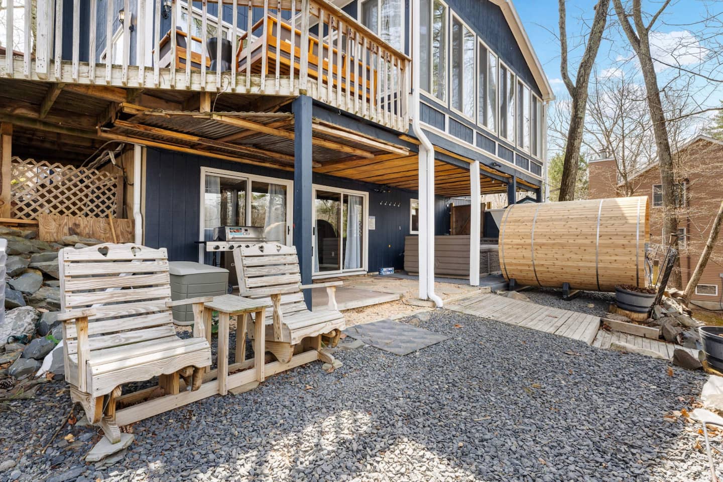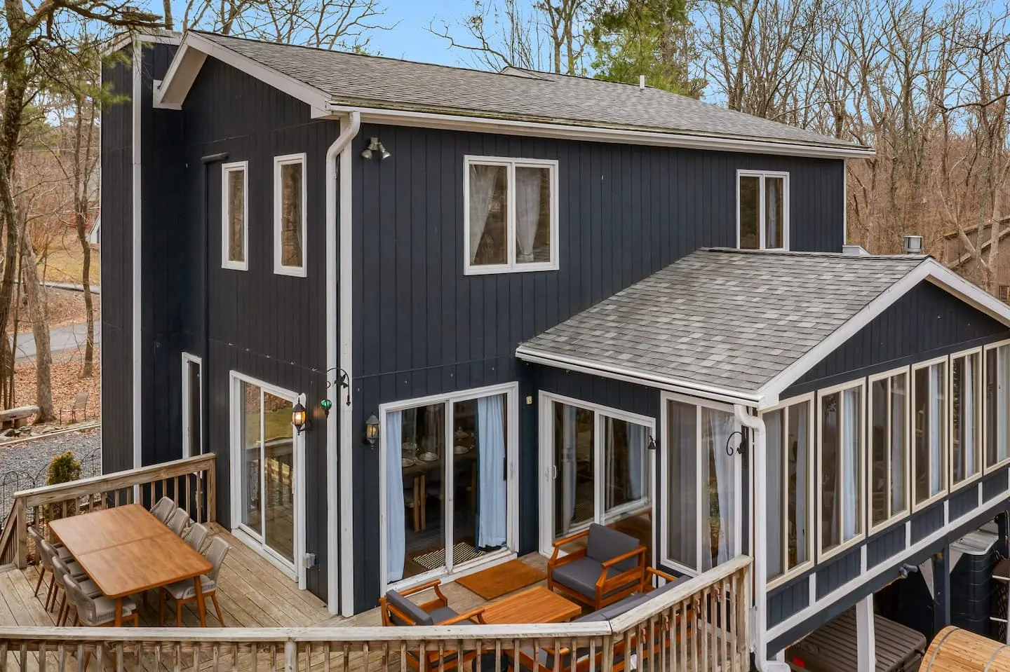 This East Stroudsburg lakefront property demonstrates exceptional site-responsive design earning perfect 5.0-star rating across 33 reviews through strategic three-level terrace programming that maximizes Highland Lake frontage while creating distinct activity zones at each elevation. The architectural challenge centered on leveraging the property's natural topography descending toward the lake, transforming what could be a circulation obstacle into the home's defining design feature. The "Terraces on the Lake" concept establishes clear vertical hierarchy: upper terrace houses kids' playground and newly constructed sunroom with gas fireplace and lounge seating for morning coffee and evening cocktails overlooking the water; middle terrace contains the comprehensive game room with bar, TV, and direct access to hot tub and sauna installation; lower terrace positions fire pit, cornhole court with nighttime lighting, sun deck with loungers, Adirondack fishing chairs, and water sports equipment (kayaks, paddleboards, pedal boats with life vests) at lake level creating immediate water access.