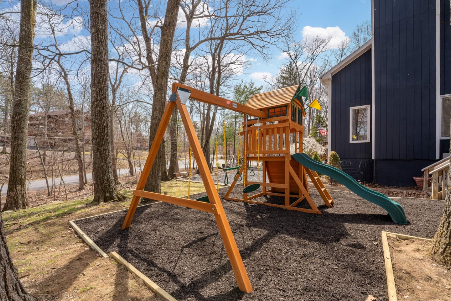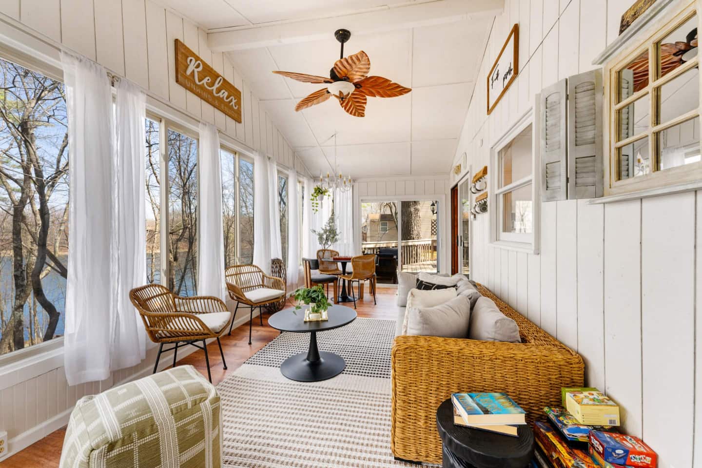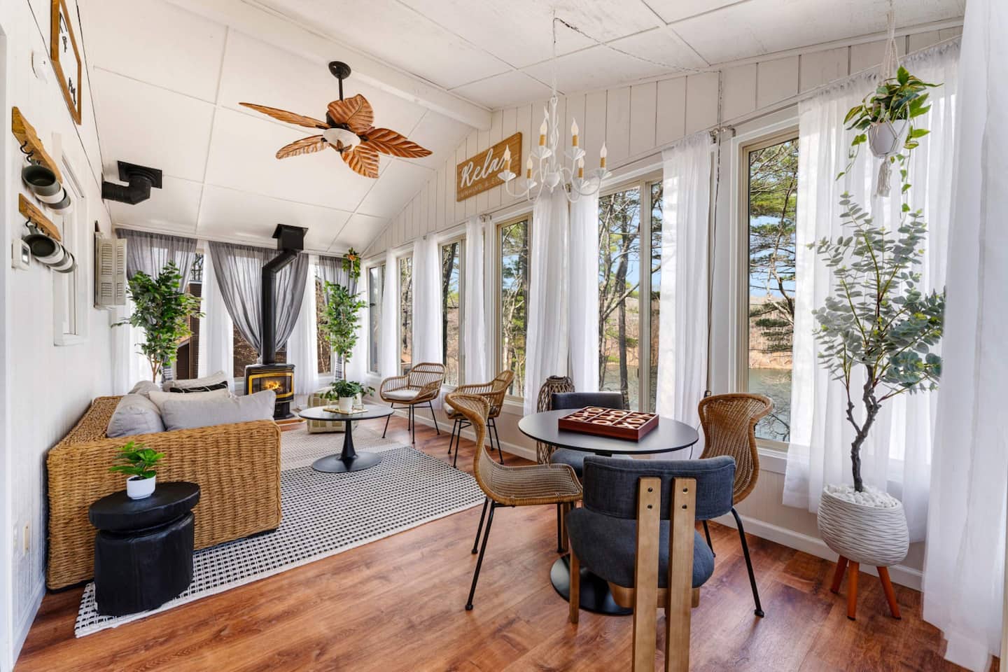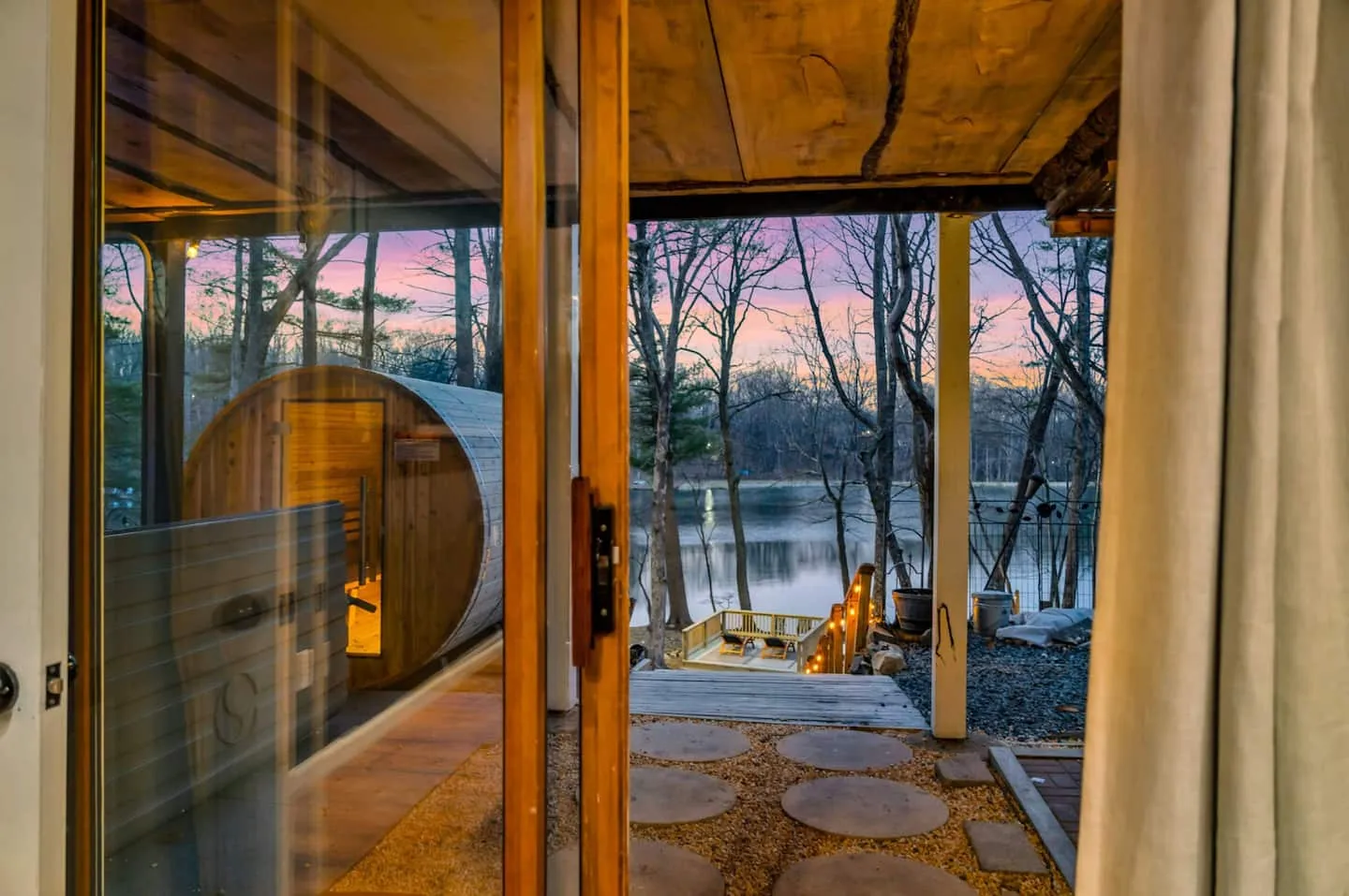 This East Stroudsburg lakefront property demonstrates exceptional site-responsive design earning perfect 5.0-star rating across 33 reviews through strategic three-level terrace programming that maximizes Highland Lake frontage while creating distinct activity zones at each elevation. The architectural challenge centered on leveraging the property's natural topography descending toward the lake, transforming what could be a circulation obstacle into the home's defining design feature. The "Terraces on the Lake" concept establishes clear vertical hierarchy: upper terrace houses kids' playground and newly constructed sunroom with gas fireplace and lounge seating for morning coffee and evening cocktails overlooking the water; middle terrace contains the comprehensive game room with bar, TV, and direct access to hot tub and sauna installation; lower terrace positions fire pit, cornhole court with nighttime lighting, sun deck with loungers, Adirondack fishing chairs, and water sports equipment (kayaks, paddleboards, pedal boats with life vests) at lake level creating immediate water access.