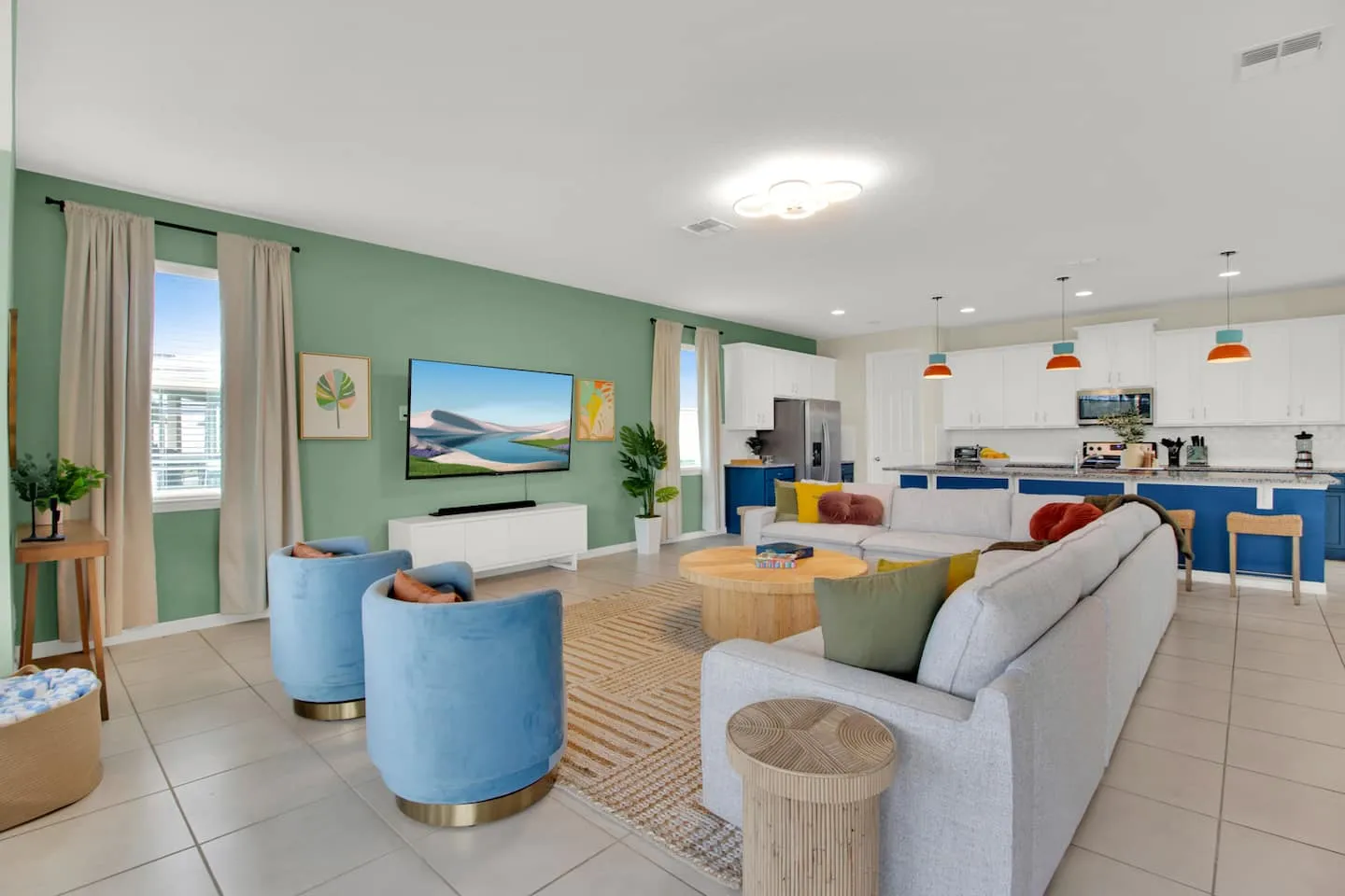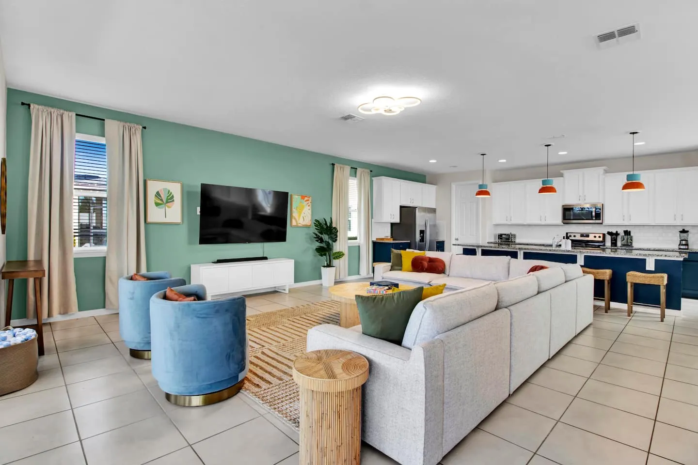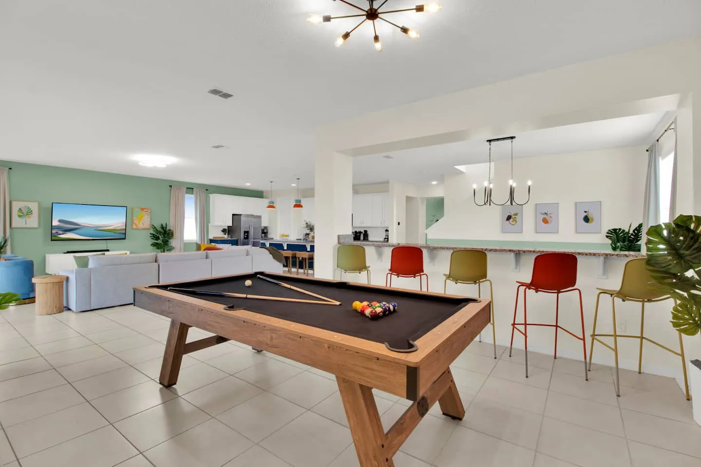 This Kissimmee estate represents comprehensive high-capacity vacation rental design accommodating 22 guests across 9 bedrooms and 6.5 bathrooms, requiring strategic spatial planning that balances communal gathering zones with private retreat spaces. The architectural challenge centered on preventing bottlenecks in a property serving multiple families simultaneously while maintaining clear circulation patterns between sleeping quarters, bathrooms, entertainment zones, and outdoor amenities. The solution employs dual living room programming with distinct entertainment focuses: the primary living area features oversized sectional seating arranged for whole-group movie nights and conversation, while a secondary living space houses foosball, shuffleboard, and dedicated gaming TV creating parallel entertainment capacity. The chef's kitchen anchors the main gathering zone with sleek island, top-tier appliances, and direct sightlines to the 14-seat dining table, facilitating meal preparation and service for large groups.