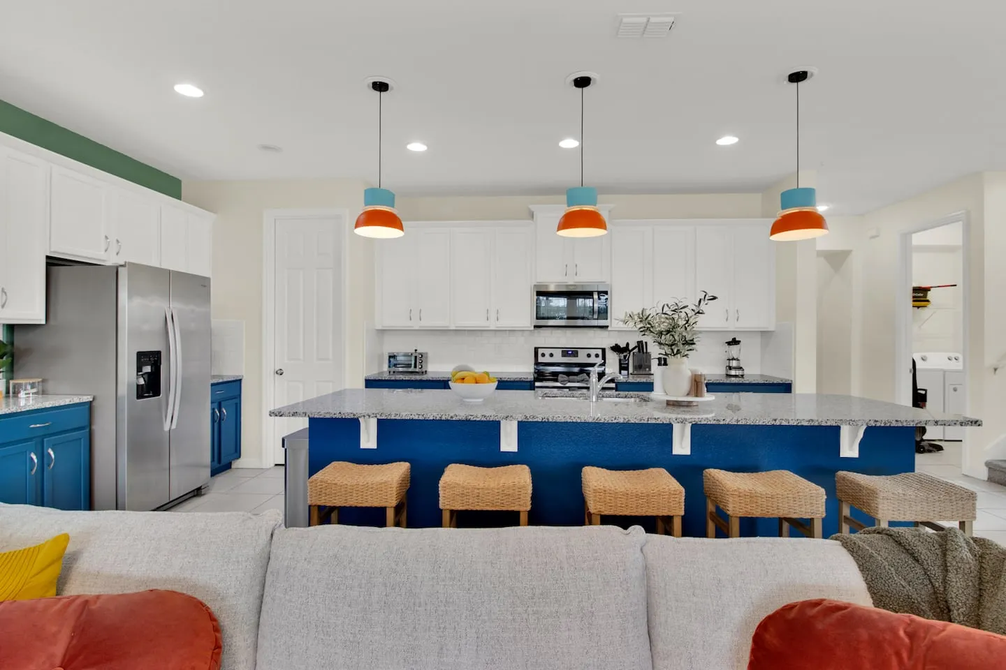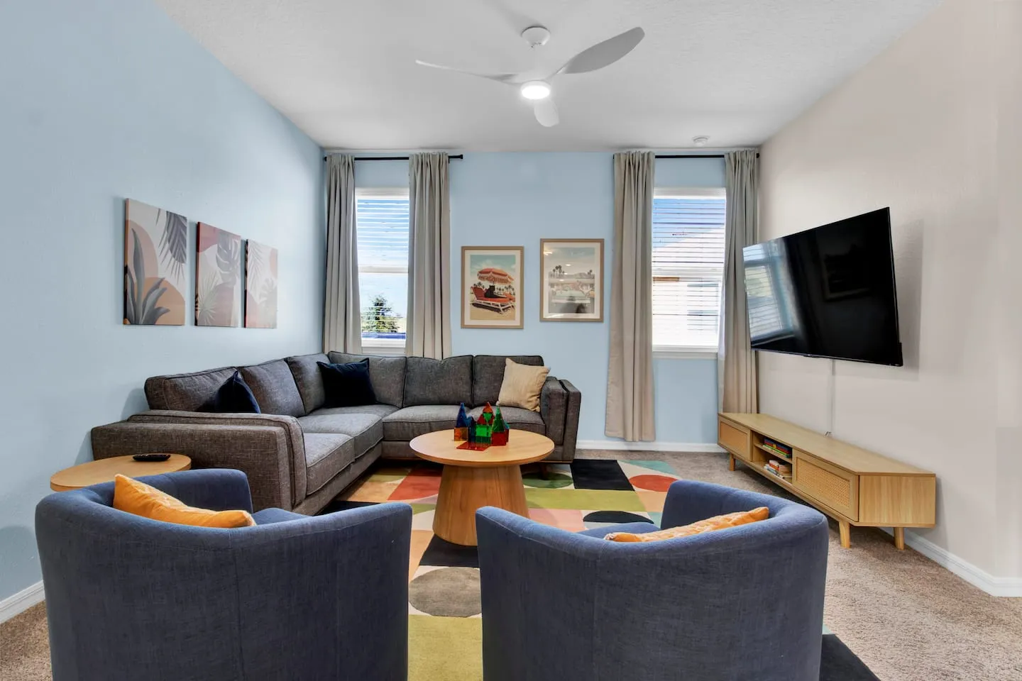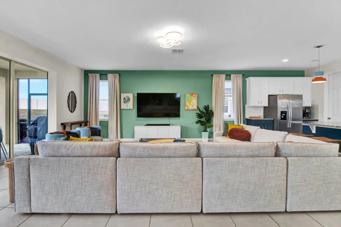 This Kissimmee estate represents comprehensive high-capacity vacation rental design accommodating 22 guests across 9 bedrooms and 6.5 bathrooms, requiring strategic spatial planning that balances communal gathering zones with private retreat spaces. The architectural challenge centered on preventing bottlenecks in a property serving multiple families simultaneously while maintaining clear circulation patterns between sleeping quarters, bathrooms, entertainment zones, and outdoor amenities. The solution employs dual living room programming with distinct entertainment focuses: the primary living area features oversized sectional seating arranged for whole-group movie nights and conversation, while a secondary living space houses foosball, shuffleboard, and dedicated gaming TV creating parallel entertainment capacity. The chef's kitchen anchors the main gathering zone with sleek island, top-tier appliances, and direct sightlines to the 14-seat dining table, facilitating meal preparation and service for large groups.