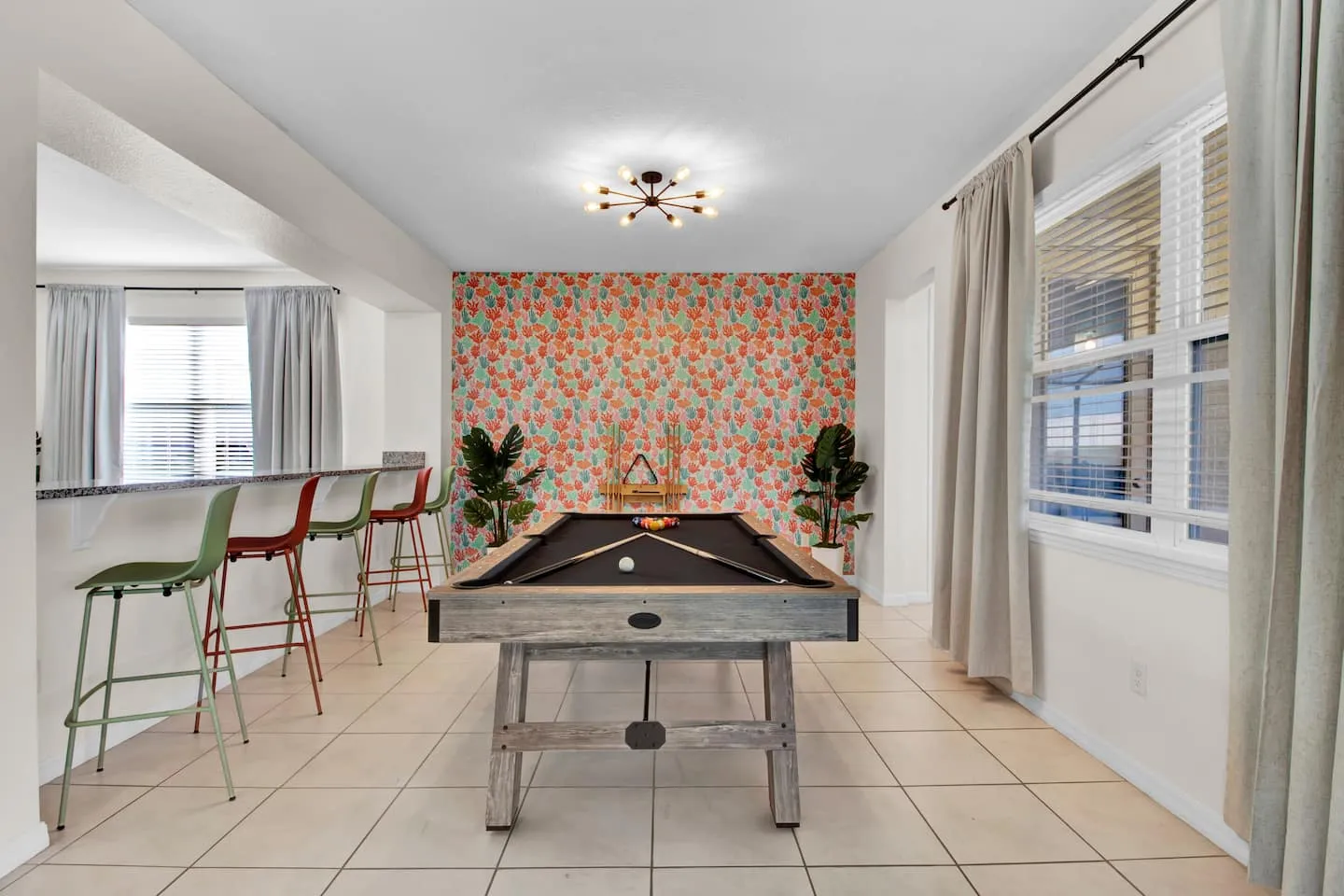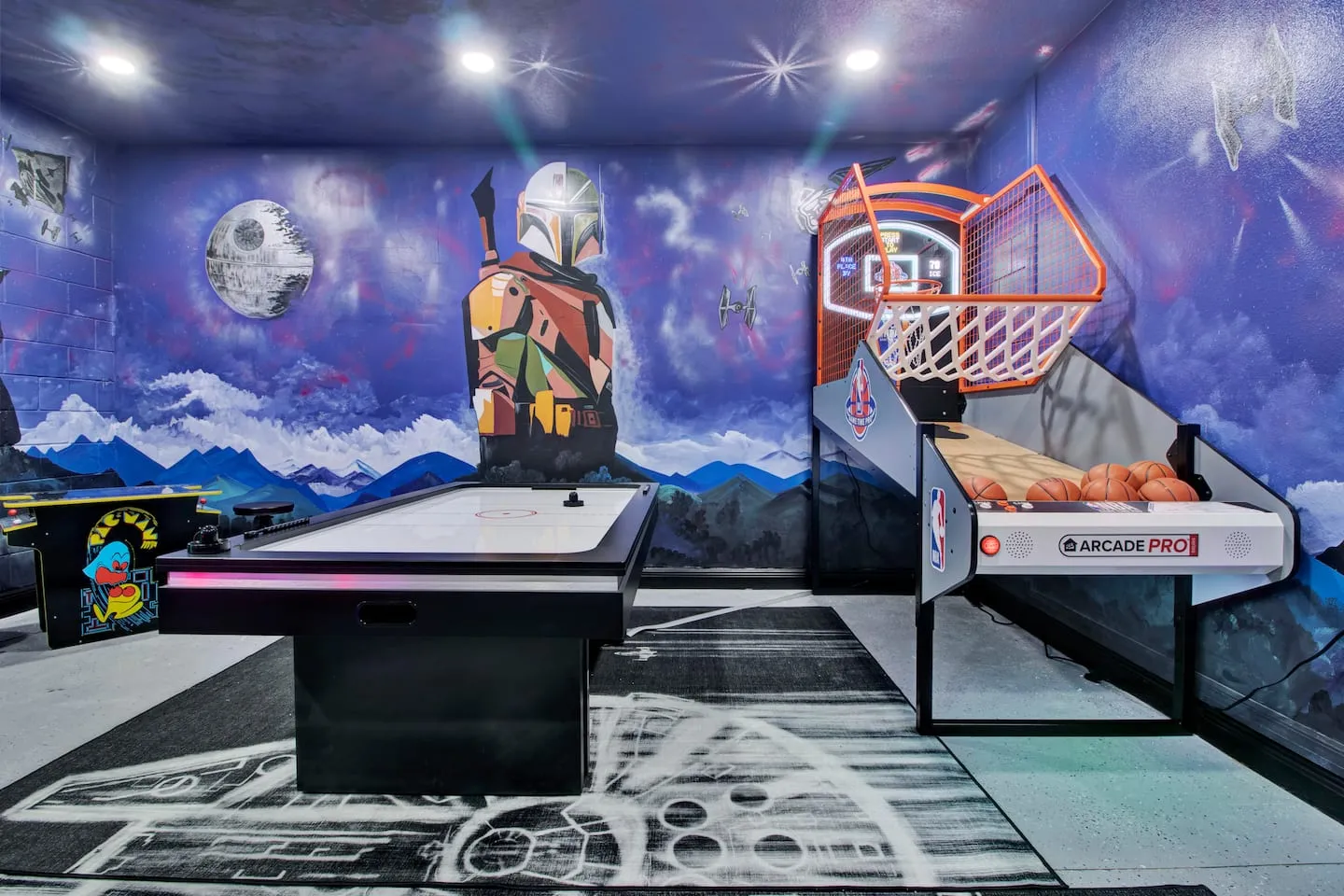 The signature Star Wars themed game room represents the property's primary design differentiator, requiring comprehensive thematic integration beyond superficial decoration. The space houses air hockey table, basketball shootout arcade, and retro gaming stations within an immersive environment employing franchise-specific color palettes, iconic imagery, and atmospheric lighting design that transforms functional game room into experiential destination. This dedicated entertainment zone operates independently from the main living areas, allowing simultaneous use by children while adults occupy other spaces. The theming execution required balancing fan appeal with broad market accessibility, avoiding overly niche references while delivering authentic franchise atmosphere. Adjacent to the secondary living space, a pool table and bar setup provides adult-oriented entertainment with casual sophistication, creating natural separation between age-appropriate activity zones.