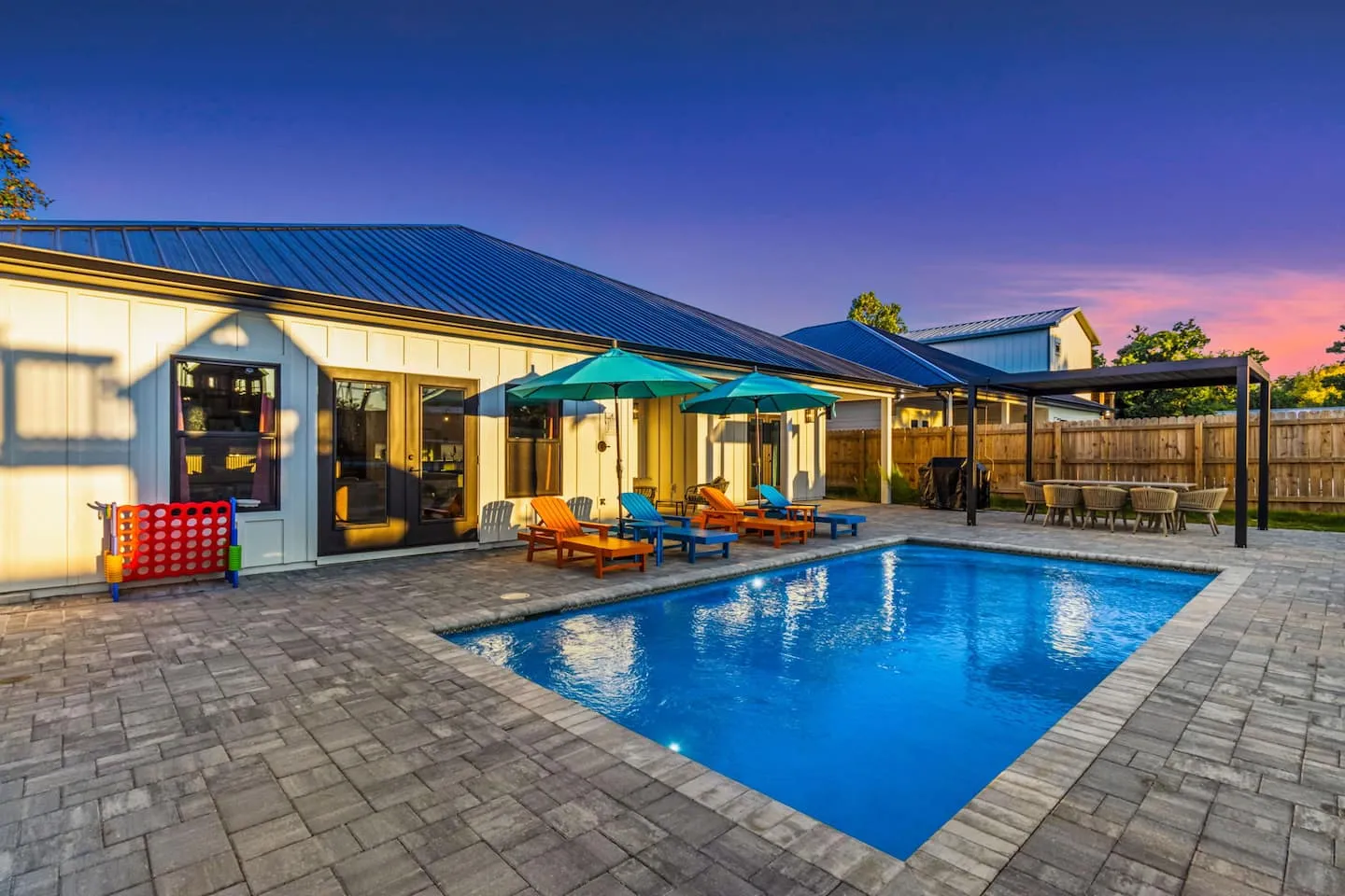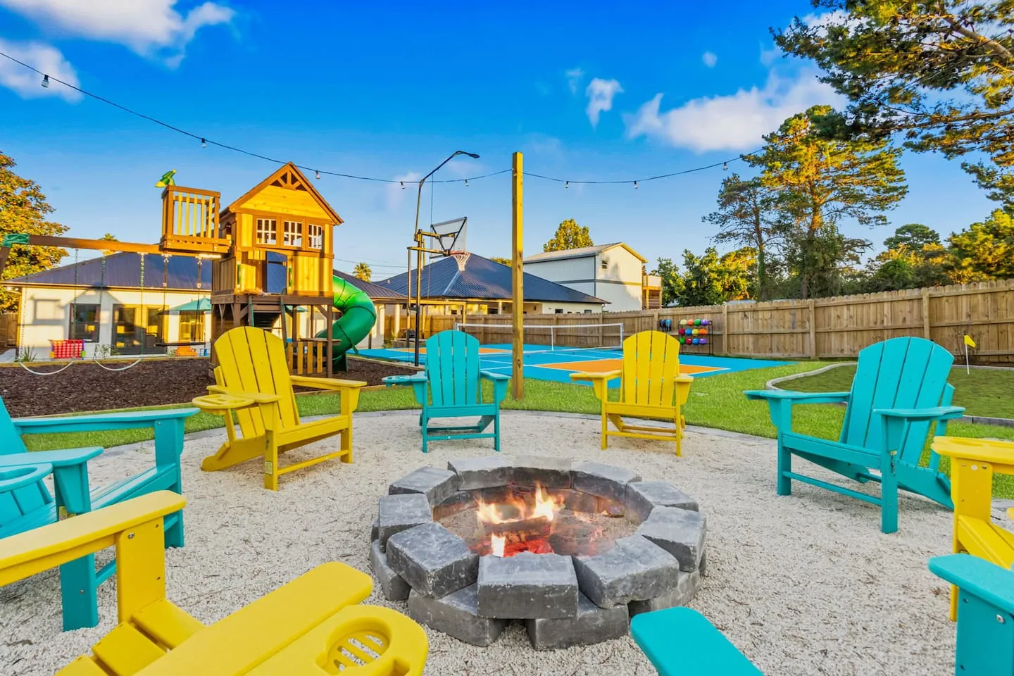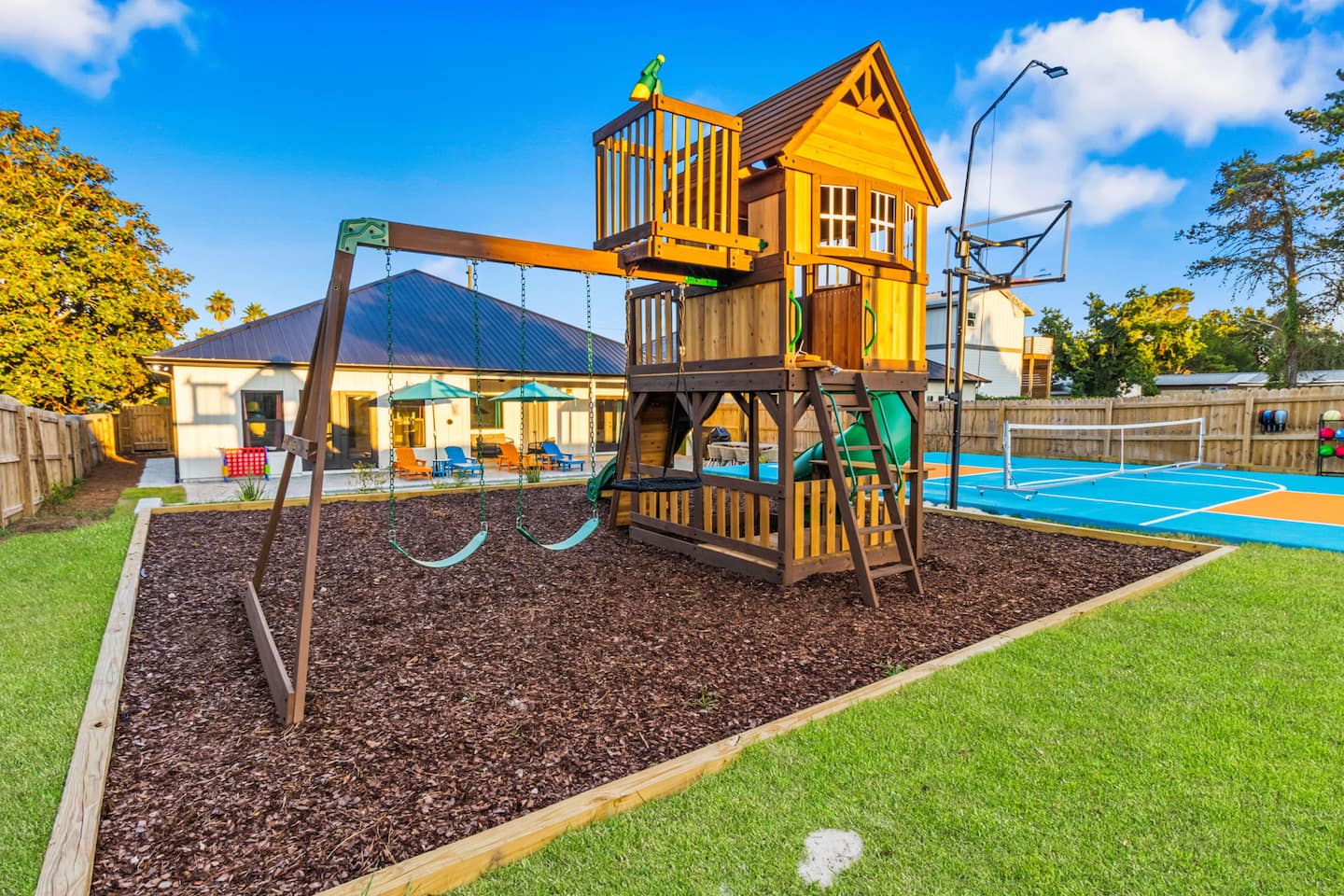 The outdoor recreation programming demonstrates comprehensive amenity strategy integrating half-court pickleball and basketball with shared playing surface, custom mini-golf course threading through landscaping, commercial-grade playground with climbing structures and swings, fire pit with eight-person seating capacity, pergola-covered outdoor dining for eight, separate patio lounge set for five, and BBQ grill station. This multi-zone outdoor design prevents activity bottlenecks by providing simultaneous entertainment options across different play styles and age groups. The pool layout includes comfortable lounge seating positioned around the perimeter creating multiple relaxation zones rather than single deck area, with optional heating to 82°F available for $50 per night when ambient temperatures exceed 65°F. The heat pump specification limiting temperature increase to 20 degrees above ambient represents honest capability communication, acknowledging that Florida winter cold snaps dropping overnight temperatures into 40s or 50s may prevent comfortable pool temperatures even with heating engaged. This transparent operational parameter management prevents guest disappointment from unrealistic heating expectations.
