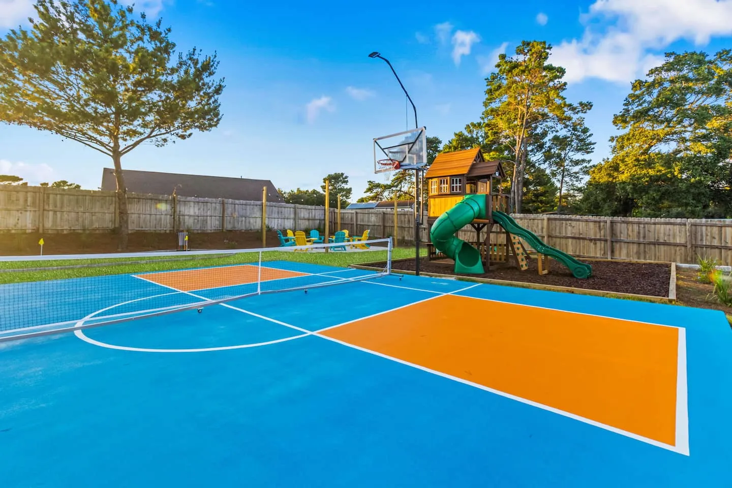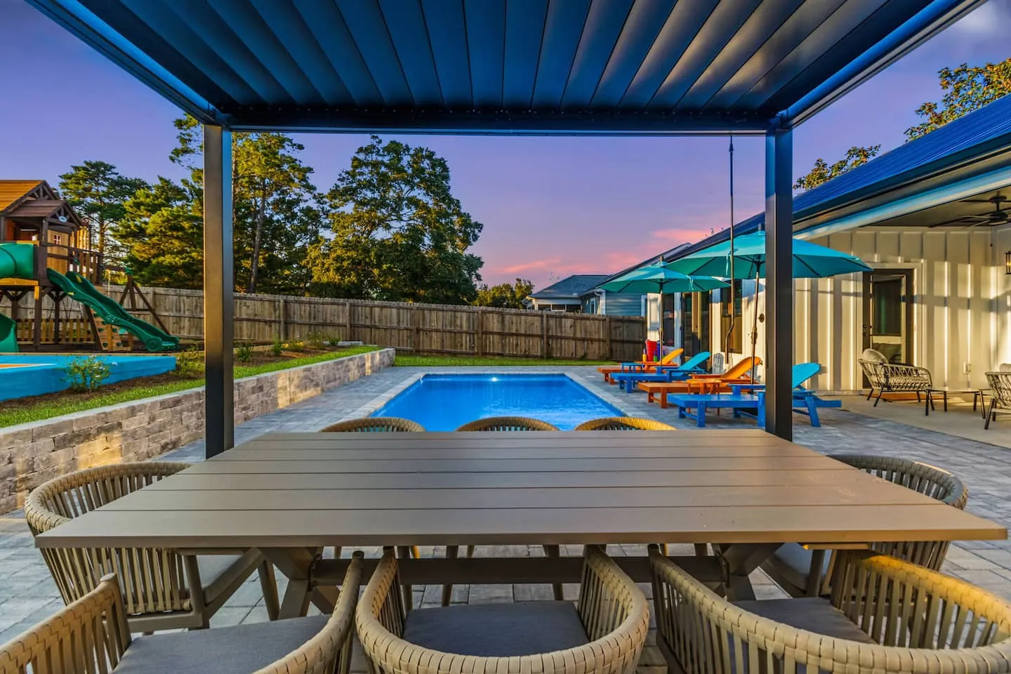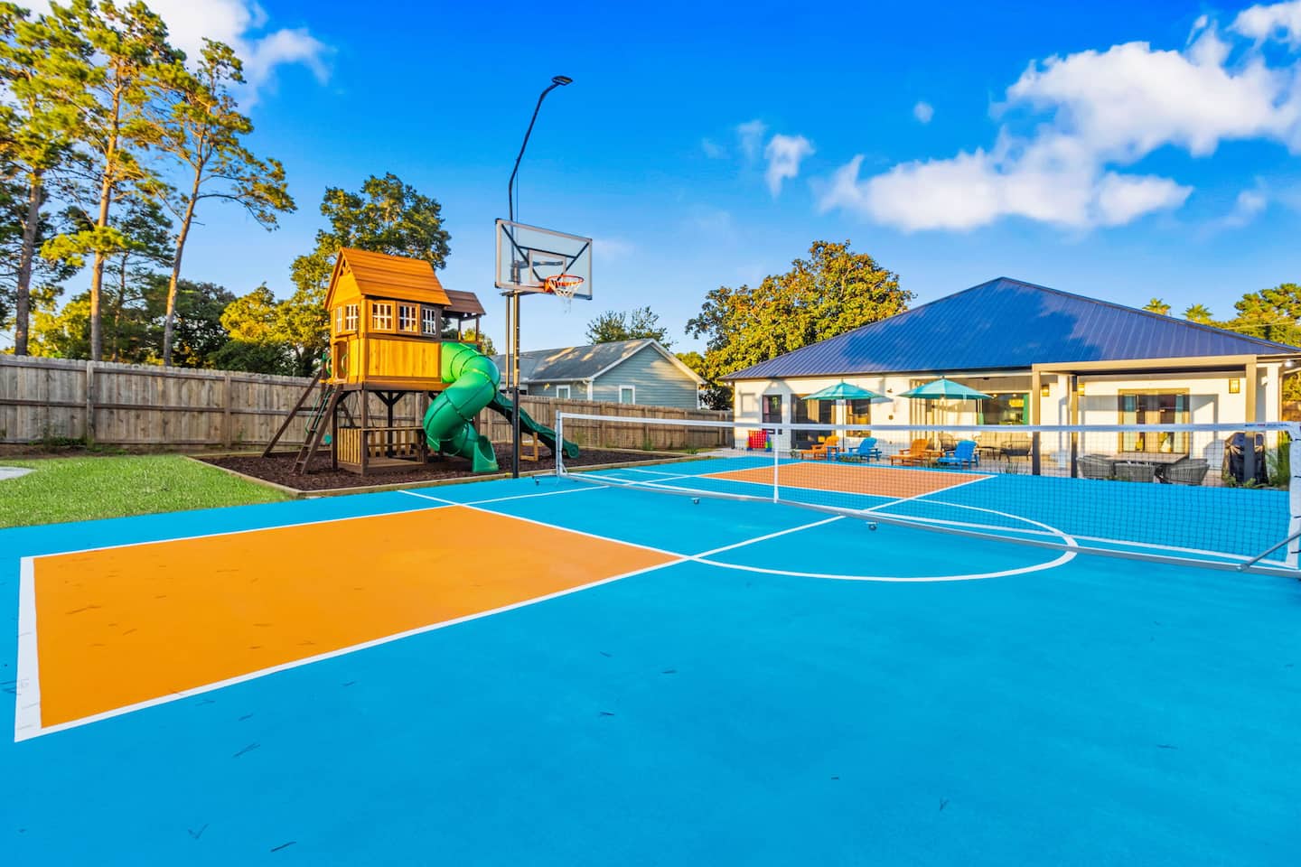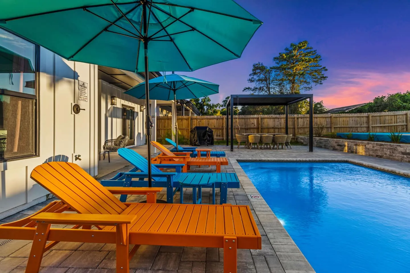 The outdoor recreation programming demonstrates comprehensive amenity strategy integrating half-court pickleball and basketball with shared playing surface, custom mini-golf course threading through landscaping, commercial-grade playground with climbing structures and swings, fire pit with eight-person seating capacity, pergola-covered outdoor dining for eight, separate patio lounge set for five, and BBQ grill station. This multi-zone outdoor design prevents activity bottlenecks by providing simultaneous entertainment options across different play styles and age groups. The pool layout includes comfortable lounge seating positioned around the perimeter creating multiple relaxation zones rather than single deck area, with optional heating to 82°F available for $50 per night when ambient temperatures exceed 65°F. The heat pump specification limiting temperature increase to 20 degrees above ambient represents honest capability communication, acknowledging that Florida winter cold snaps dropping overnight temperatures into 40s or 50s may prevent comfortable pool temperatures even with heating engaged. This transparent operational parameter management prevents guest disappointment from unrealistic heating expectations.