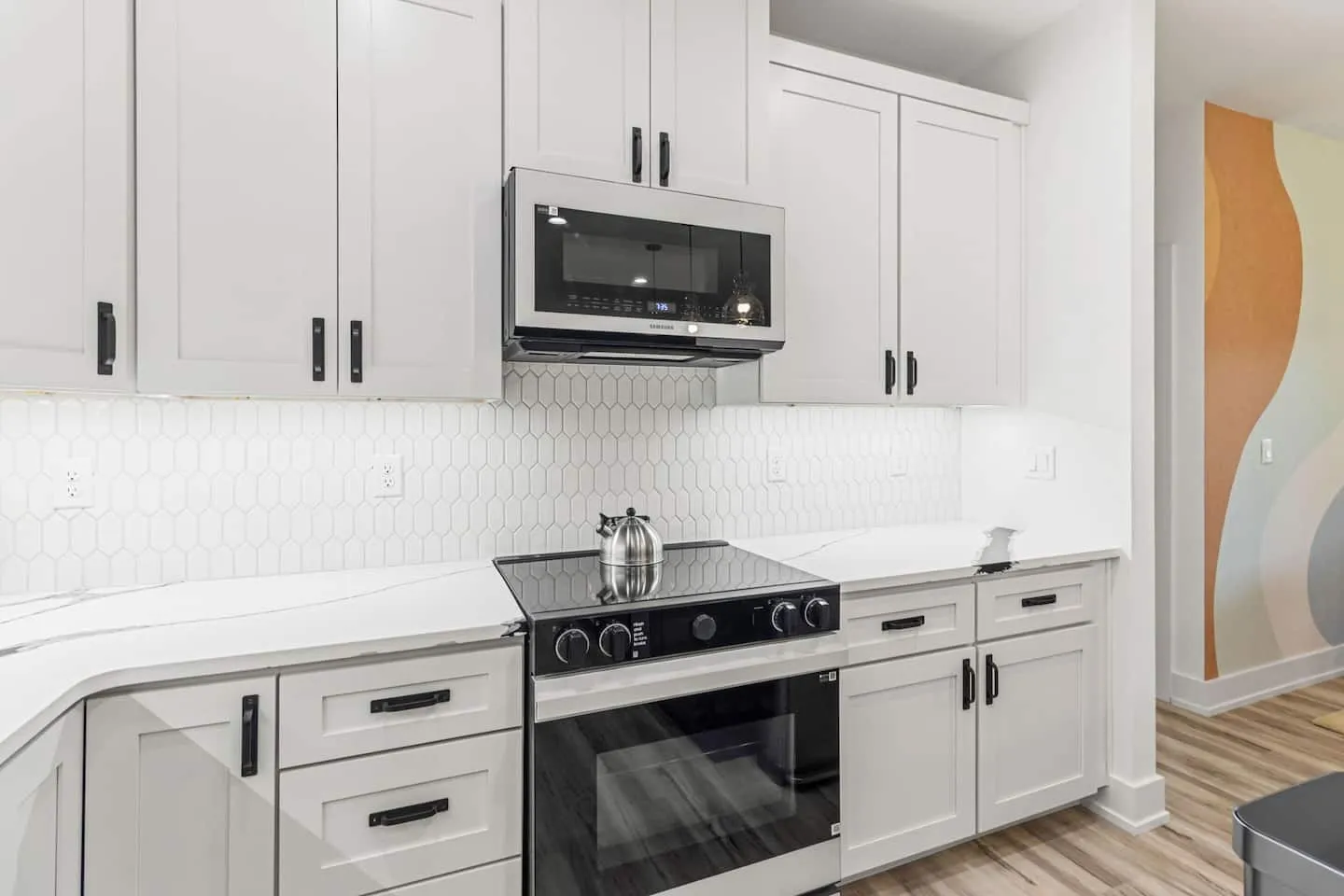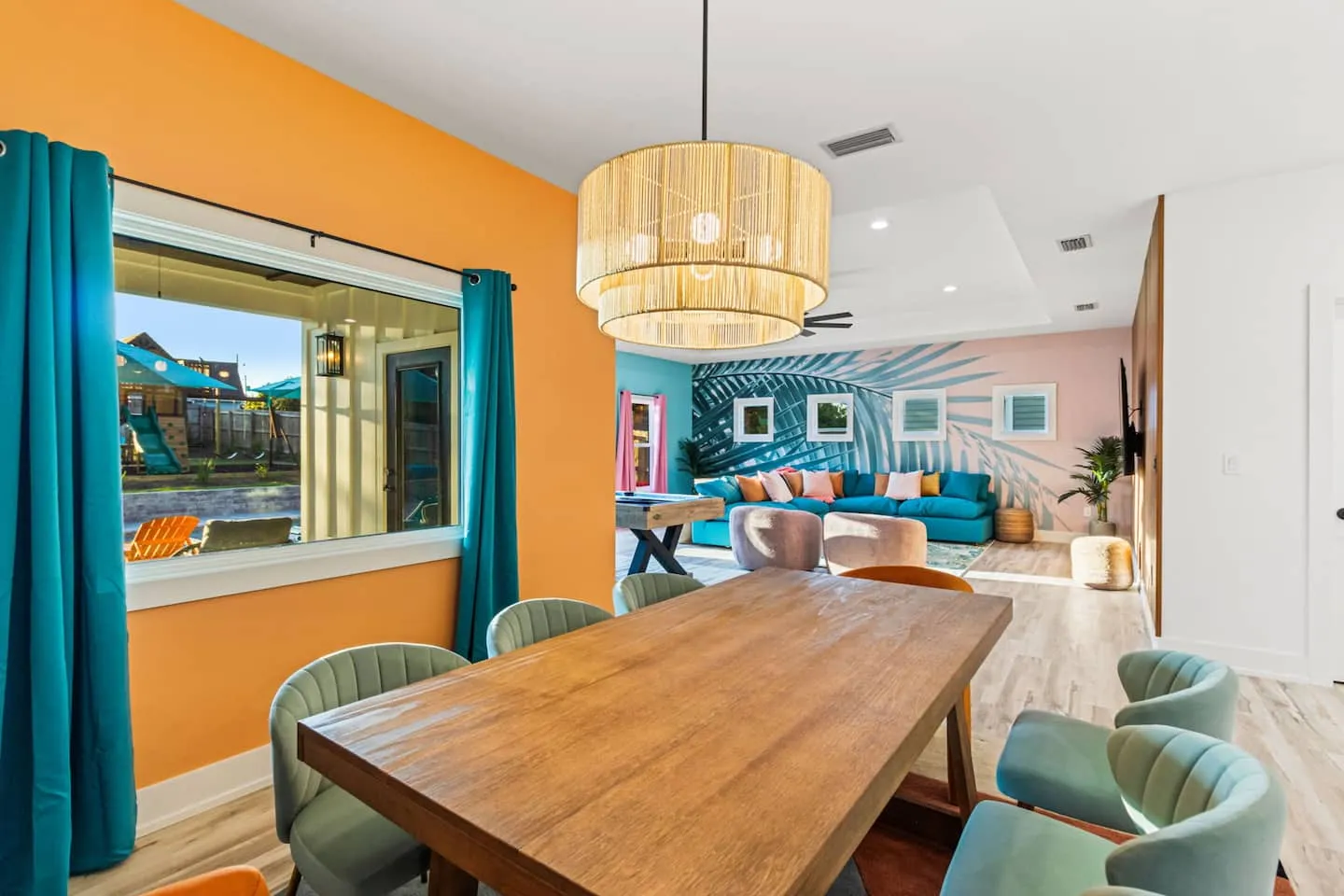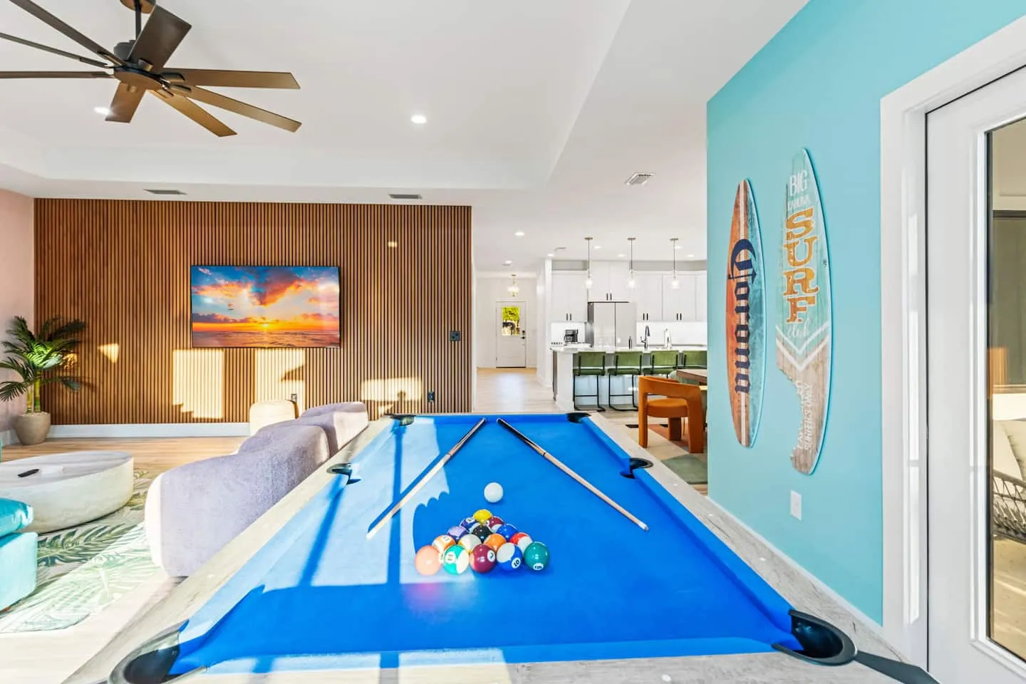 The interior spatial programming features open floor plan integrating kitchen, dining, and living zones creating flexible gathering capacity supporting 16-plus guests. The dining configuration combines table seating for 12 with kitchen island accommodating four additional guests establishing 16-person seated capacity. The living room anchors around 70-inch smart TV with large plush sectional, four accent chairs, throw pillows and blankets creating cozy viewing environment, plus integrated pool table enabling simultaneous activities. The coffee table positioning creates game night focal point for board games and social activities. The fully-equipped kitchen provides comprehensive cooking and baking essentials, though food provisions remain guest responsibility, with standard appliance complement including range, oven, refrigerator, freezer, microwave, and complete dish and cutlery inventory.