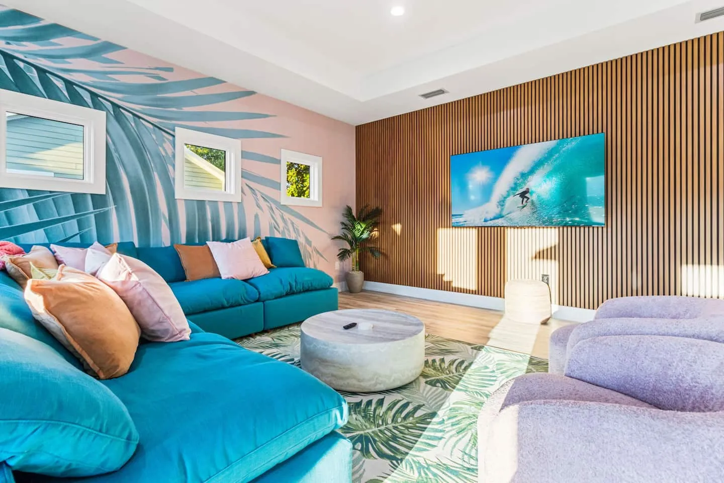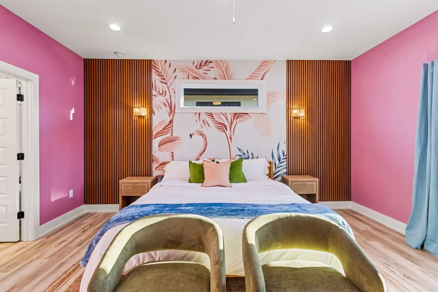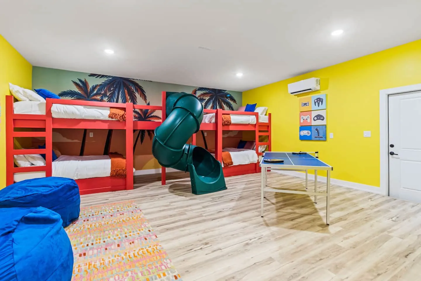 This Panama City Beach property demonstrates extreme high-capacity sleeping optimization achieving perfect 5.0-star rating across 3 reviews through innovative quad-bunk configuration in Bedroom 5 installing four full-size bunk beds within a single room accommodating eight sleepers. This represents significant spatial planning and structural engineering addressing the fundamental challenge of maximizing guest capacity while maintaining comfortable sleeping conditions and safety standards. The quad-bunk layout required careful furniture positioning ensuring adequate circulation paths between bed clusters, structural reinforcement in floor framing supporting concentrated load of four heavy bunk assemblies plus eight occupants, ventilation considerations for a room housing eight sleepers requiring increased air circulation capacity, and egress planning meeting fire safety codes for multiple occupants. The full-size bunk selection rather than twin configurations provides more generous sleeping surfaces appealing to teenagers and adults rather than limiting appeal to young children, though this decision increases both spatial requirements and structural loading. Guest reviews specifically reference the full-size bunks as positive feature, validating the larger bed specification despite increased complexity.
