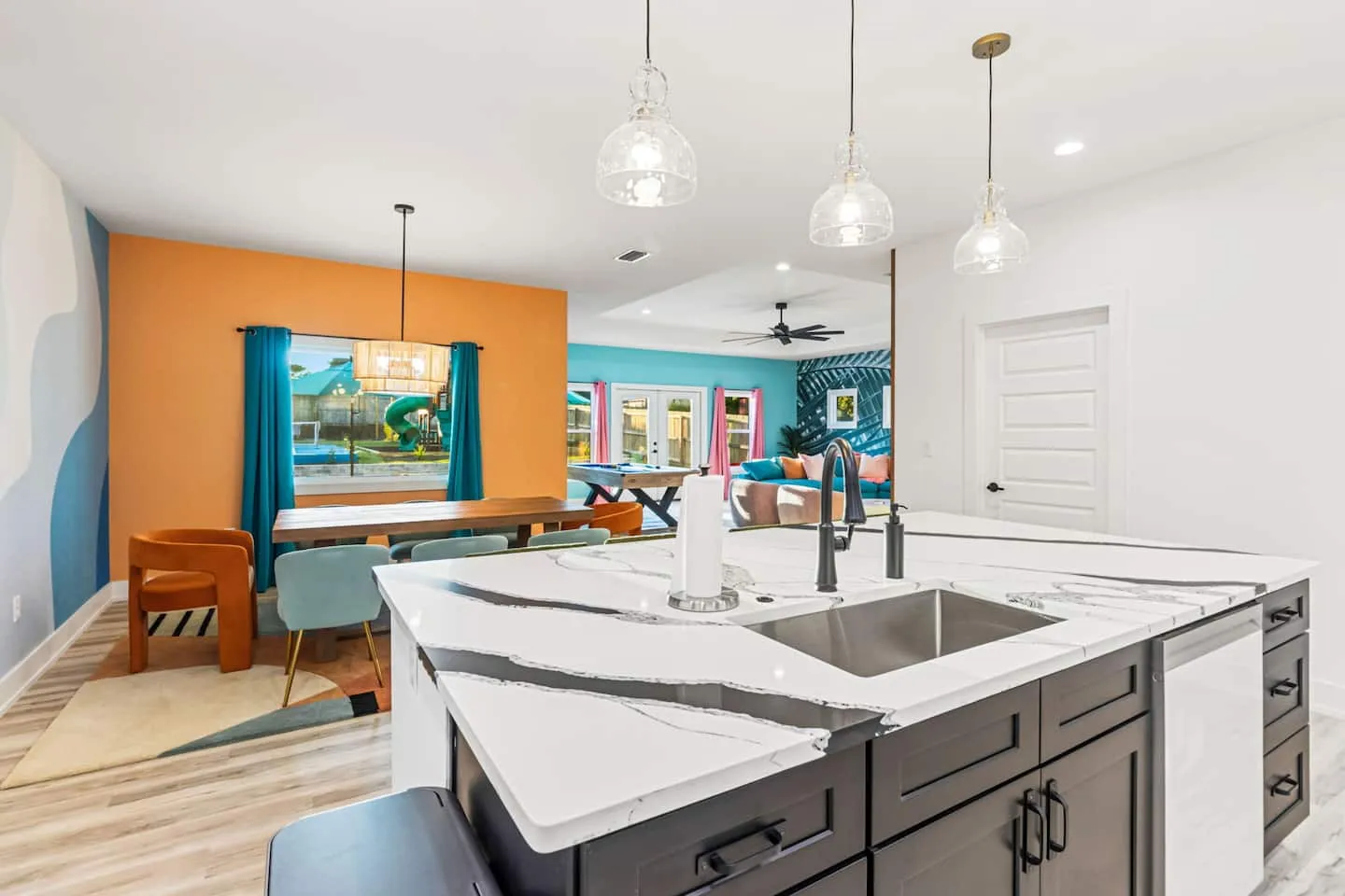 Photography documentation emphasized the quad-bunk configuration showing four full-size bunk beds with circulation paths and slide installation visible, integrated game room staging with ping pong table and bean bags demonstrating dual sleeping and entertainment functionality, outdoor recreation campus showing pickleball/basketball court with mini golf holes and playground equipment, pool area with perimeter lounge seating and pergola dining visible, soaker tub luxury bathroom detail, 70-inch TV living room with pool table and sectional seating, and open floor plan showing kitchen island transitioning to dining table. Host Ivana's responsive communication style (100% response rate within one hour) creates reliable guest experience despite relatively new two-month hosting tenure. The perfect 5.0 rating across cleanliness, accuracy, check-in, communication, and value categories validates the quad-bunk high-capacity sleeping strategy, dual-function game room integration, comprehensive outdoor amenity programming, luxury king bedroom differentiation, and strategic 30A corridor proximity positioning serving large multi-family groups, extended family reunions, and friend groups seeking maximum sleeping capacity with self-contained entertainment campus near Laguna Beach and premium 30A communities in Panama City Beach residential neighborhood.
