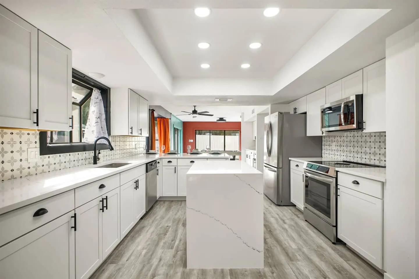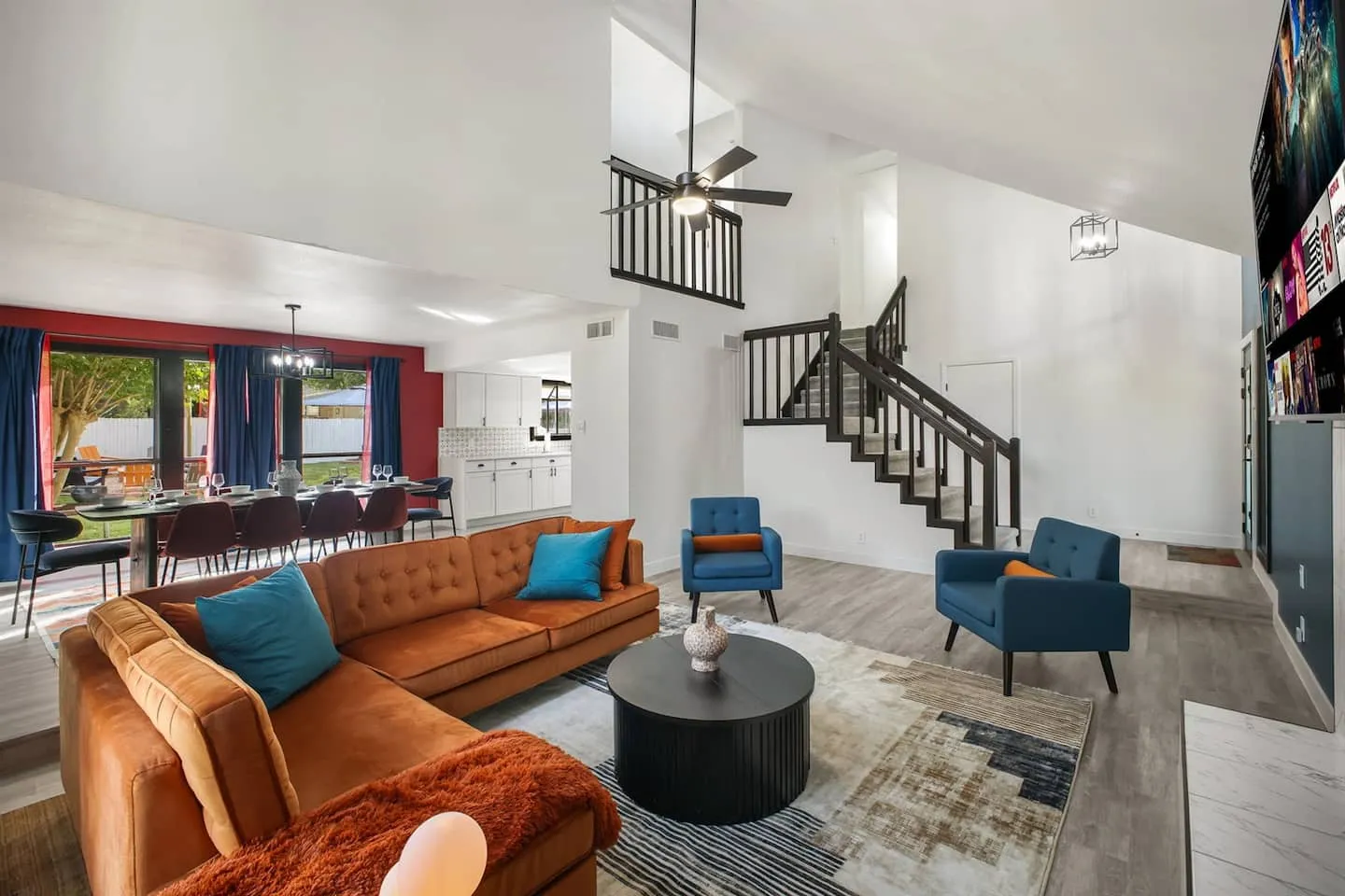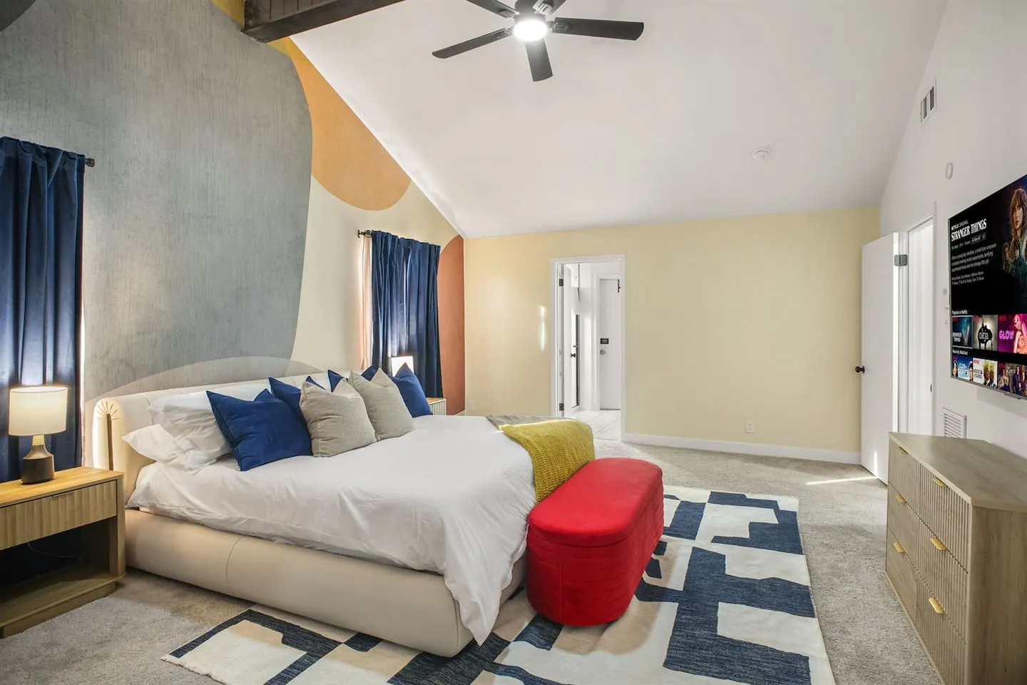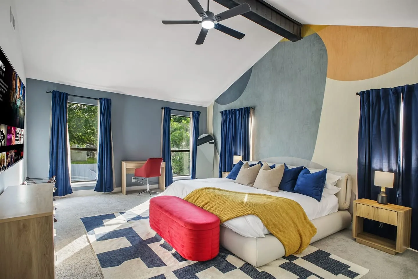 This San Antonio property demonstrates cohesive Modern Southwest design language achieving perfect 5.0-star rating across 6 reviews through comprehensive aesthetic strategy integrating bold earthy color palettes, desert-inspired accent walls, curated regional decor, and contemporary furnishings creating distinctive Southwestern identity. The design challenge centered on executing authentic regional character through material selections, color theory, and architectural detailing rather than superficial cowboy theming. Each of the five bedrooms receives individualized color treatment and decorative approach: the master bedroom establishes peaceful retreat through neutral tones with Southwestern art pieces, Bedroom 2 features bold accent walls creating dramatic color-blocked environment, Bedroom 3 provides cozy queen quarters with plush textiles, and Bedroom 4 showcases warm desert-inspired palette with custom sunburst mural plus "It's a vibe" neon sign installation creating Instagram-worthy focal wall. This bedroom differentiation strategy prevents anonymous hotel room monotony while establishing memorable spatial identities that guests reference in reviews and social media documentation.