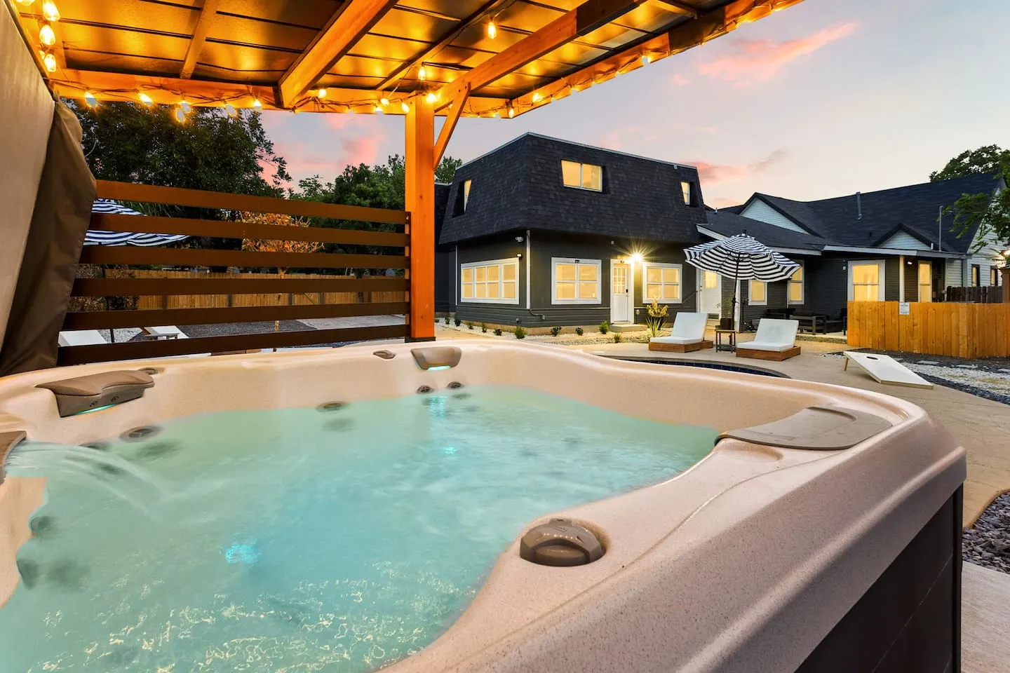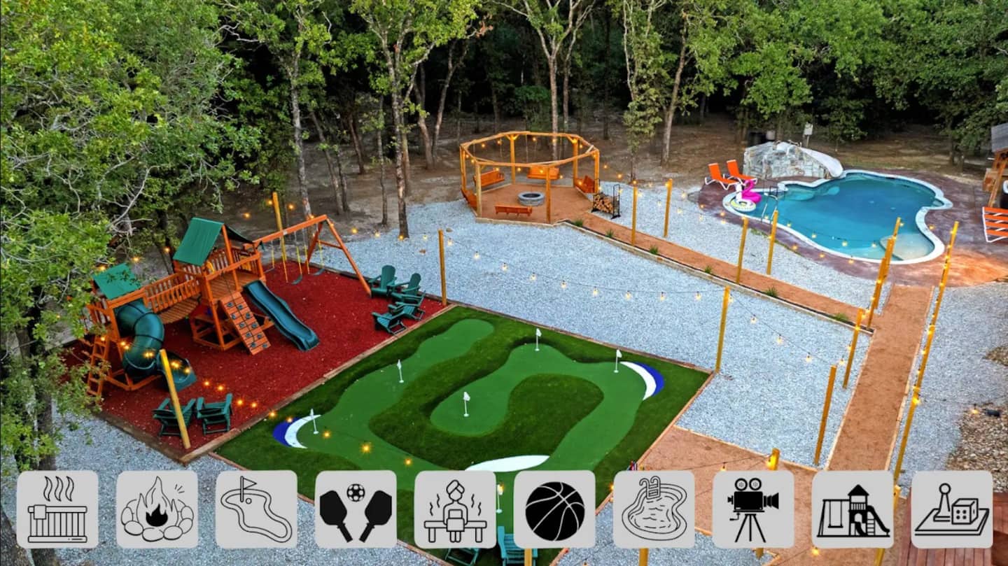 The Highland Park location provides 10-minute access to downtown San Antonio, River Walk, Pearl District, and The Alamo while maintaining residential neighborhood character. The limited walkable retail within immediate vicinity required transparent communication about transportation needs in listing materials. Photography documentation emphasized the 70-inch main television as entertainment centerpiece showing scale and viewing distances, game room composition capturing pool table with poker setup and bar installation, outdoor ping pong table demonstrating backyard recreation variety, illuminated pool and hot tub at dusk showcasing evening lighting design, fire pit arrangement with seating configuration, and bunk room styling appealing to younger demographics. Host Louis's service model including warm cookie delivery and rapid response times (100% response rate within one hour) elevates the guest experience beyond physical amenities. The perfect 5.0 rating across 28 reviews validates the multi-screen distribution strategy, consolidated game room design, climate-responsive indoor-outdoor programming, and flexible sleeping configurations serving family reunions, military graduation celebrations, and multi-generational group getaways in the Highland Park neighborhood.