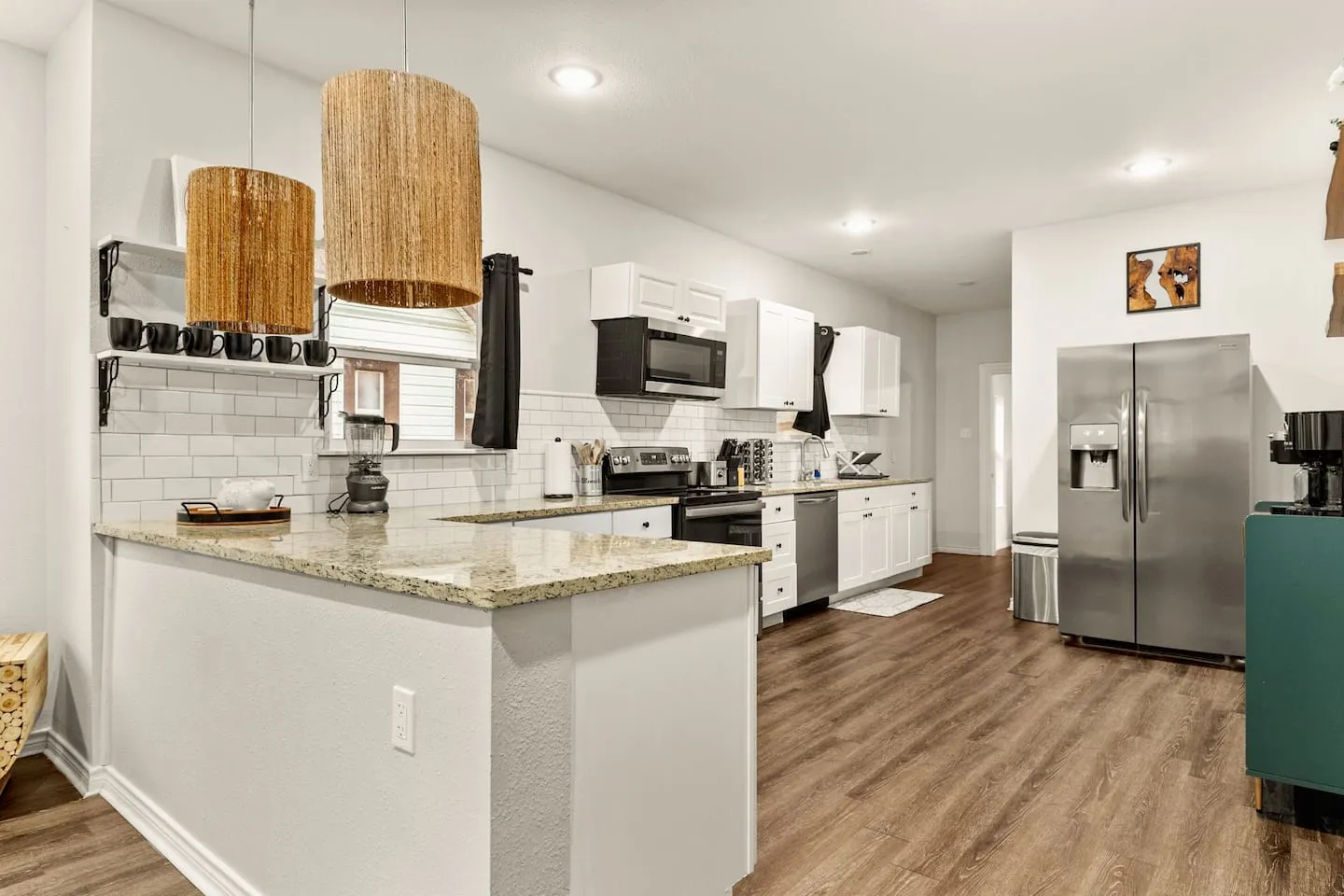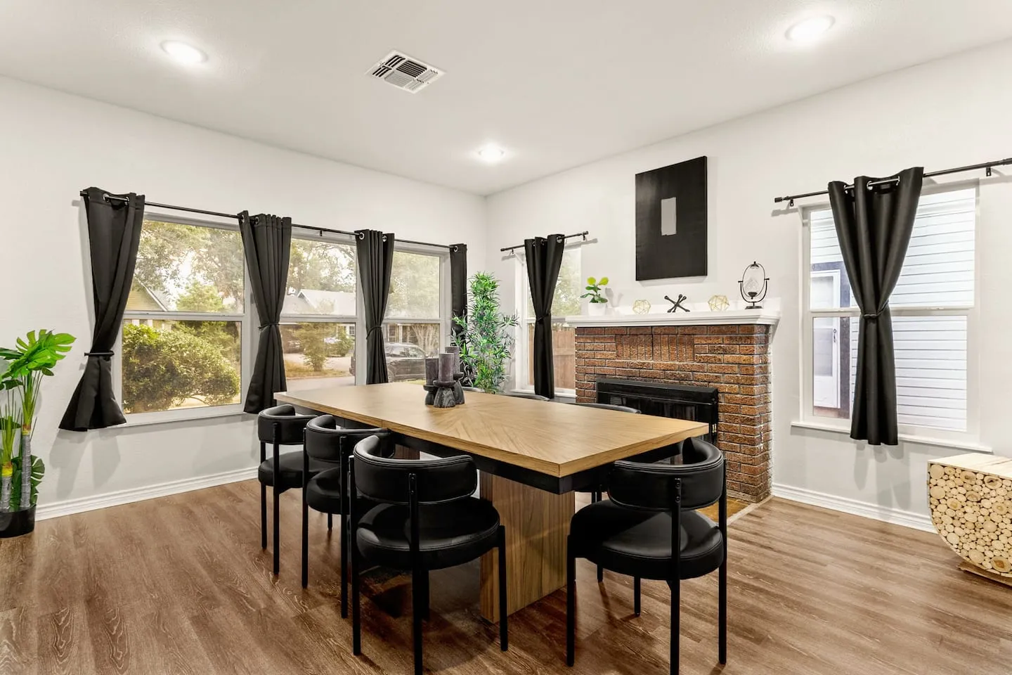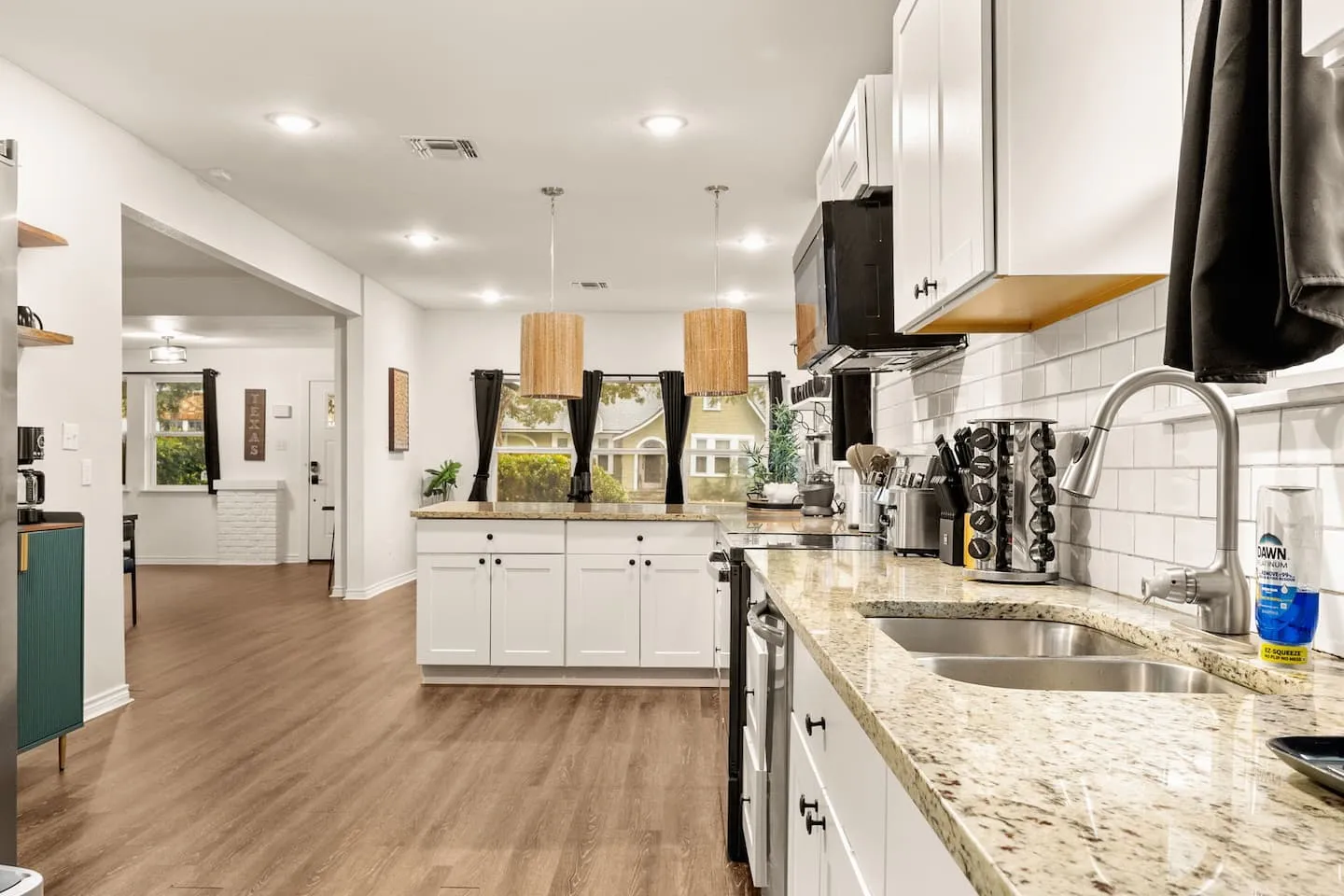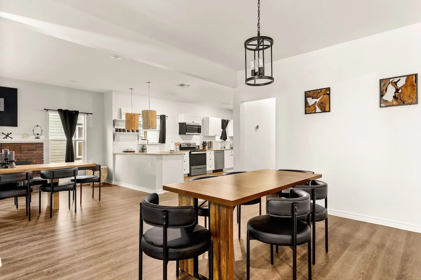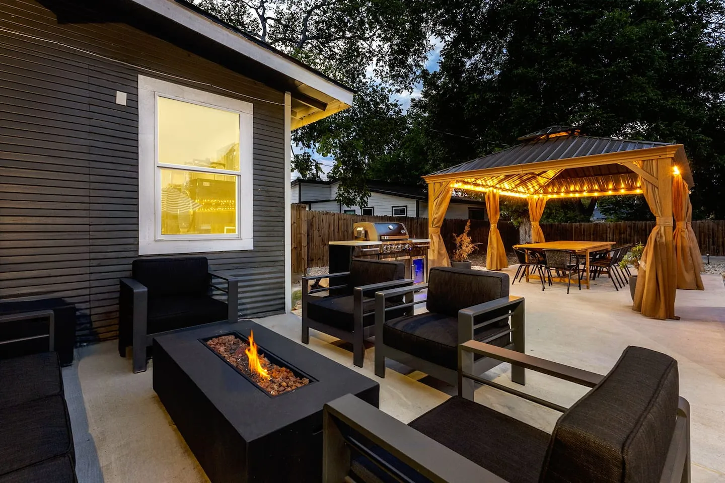 The kitchen design features open-concept layout with integrated bar seating transitioning to adjacent large dining area, creating flexible capacity for 12-plus seated dining. Equipment inventory includes both Keurig and drip coffee systems, comprehensive cookware and bakeware, spice collection, and complete utensil sets supporting extended-stay meal preparation. The outdoor programming leverages Texas climate through year-round heated pool and hot tub operation. Evening illumination extends swimming beyond daylight hours, treating the pool as functional space rather than daytime-only amenity. The covered outdoor dining area with integrated grill provides weather protection from afternoon sun and sudden thunderstorms while enabling al fresco meals. The fire pit with surrounding seating creates gathering focal point during cooler months, while the fully-fenced yard establishes privacy boundaries and security perimeter. The outdoor TV installation completes the indoor-outdoor entertainment flow, allowing seamless transitions between climate zones without sacrificing programming access.