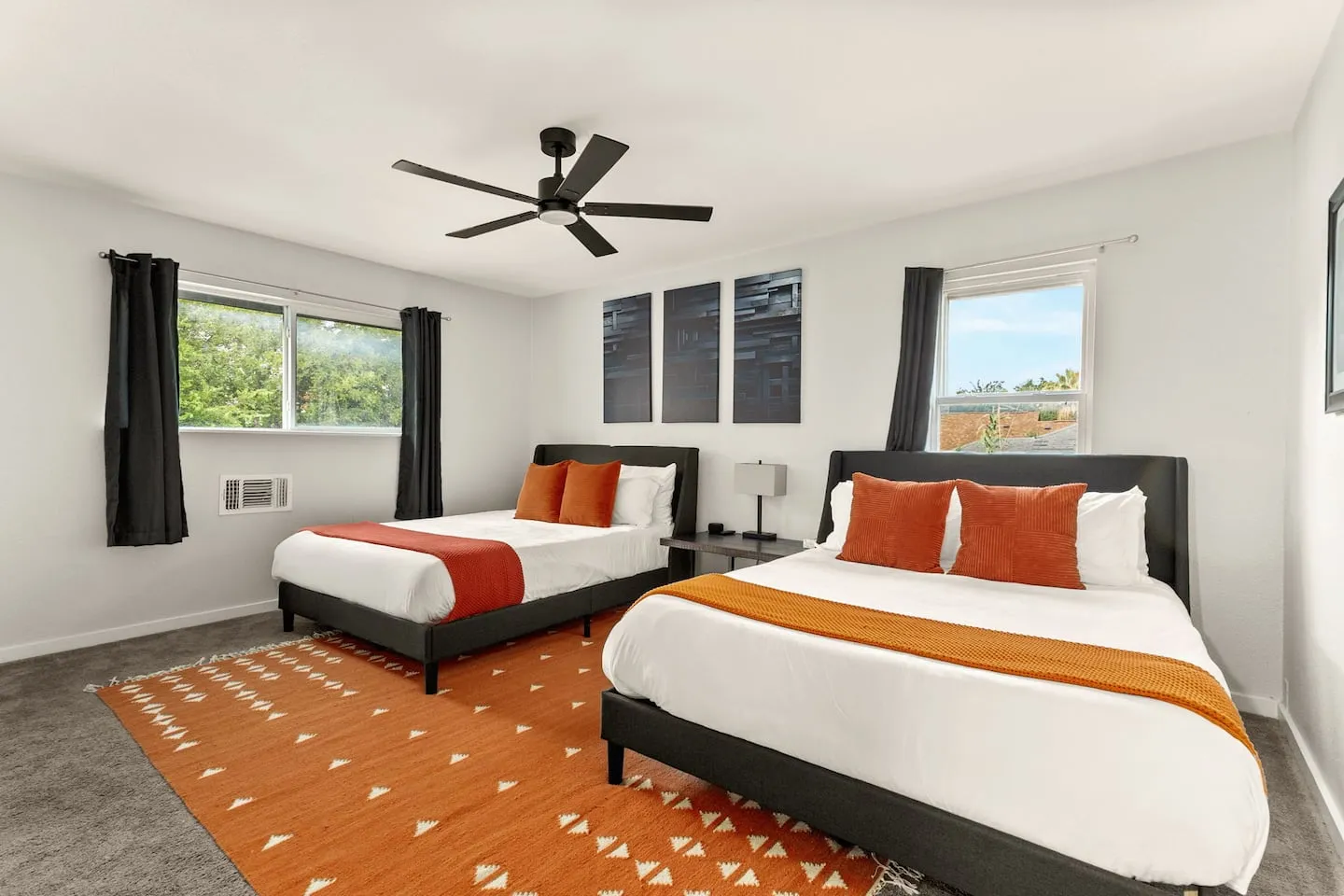The bedroom configuration employs varied bed types to optimize capacity and appeal across guest demographics. Two king bedrooms establish luxury sleeping accommodating adult couples or primary guests expecting hotel-quality rest. The dual-queen bedroom maximizes occupancy for families or friend groups traveling together. The dedicated bunk room with twin-over-twin configurations serves children and teenagers while creating intentional social sleeping atmosphere that younger guests prefer. All bedrooms receive hotel-quality linens and blackout curtains addressing sleep quality through material selection and complete light control. The crib and Pack 'n Play availability demonstrates inclusive planning for families with infants. The 2.5-bathroom distribution strategically places full bathrooms across both levels, while the main-floor half-bath provides convenient guest powder room during gatherings, preventing upstairs bedroom bathroom intrusion.