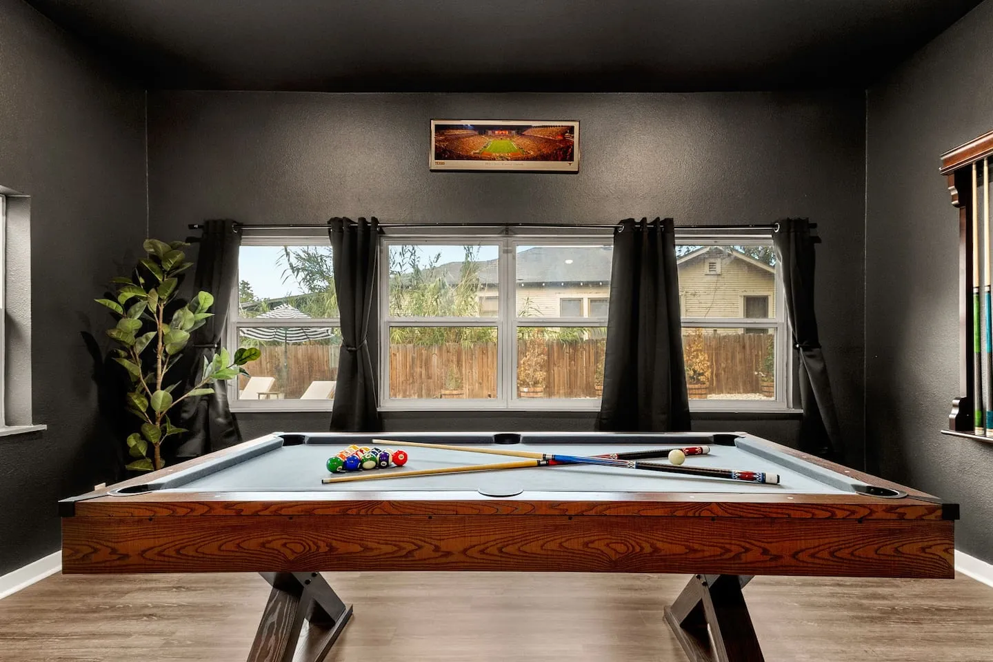 The game room represents consolidated entertainment zoning, concentrating multiple activity modes within a single dedicated space rather than dispersing them throughout the home. The room houses regulation pool table, poker table with complete card supplies, extensive board game library, and indoor bar installation creating cohesive adult social environment. The smart TV within this space provides ambient entertainment during gameplay without dominating the room's interactive focus. This consolidation strategy prevents equipment sprawl while establishing clear spatial hierarchy between active game play zones and passive relaxation areas. The outdoor ping pong table extends competitive recreation to the backyard, creating temperature-responsive entertainment options. Texas summers routinely exceed 100°F during afternoons, making climate-controlled indoor gaming essential, while mornings and evenings provide comfortable outdoor play temperatures. This dual-zone approach recognizes that poker benefits from air conditioning and focused lighting, while ping pong thrives in open-air casual settings.