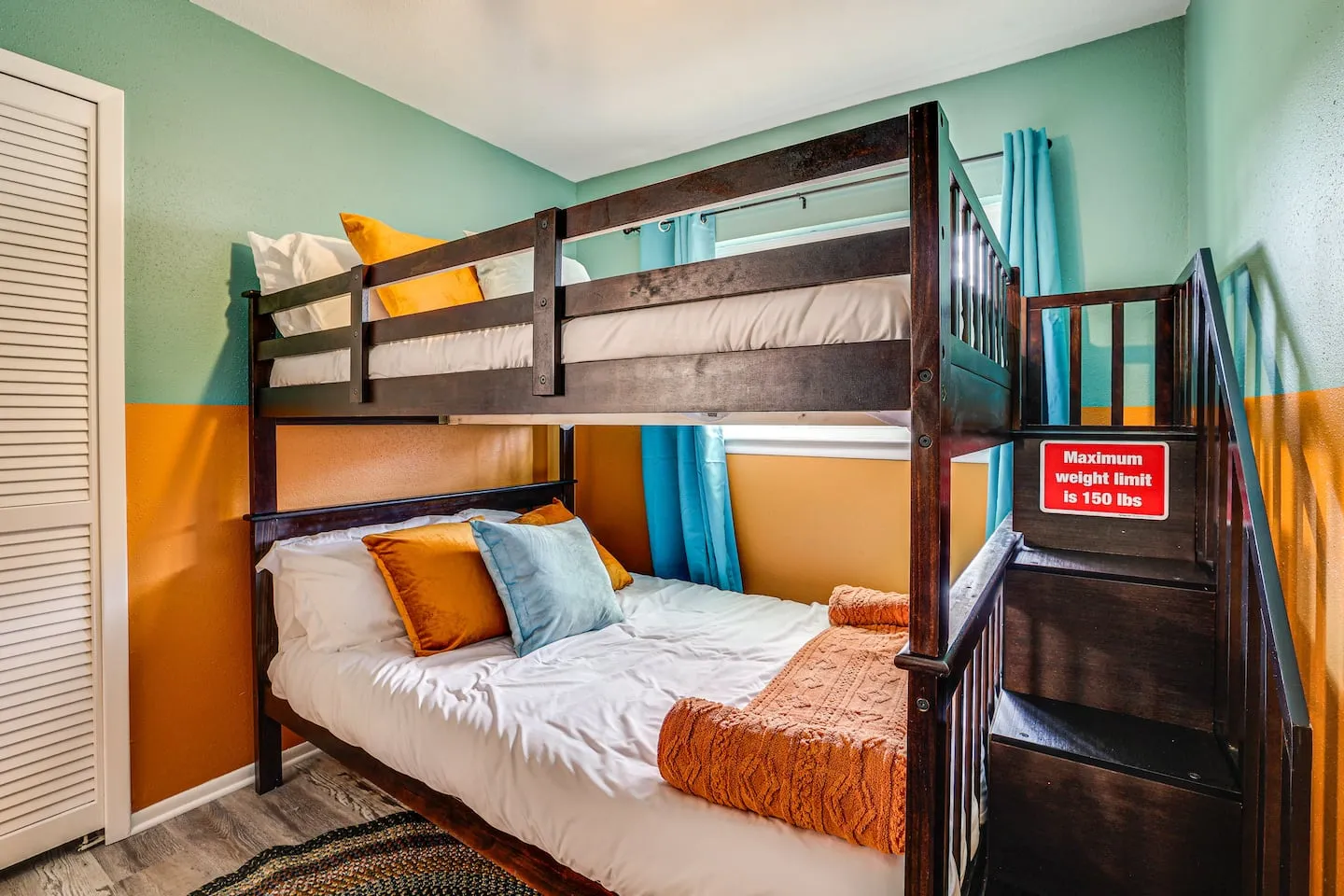 The bedroom configuration employs varied bed types optimizing capacity and appeal. The king bed in Bedroom 1 establishes primary sleeping quarters for adult couples. Bedroom 2's full bunk bed accommodates two guests with the critical 150-pound top bunk weight limit requiring clear guest communication preventing safety violations or structural damage from adult occupancy. Bedroom 3 with dual queen beds maximizes sleeping capacity for families or adult groups, while Bedroom 4's single queen provides flexible accommodation. The portable crib availability demonstrates family-friendly planning eliminating airline baggage burden of traveling with infant equipment. The two-bathroom distribution serving 12 guests creates modest ratio requiring schedule coordination during peak morning hours, though the single-story layout ensures both bathrooms remain easily accessible from all bedrooms.