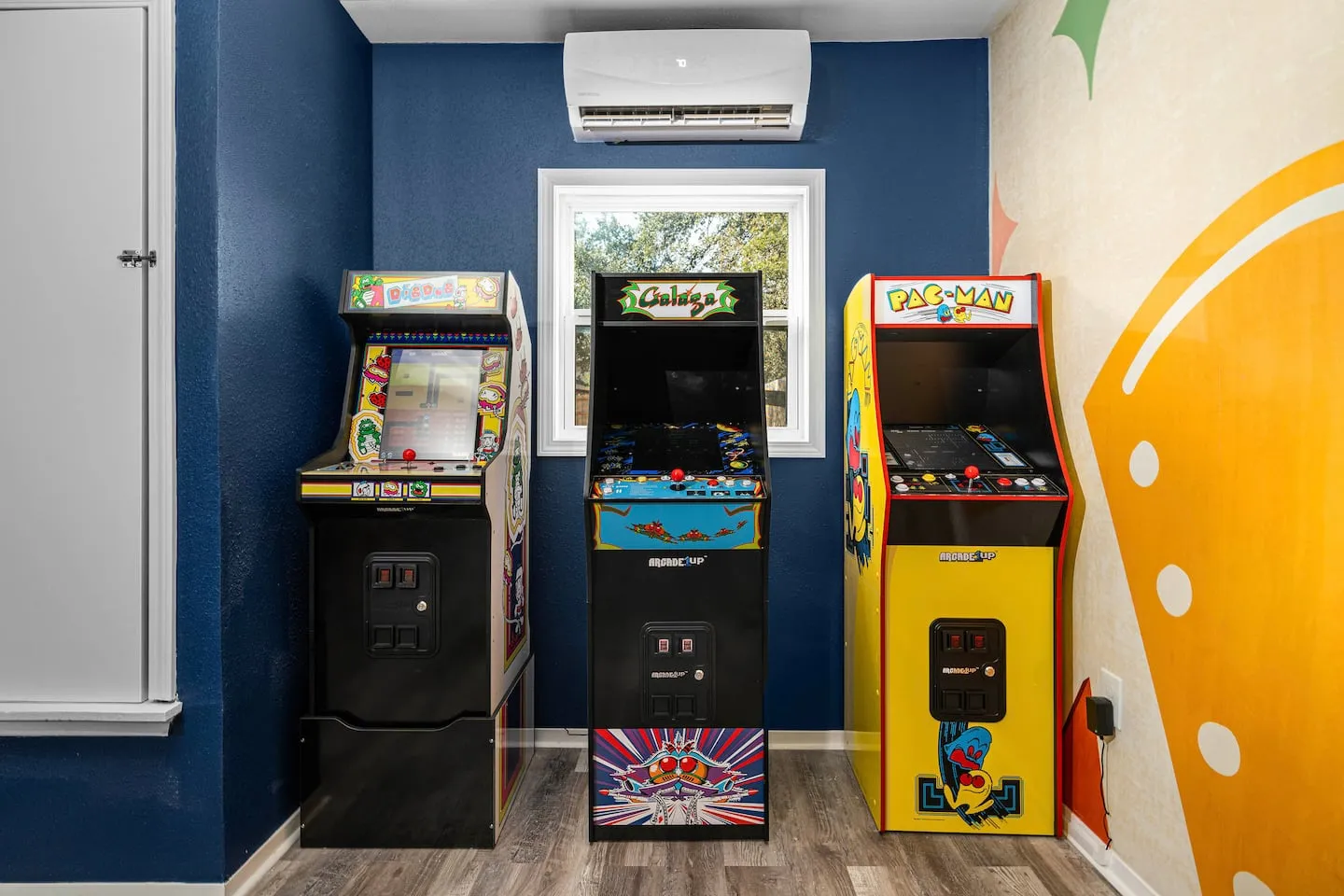 The consolidated game room demonstrates space-efficient entertainment zoning integrating pool table, ping-pong table, arcade machines, and board game storage within single dedicated space. This consolidation strategy addresses the spatial challenge of single-story floor plans where horizontal room addition consumes valuable lot area compared to vertical stacking in two-story configurations. The room layout required careful furniture positioning ensuring 19-by-10-foot ping-pong clearance envelope while maintaining pool table access and arcade machine placement plus board game storage. The dual table sports represent cost-effective entertainment diversity, with pool and ping-pong appealing to different skill levels and competitive intensities. The arcade machine installations provide electronic entertainment options, while board game collection enables low-tech family activities. The game room positioning likely connects to main living areas maintaining visual supervision of children while enabling adult conversation in adjacent spaces without complete isolation.