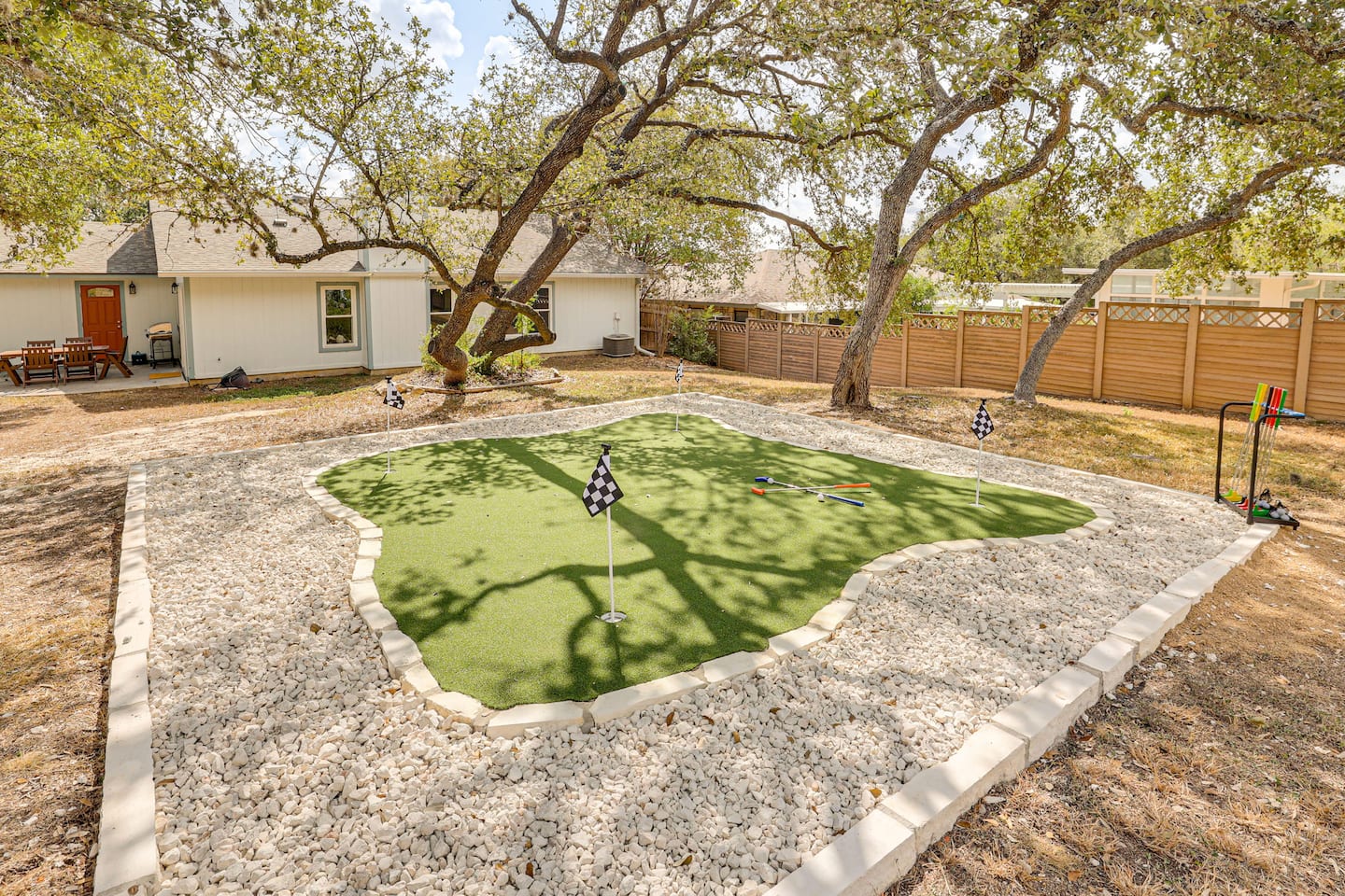 Photography documentation emphasized the backyard mini golf course showing multiple holes with obstacles and fenced perimeter visible, game room interior with pool table, ping-pong setup, and arcade machines demonstrating consolidated entertainment, fire pit area with Adirondack chair arrangement and string lighting creating evening ambiance, fully-fenced backyard showing security and pet containment, smart TV installations in bedrooms, gas fireplace as living room focal point, and eye-catching interior design referenced in listing descriptions. Evolve's property management provides professional hosting infrastructure with 100% response rate, though the company's portfolio-wide 4.73 rating across 19,102 reviews suggests variable property quality compared to individual owner-operators. The perfect 5.0 rating from initial guest specifically praising the owner's work creating fun and comfortable environment validates the single-story accessibility strategy, consolidated game room efficiency, backyard mini golf installation, and strategic Lackland Air Force Base proximity serving military families, multi-generational groups seeking accessible single-level living, and travelers prioritizing SeaWorld access in San Antonio's residential neighborhoods.