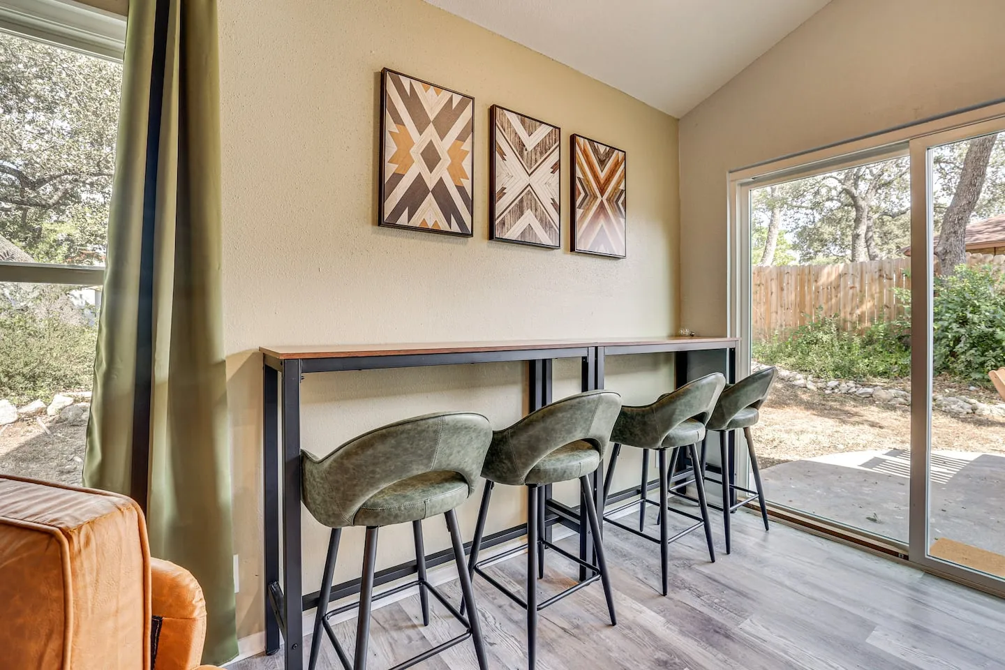 The smart TV distribution throughout the property installing screens in all four bedrooms plus main living areas prevents viewing conflicts common during group stays where families compete for single shared television. This multi-screen infrastructure enables simultaneous programming across age groups and interest preferences, with bedroom TVs allowing parents to settle children with appropriate content while adults continue evening activities in main living areas. The gas fireplace installation provides architectural focal point and supplementary heating during San Antonio's mild winters when overnight temperatures occasionally drop into 40s making fireplace ambiance desirable without requiring full central heating operation. The dining configuration includes formal dining room plus bar-height table and high chair provision, creating flexible meal service capacity across different formality levels and accommodating families with infants.