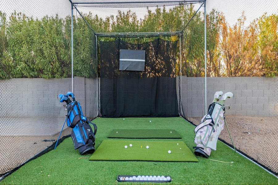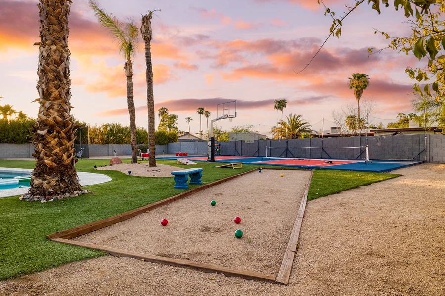 The outdoor design maximizes the Arizona climate through a resort-style pool and expansive patio system with covered and exposed zones. The backyard functions as a multi-sport complex featuring a regulation sports court equipped for basketball and pickleball, a dedicated putting green with practice cage for golf training, and lawn game areas for bocce ball, cornhole, and oversized cup pong. These elements required careful site planning to ensure proper drainage, equipment storage solutions, and lighting design for evening use. The hot tub and fire pit anchor separate gathering zones that provide quieter alternatives to the active recreation areas.