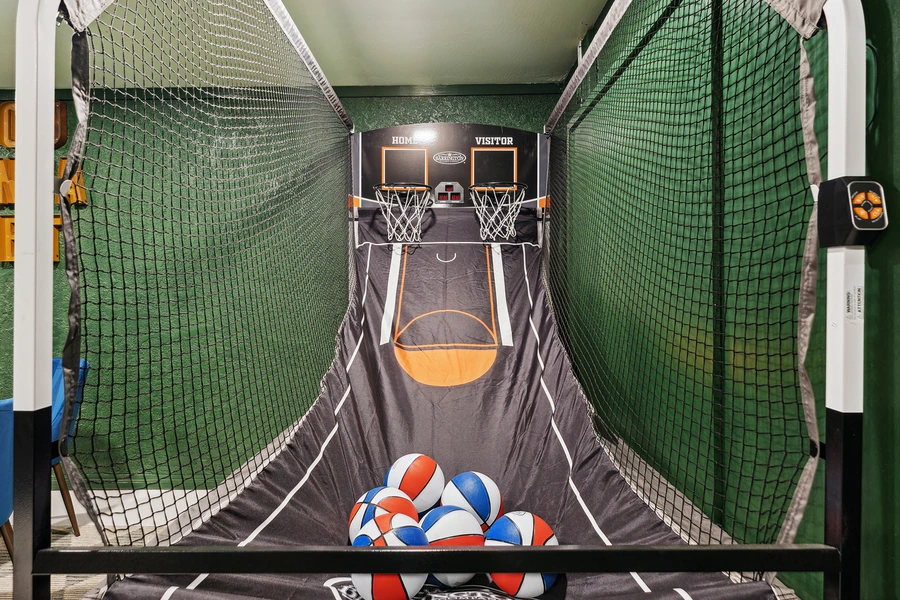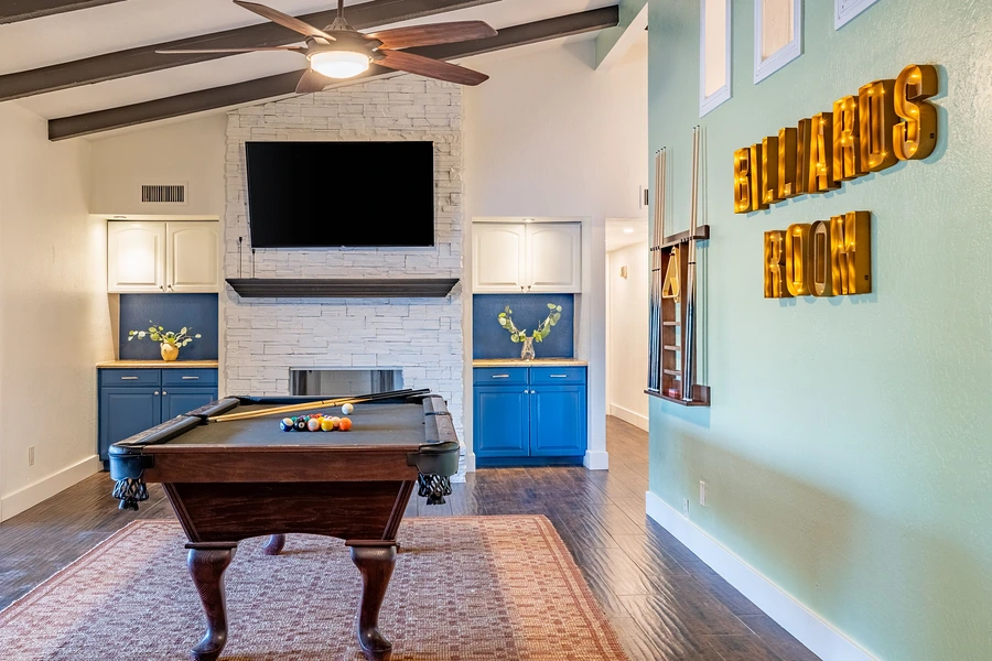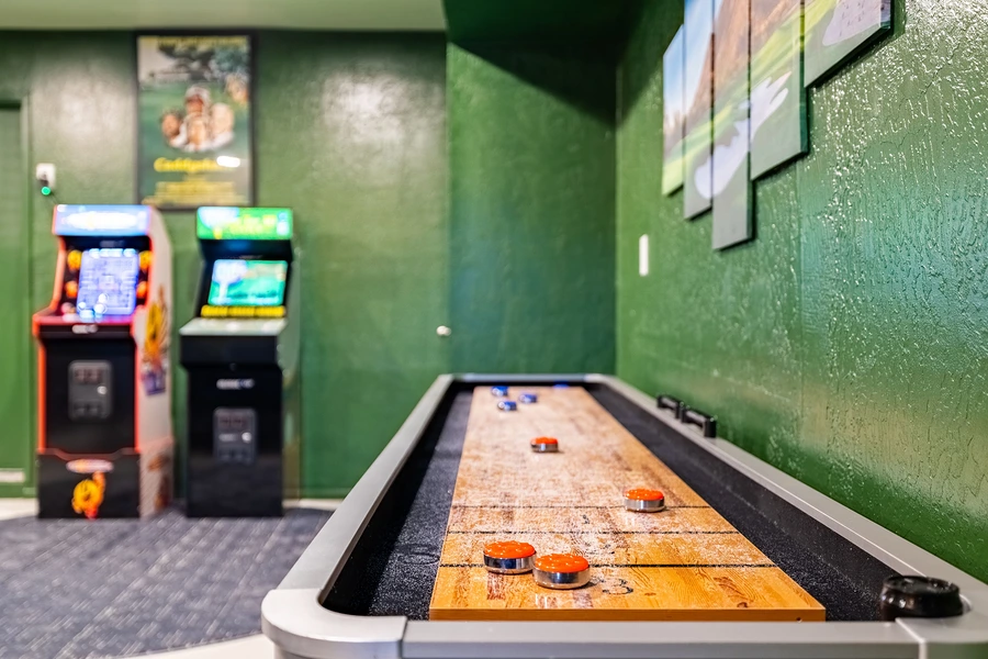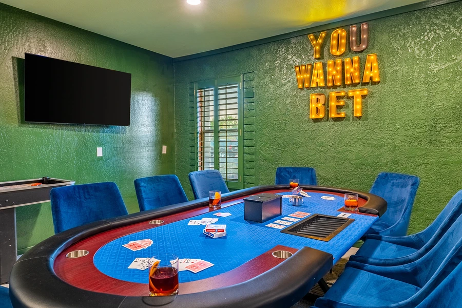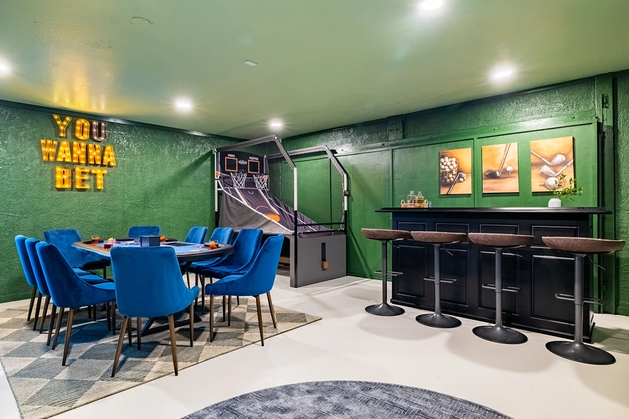 The standout design element is the speakeasy-themed game room, which houses a curated collection of entertainment options including poker table, shuffleboard, arcade games, basketball shootout, billiards, and a custom sports bar setup. This space required specialized considerations for equipment placement, traffic flow during peak use, and electrical infrastructure to support multiple gaming stations. The living area features built-in massage chair integration and AV systems designed for group viewing. Material selections throughout emphasize durability for high-traffic scenarios while maintaining residential warmth through layered textures and Arizona-appropriate color palettes.
