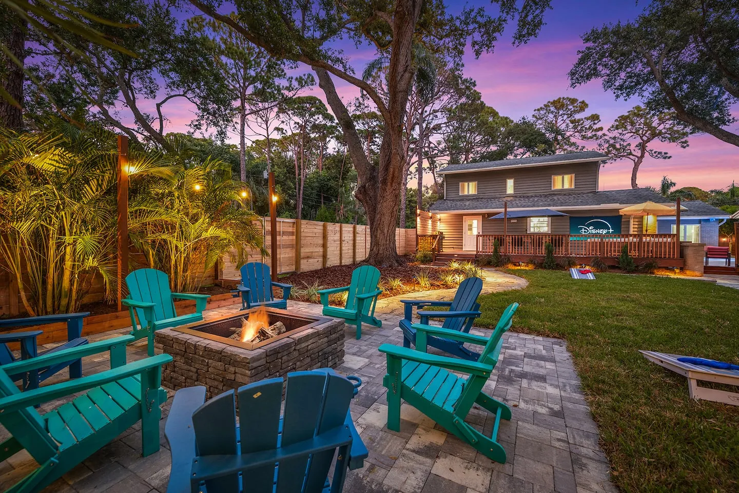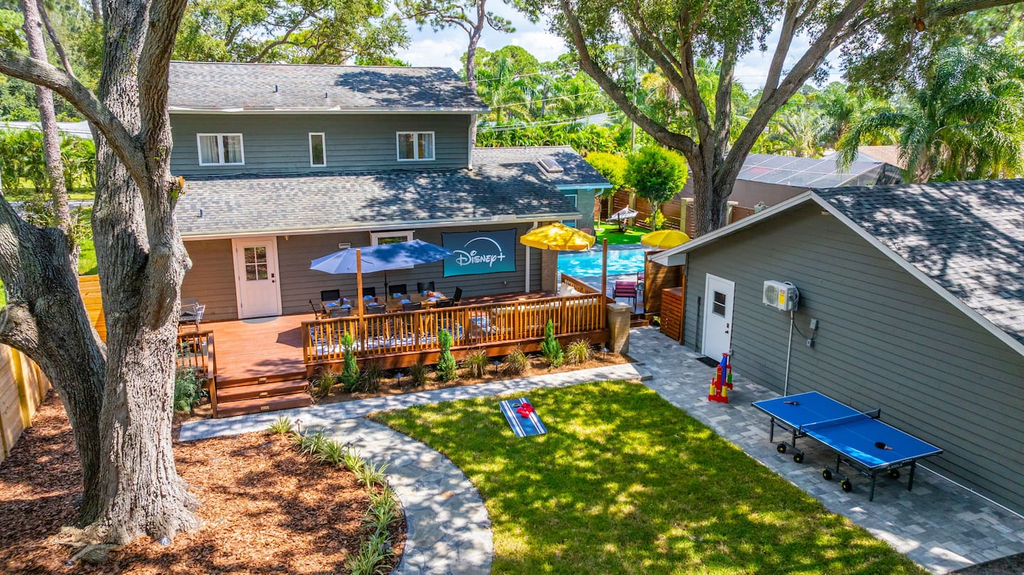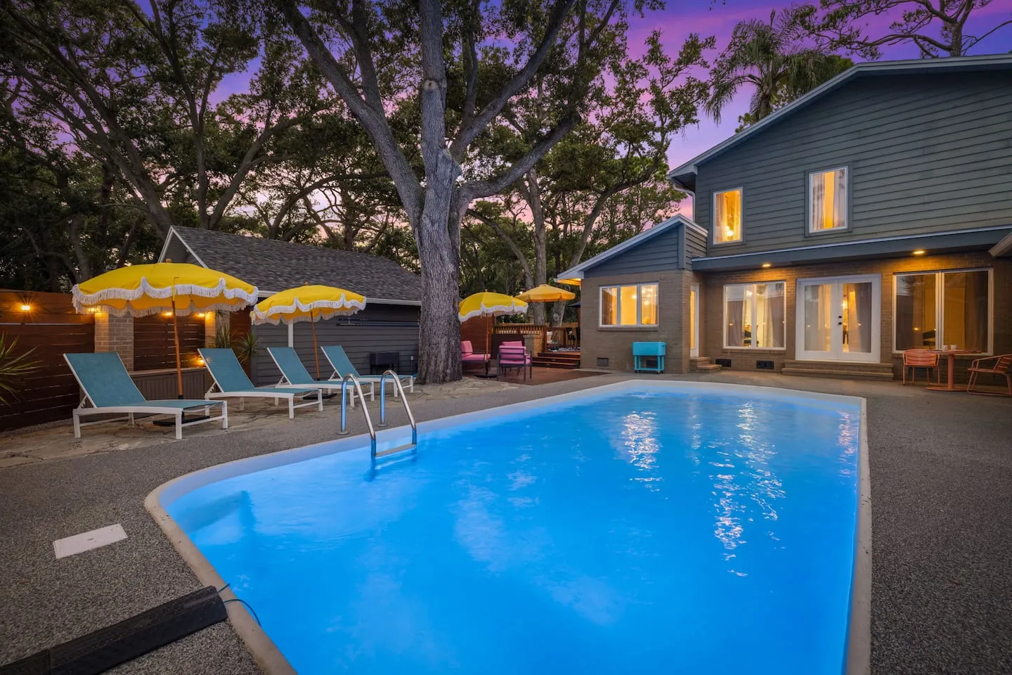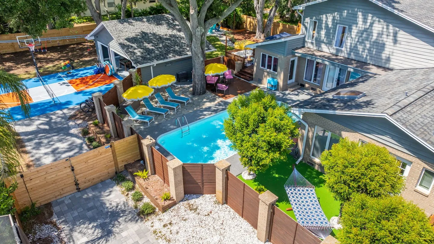 This 3,000-square-foot Seminole property demonstrates integrated landscape design achieving perfect 5.0-star rating and Top 10% designation through strategic siting within mature oak and pine canopy creating immersive forest ambiance just one mile from award-winning Gulf Coast beaches. The design challenge centered on embracing rather than clearing the established tree canopy, requiring careful pool placement, deck configuration, and building orientation to work within existing root zones and driplines while maximizing the shade benefits during Florida summers. The mature oaks provide natural cooling reducing afternoon heat island effect common in cleared lots, with the trade-off being seasonal leaf management addressed through twice-weekly professional service plus state-of-the-art robotic pool skimmer enabling guests to maintain pristine water between service visits. This transparent approach to the leaf reality demonstrates honest property management, with provided leaf blowers keeping seating and dining areas tidy. Guest reviews consistently reference the peaceful, secluded forest atmosphere as highlight, validating the landscape preservation strategy over conventional clear-and-replant approaches.