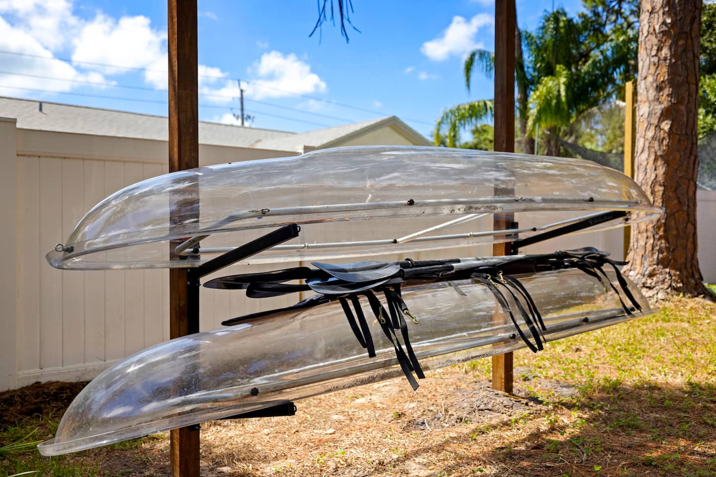 The comprehensive beach equipment integration addresses the tactical challenge of storing, accessing, and transporting recreation gear. The property provides four beach cruiser bicycles enabling seven-minute rides to Indian Shores Beach, two see-through kayaks with transparent hulls for viewing marine life in Florida's clear coastal waters, and two inflatable stand-up paddleboards. This equipment inventory requires dedicated storage protecting from UV degradation and weather while maintaining easy guest access. The see-through kayak selection represents intentional equipment specification rather than standard opaque models, transforming paddling from pure recreation into marine education opportunity where guests observe sea grass beds, fish schools, and bottom features typically hidden. The cushioned roof racks mentioned in reviews demonstrate attention to transportation logistics, preventing kayak damage during vehicle mounting. The corner lot location on non-through street reduces traffic concerns for bicycle departures and returns, with the one-mile beach distance representing optimal balance between proximity and residential tranquility.