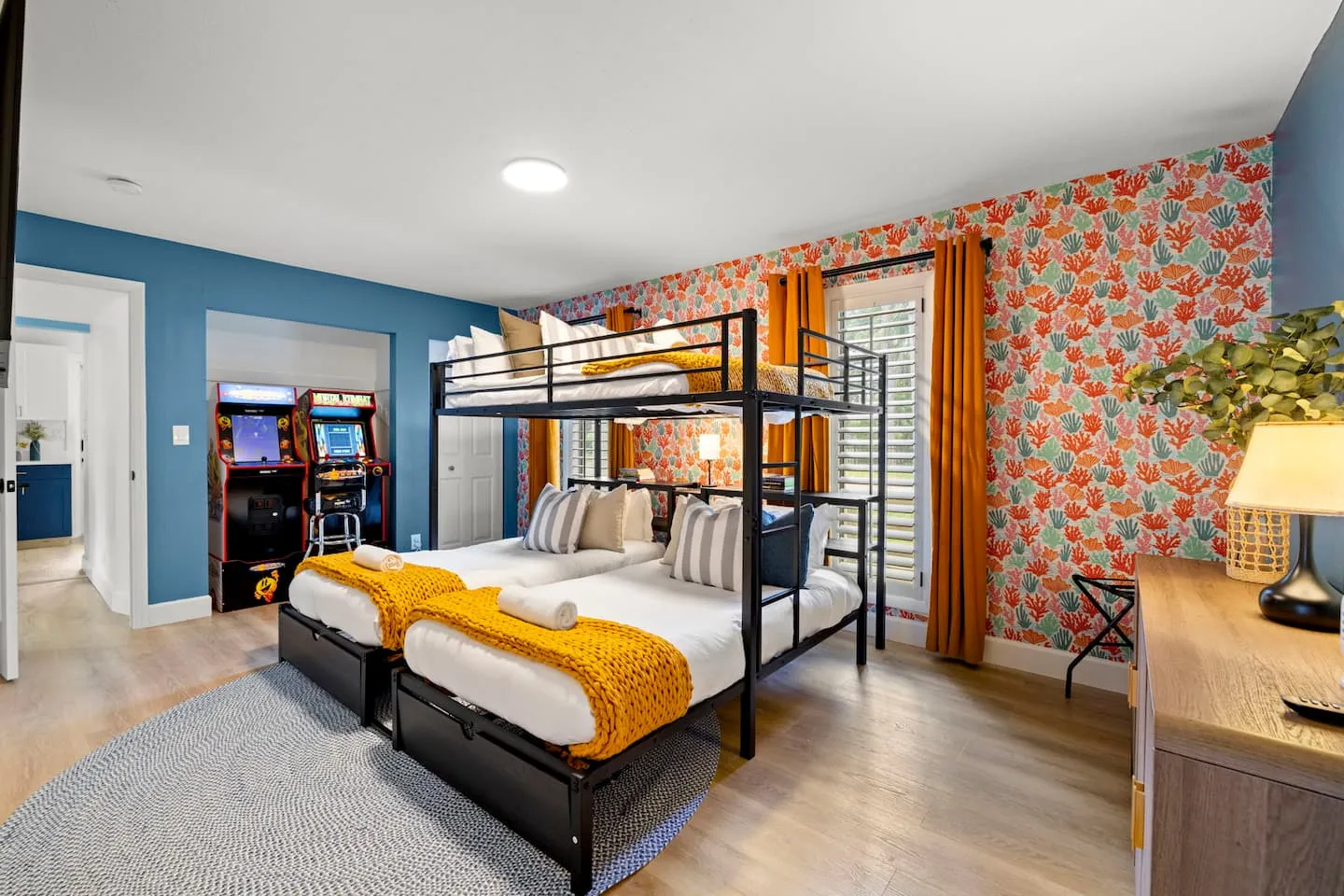 The vertical spatial programming distributes functions across two levels with intentional separation between primary guest accommodations and supplementary sleeping quarters. The first floor consolidates essential living including primary suite with direct pool access through sliding doors creating indoor-outdoor flow, dedicated bunk room serving families with children, main living room, gourmet kitchen, and dining areas. This ground-level configuration ensures complete accessibility for guests avoiding stairs or families with young children requiring convenient supervision. The primary suite pool access represents luxury amenity enabling early morning swims or late evening soaks without traversing common areas. The upstairs placement of three additional bedrooms with newly updated bathroom creates secondary sleeping zone, useful for multi-family groups wanting proximity but separation, or adult children and teenagers seeking independence from parents' first-floor primary suite. The newly updated upstairs bathroom demonstrates phased renovation strategy where high-impact spaces receive modernization prioritization.